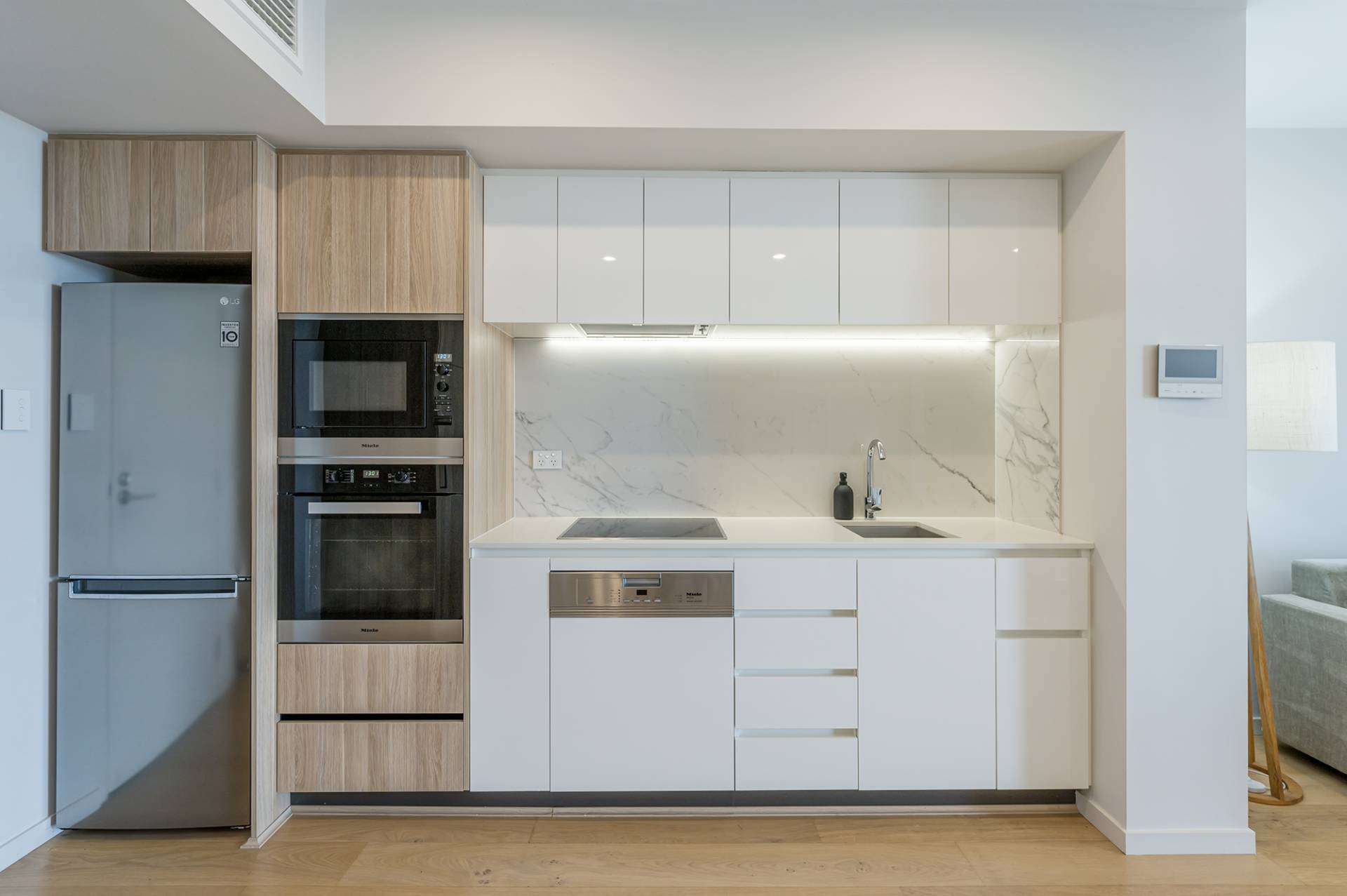 Marvel at the million-dollar views from your sleek, contemporary kitchen, which includes engineered stone benchtops, dreamy soft-closing cabinetry a fridge/freezer recess. Top of the range Miele appliances include an integrated dishwasher and microwave, induction cooktop and conventional wall oven and a marble splashback complete this space beautifully.