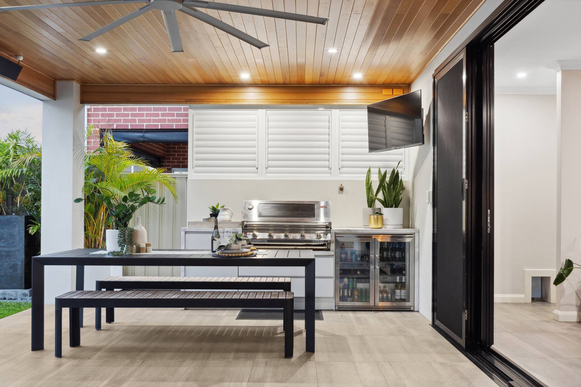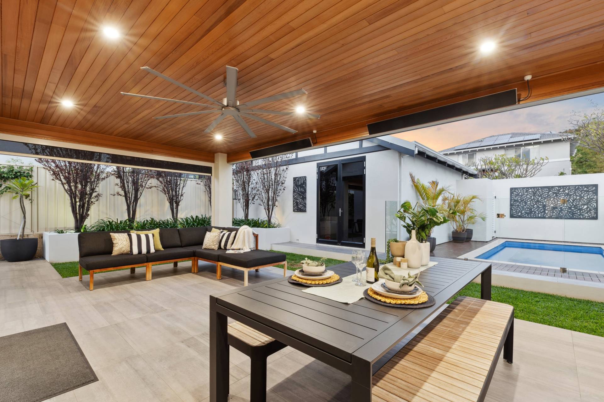• Stunning cedar wood ceiling with quality light fixtures and fittings outside