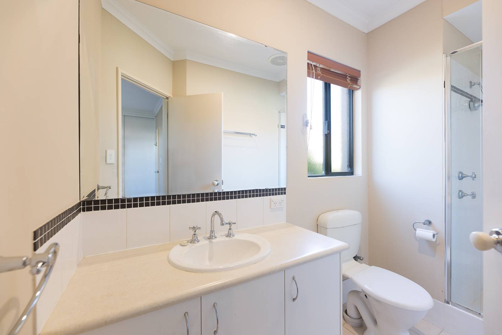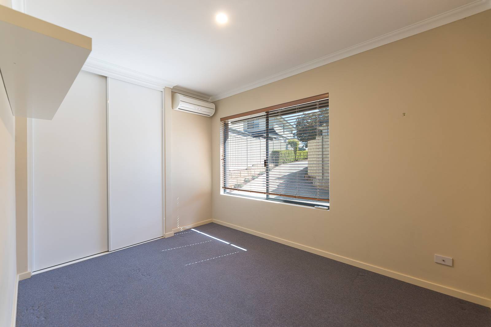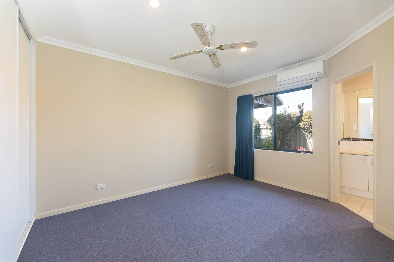 • Luxurious Master Suite: Spacious master bedroom with ceiling fan, split system air conditioning, large window with blockout blinds, and triple sliding built-in robes. The ensuite boasts a tiled shower, single vanity, large mirror, and toilet.