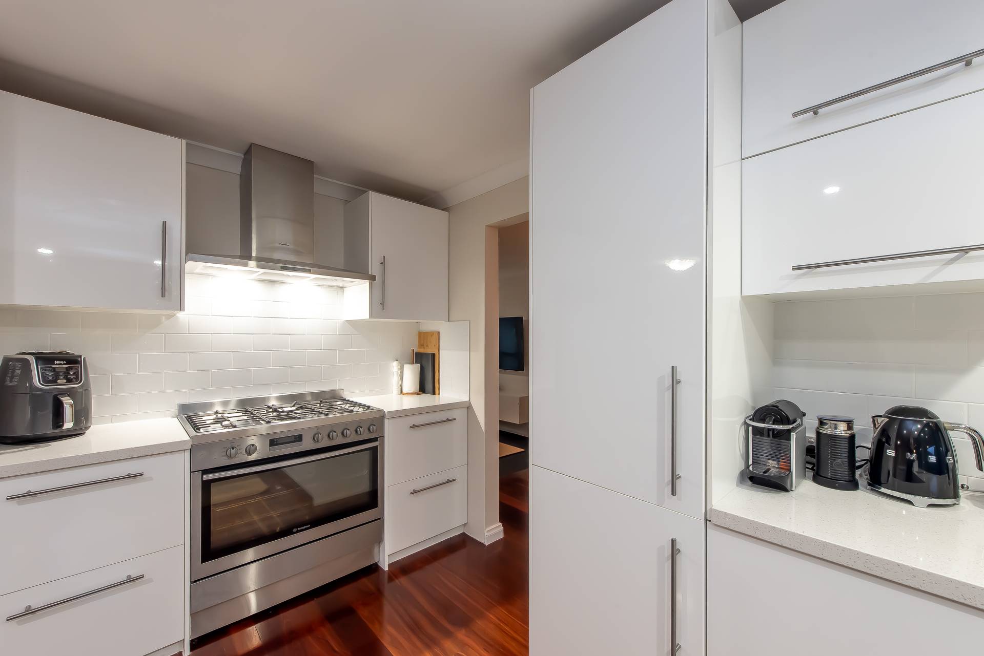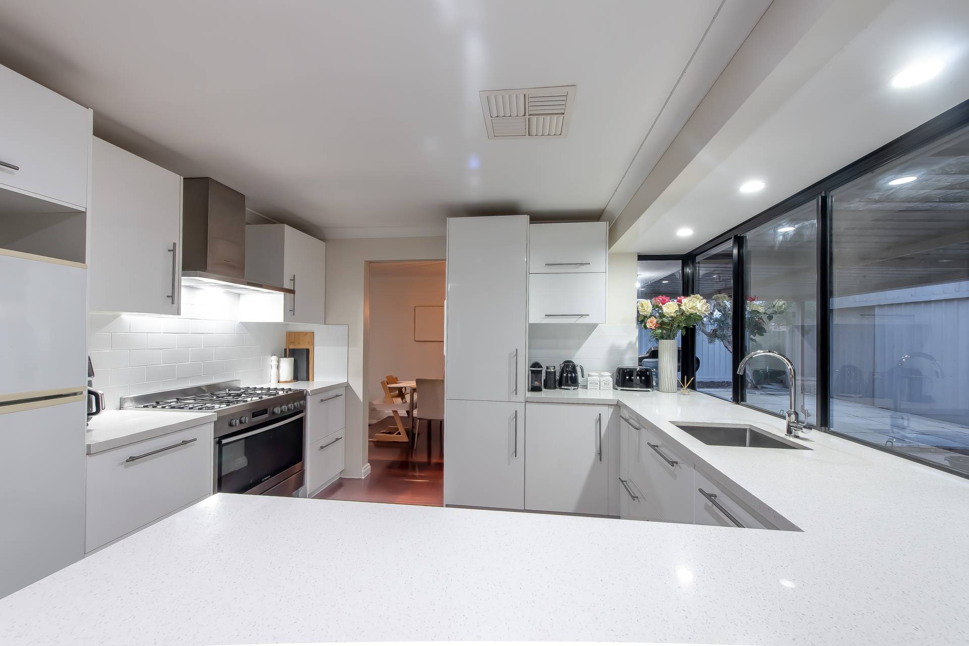 • Gourmet Kitchen: Chef's delight with stone benchtops, breakfast bar, sleek white cabinetry, and quality stainless-steel appliances (900mm oven & gas cooktop).