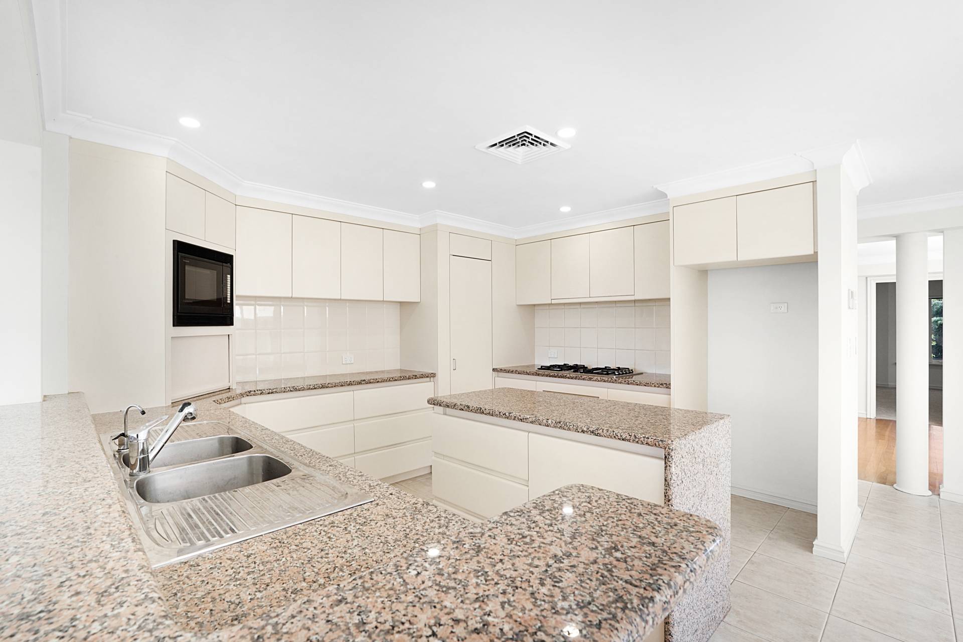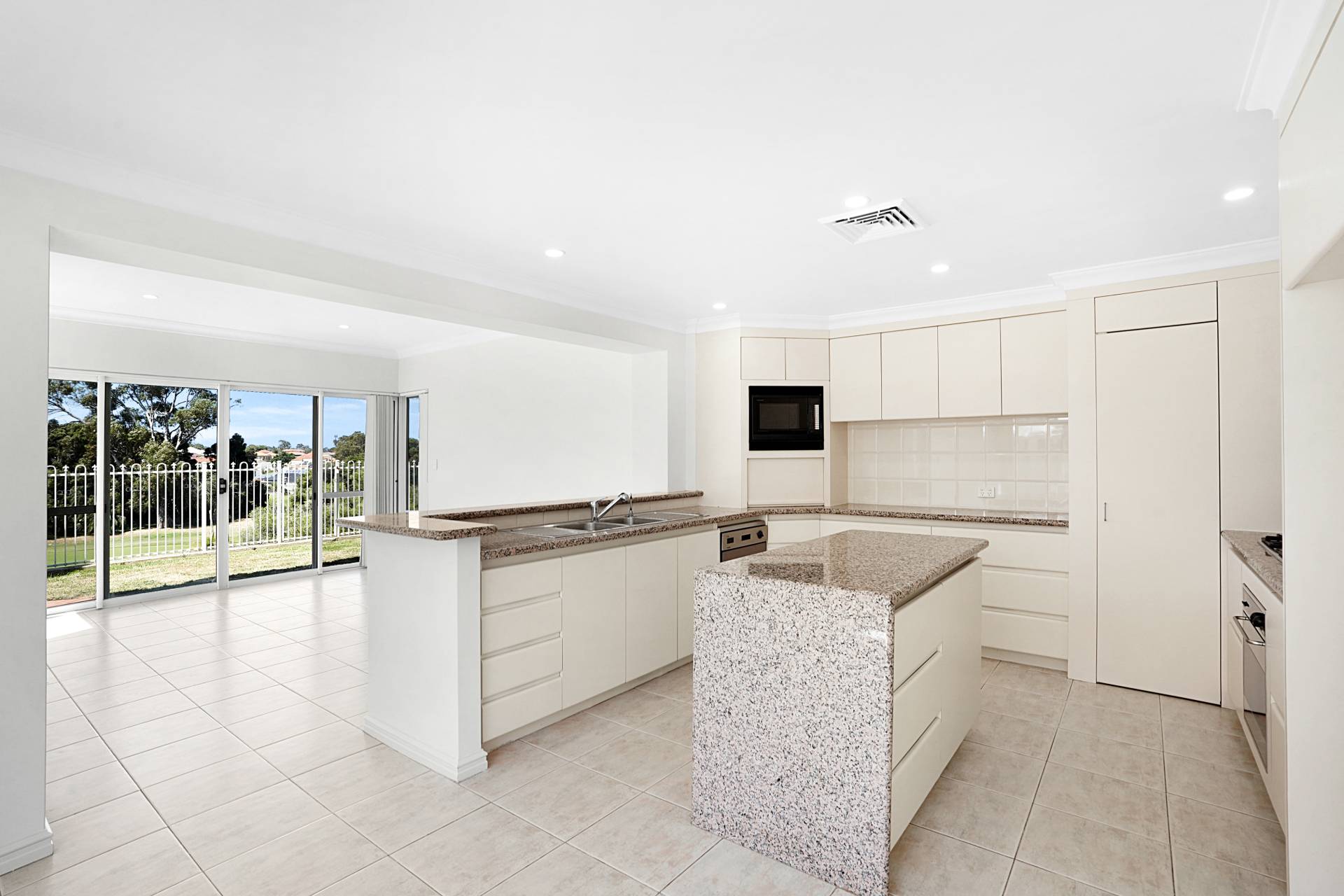 - Kitchen includes a dishwasher recess, fridge recess, gas cooktop with hidden rangehood, built in microwave, under bench oven, double sink, plenty of storage with overhead cabinetry and finished off with stone waterfall benchtops