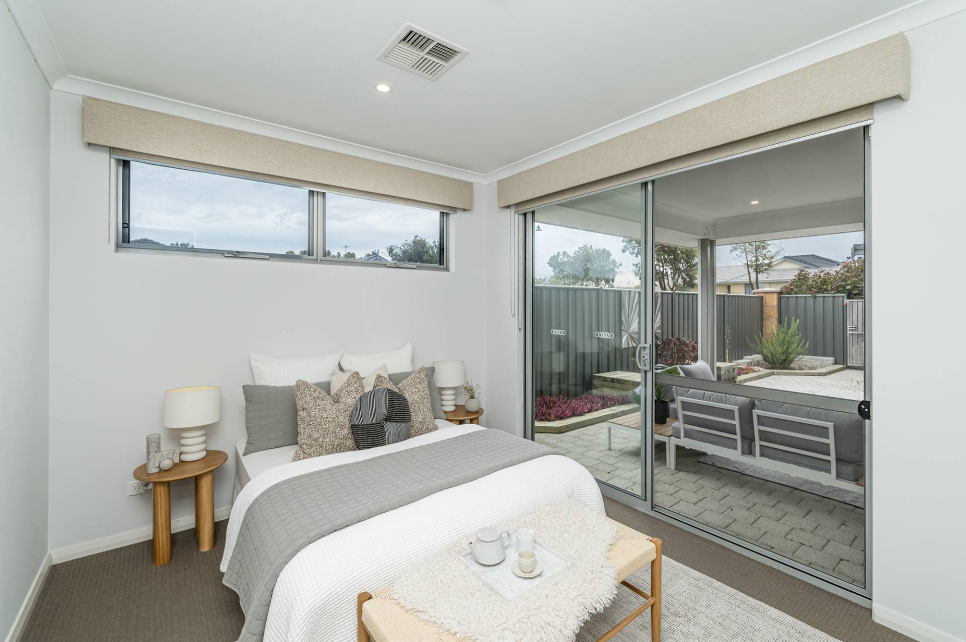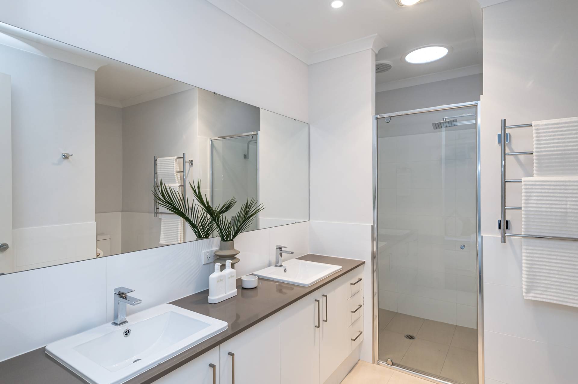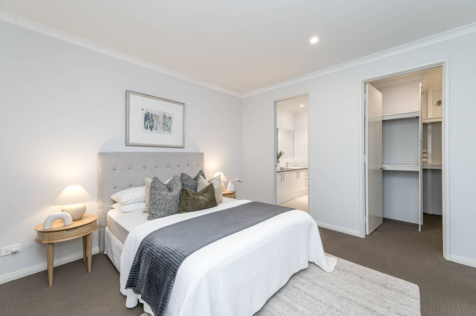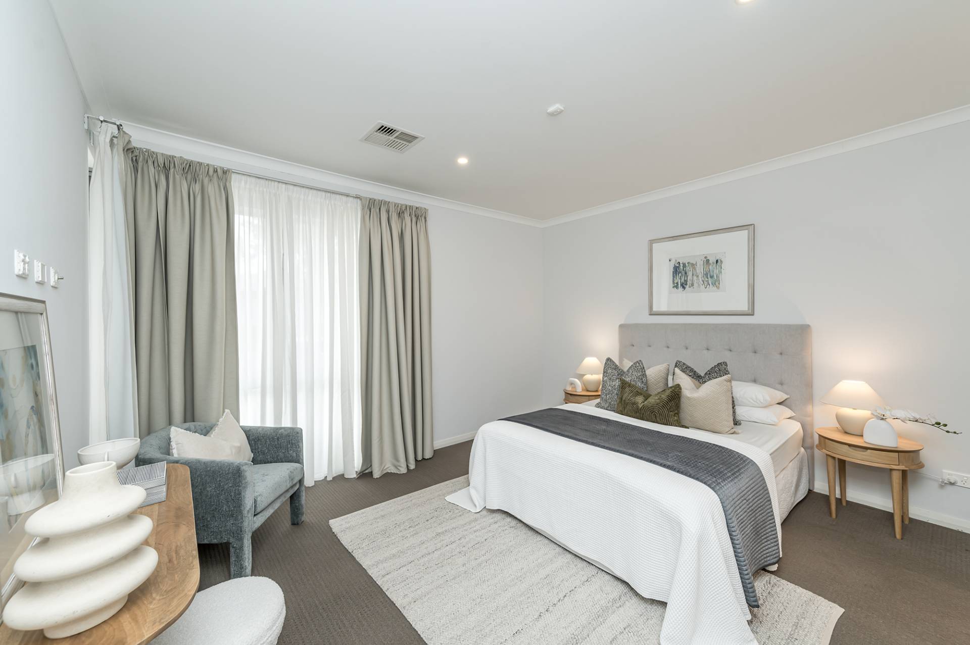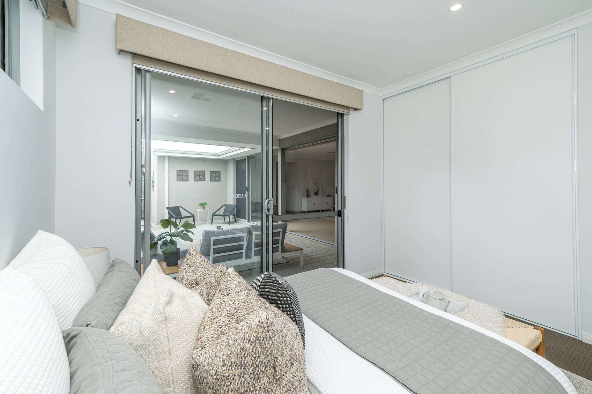 The generous master bedroom is bathed in natural light and includes built-in robes with shelves, drawers and hanging space, as well as a high-spec ensuite with a double vanity. French doors open from the master bedroom to the courtyard - a perfect spot for morning coffee to your start your day.