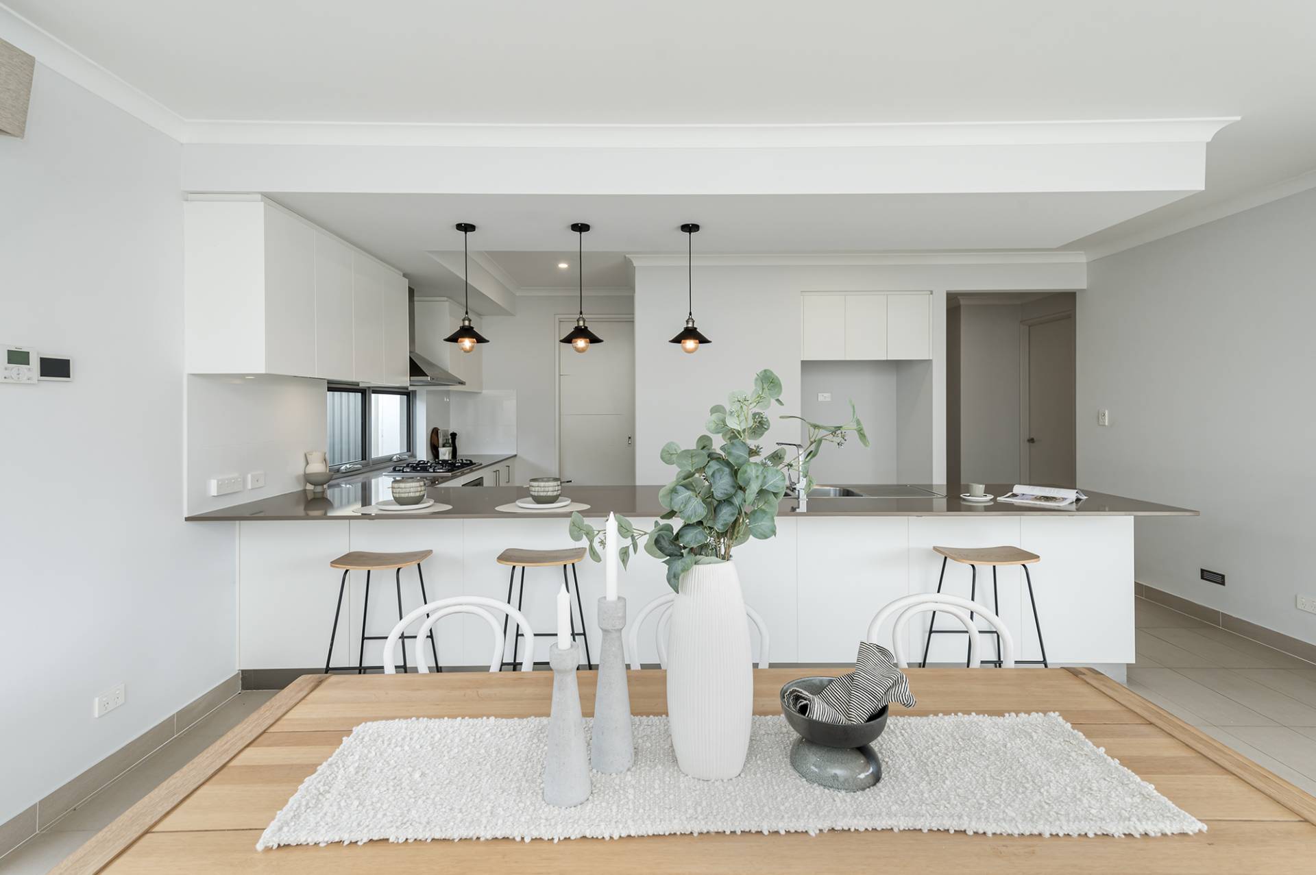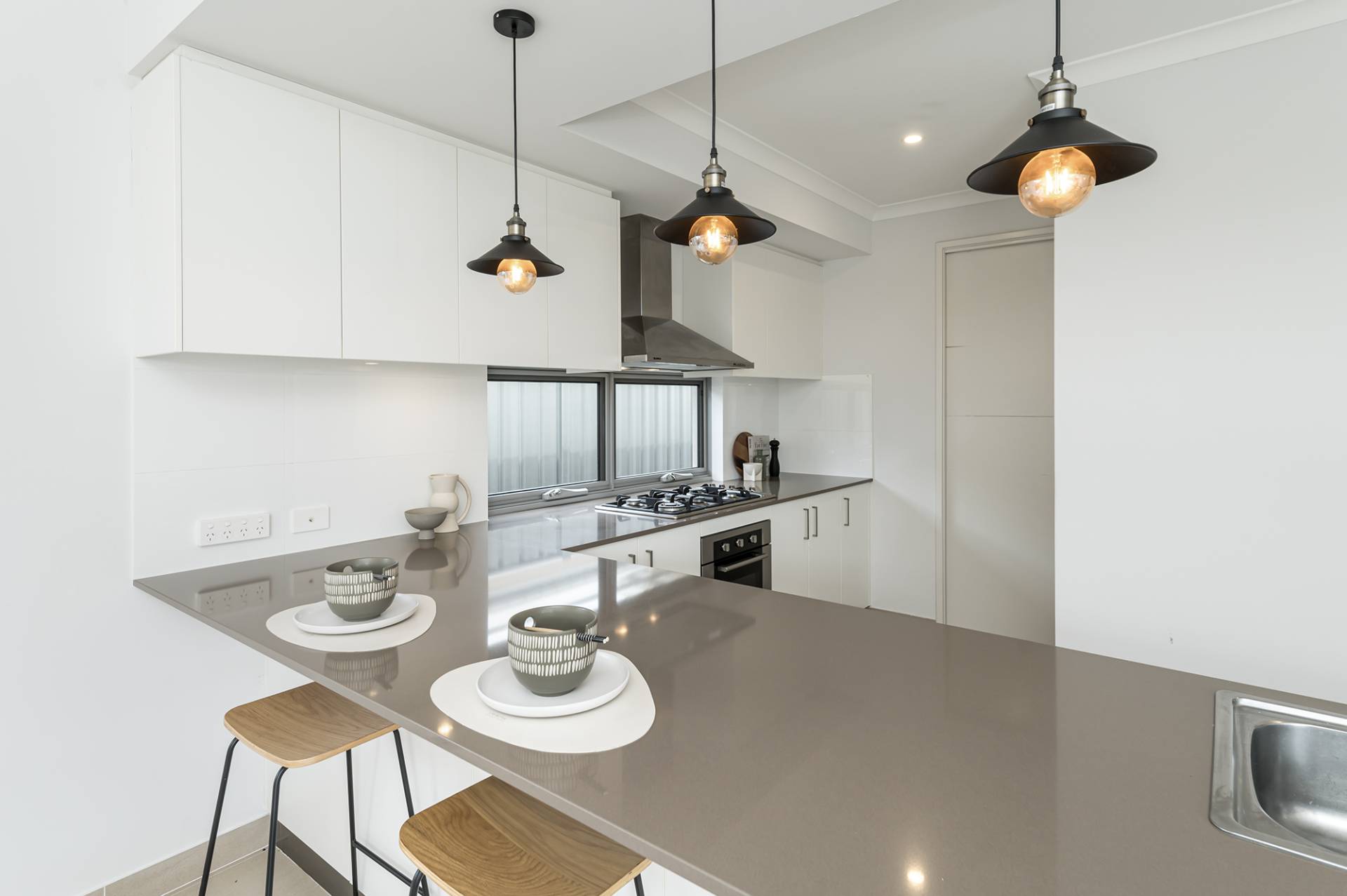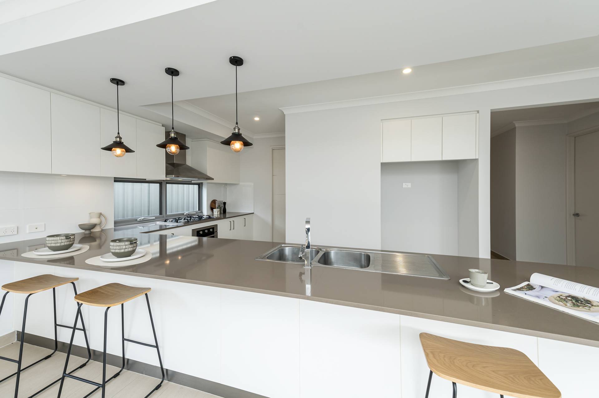 The immaculate kitchen boasts elegant benchtops, statement pendant lights, ample storage and a practical layout with a breakfast bar ideal for casual mealtimes and conversation.