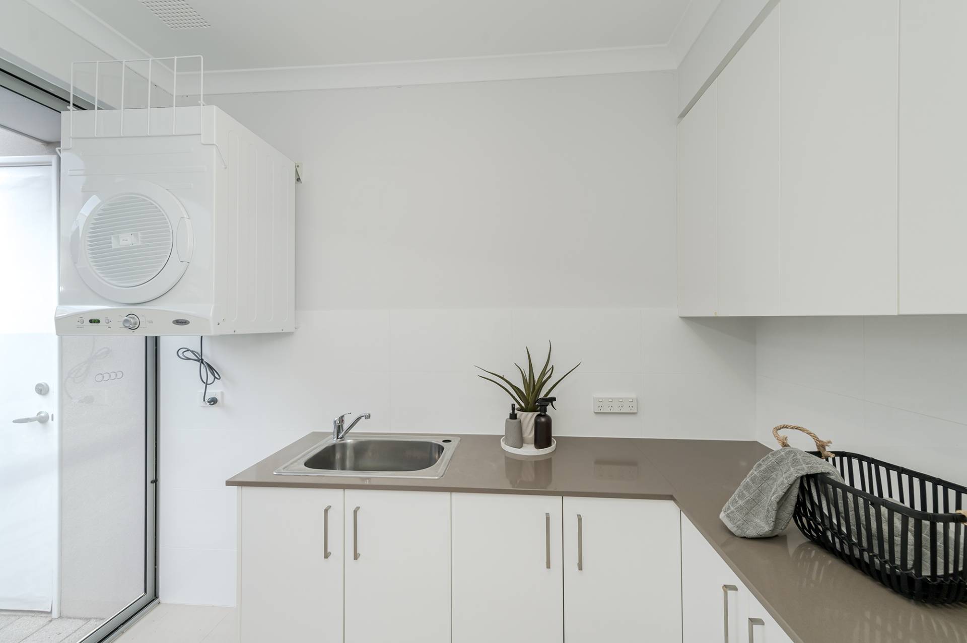 Practical Spaces The bright, well-finished laundry with pristine benchtops and tiles adds to the home's stylish functionality.
