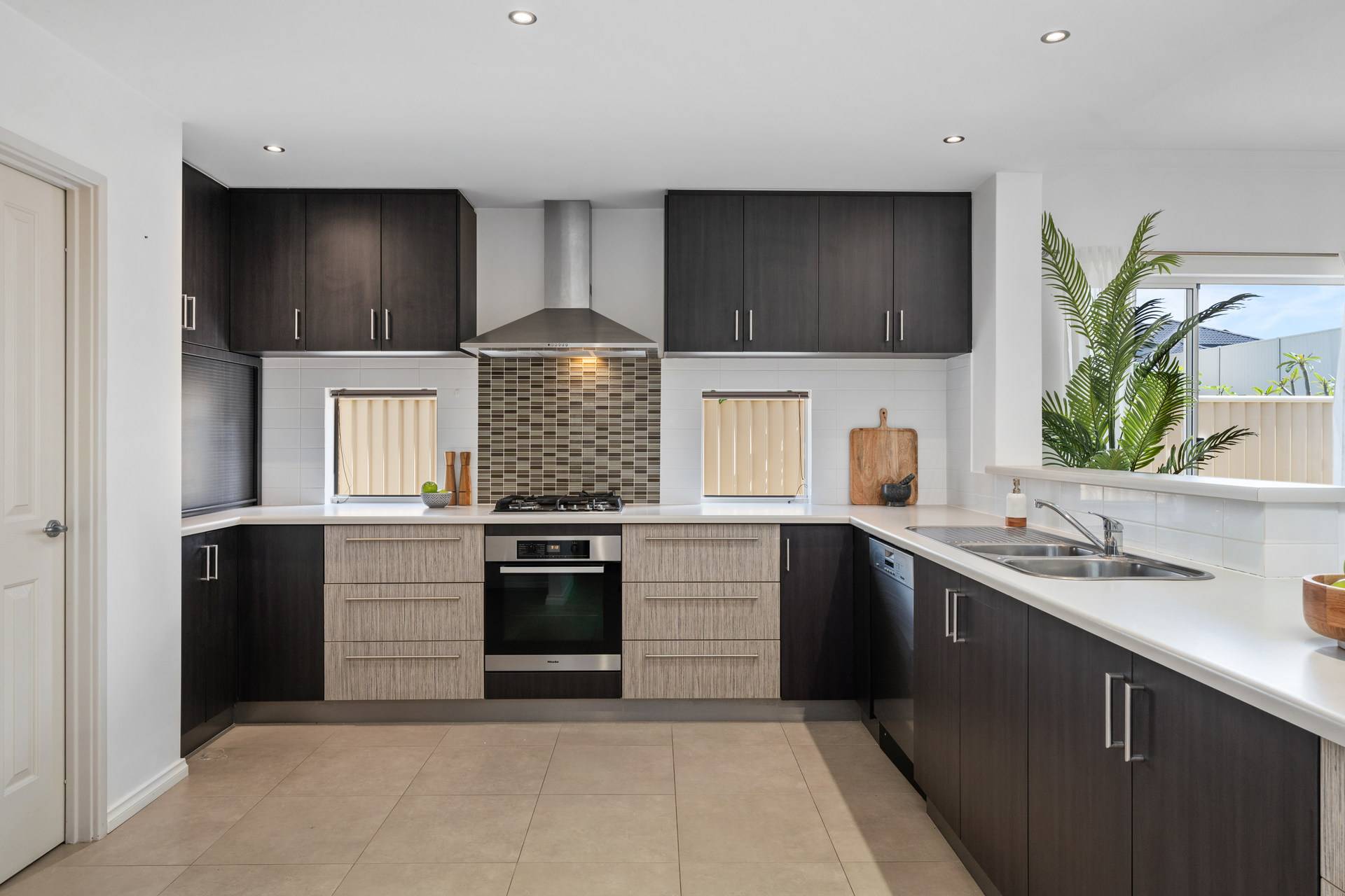 Two gorgeous single French doors – off the formal zone and tiled entry foyer – reveal a commodious open-plan family, meals and kitchen area, where most of your casual time will be spent. The gourmet kitchen itself plays host to a computer nook – or “drop zone” – by the shopper's entry door, double sinks, stainless-steel Westinghouse gas-cooktop and range-hood appliances, a stainless-steel under-bench Miele oven and a modern stainless-steel Miele dishwasher, for good measure.