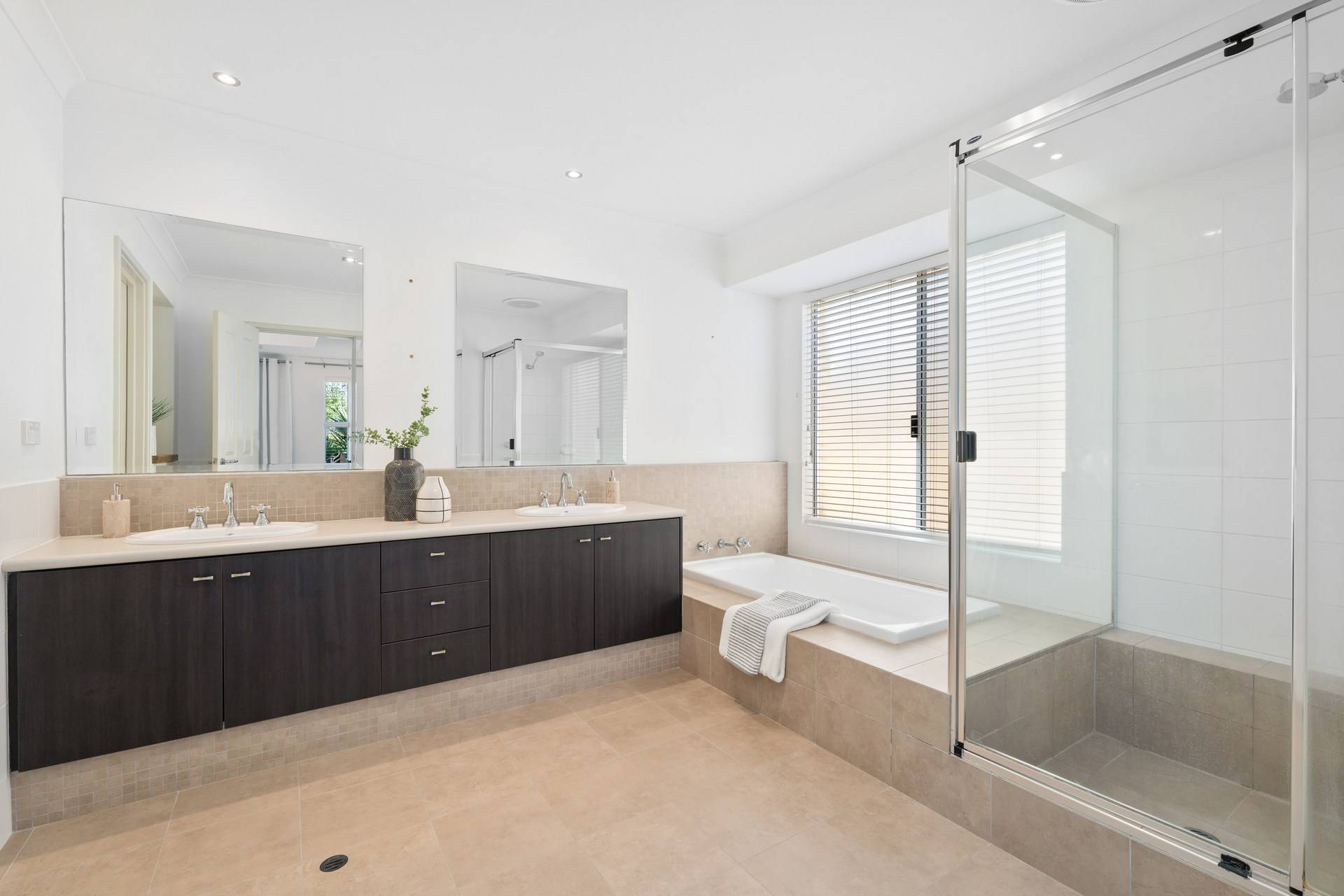 Also off the entry is a sublime master-bedroom suite where a striking recessed ceiling and a large walk-in wardrobe meet a private ensuite bathroom – shower, separate bathtub, twin “his and hers” vanity basins, access into the two-way powder room and all. A nearby fifth bedroom-come-study can be whatever you want it to be.