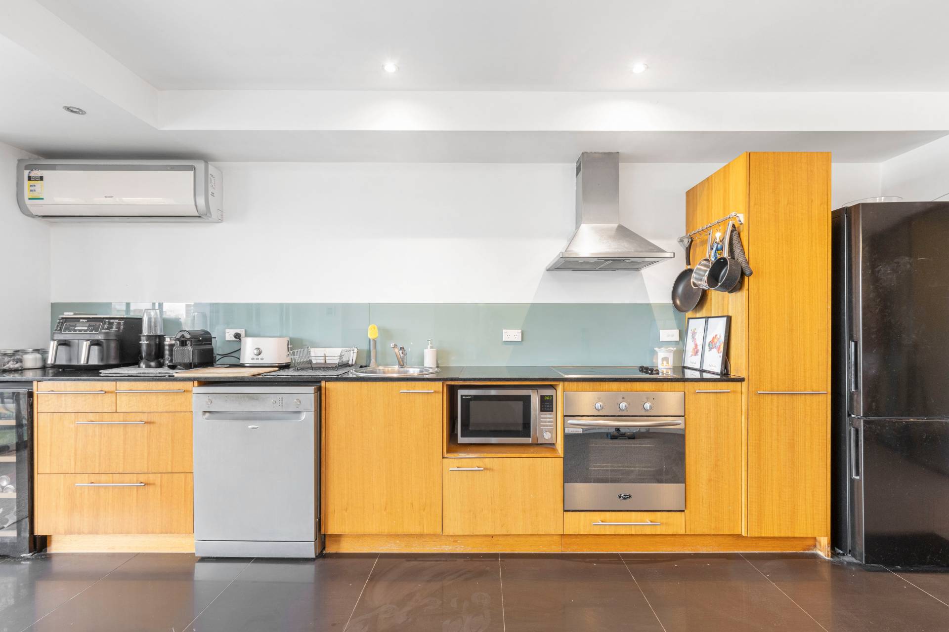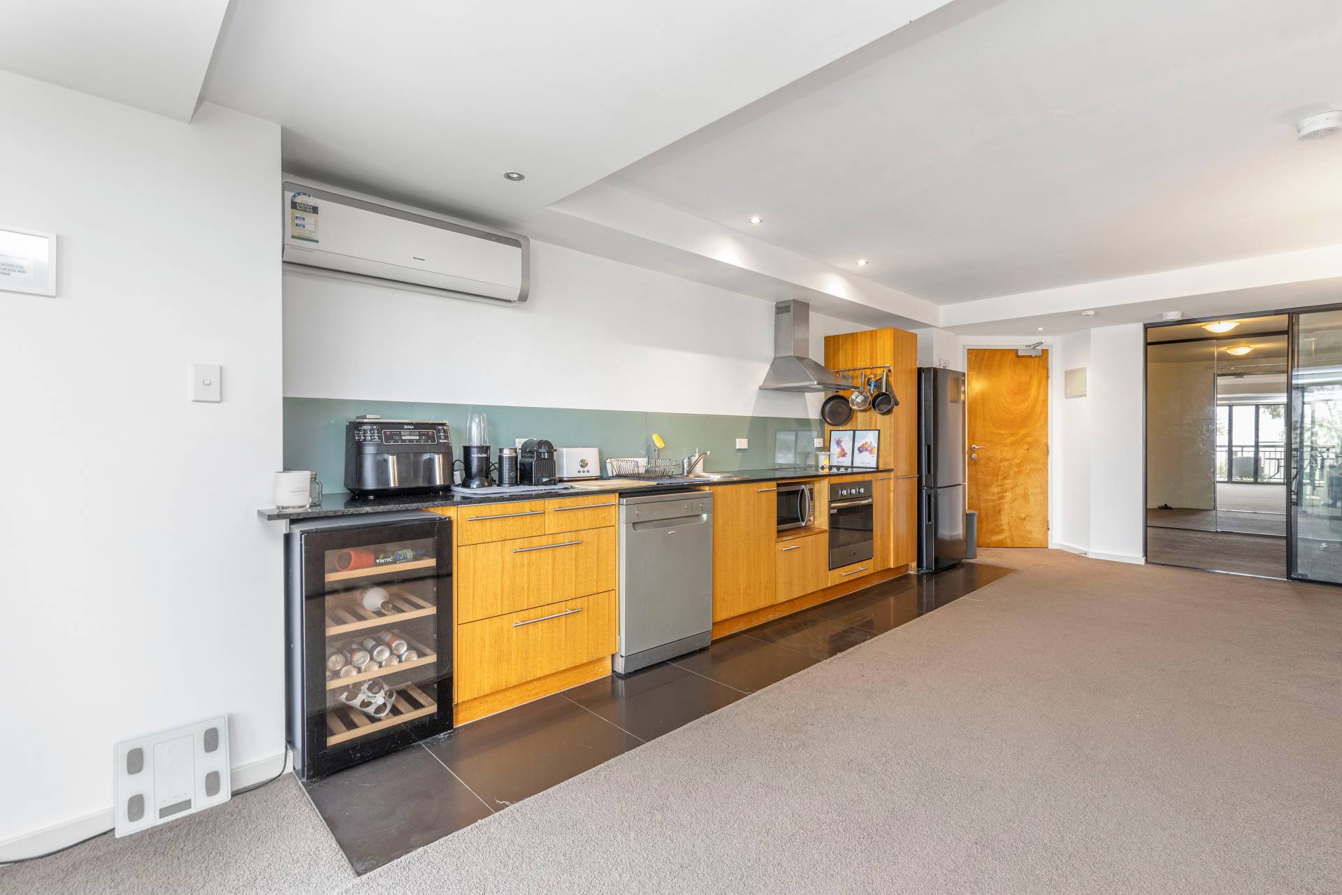 *Modern kitchen with stone bench-tops, electric cook-top, under counter oven and dishwasher. A fridge is also included