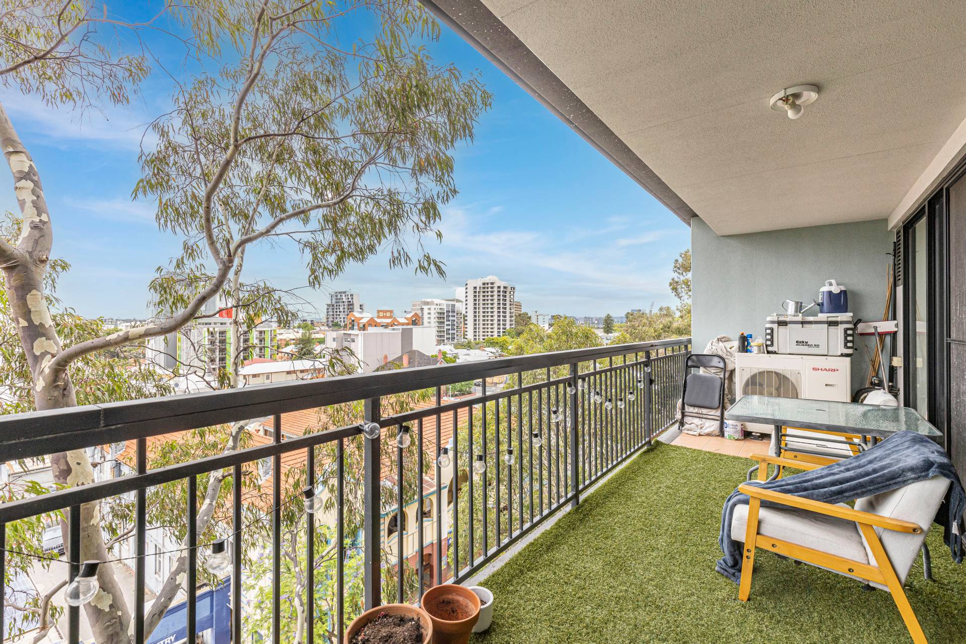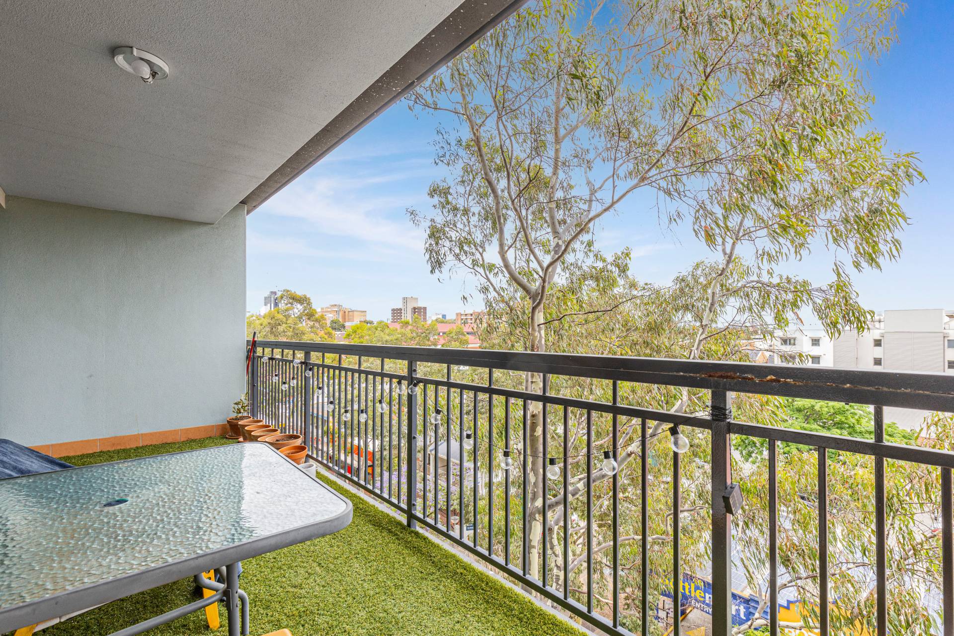 *Large, covered, private balcony with tree-top and city views