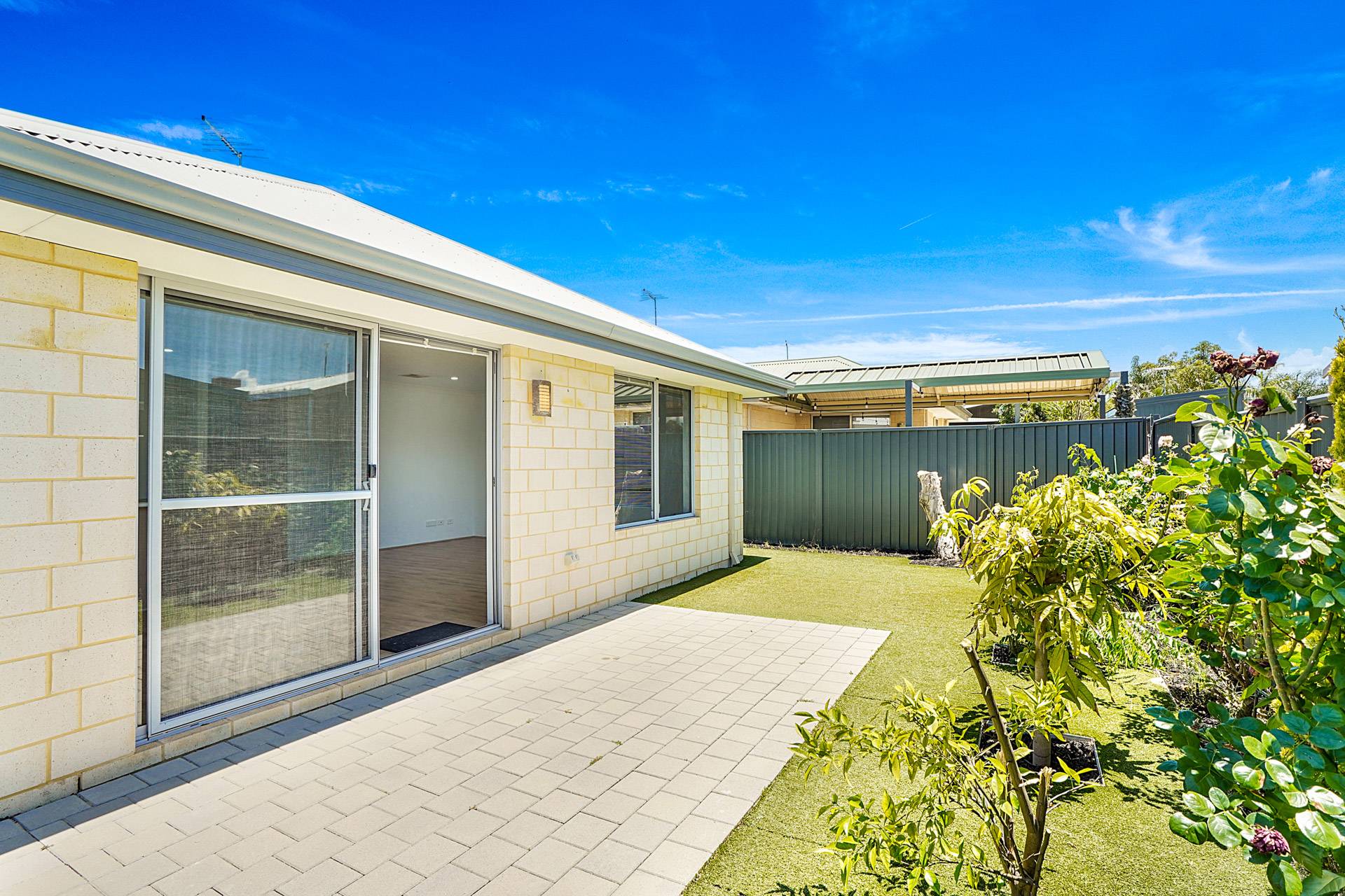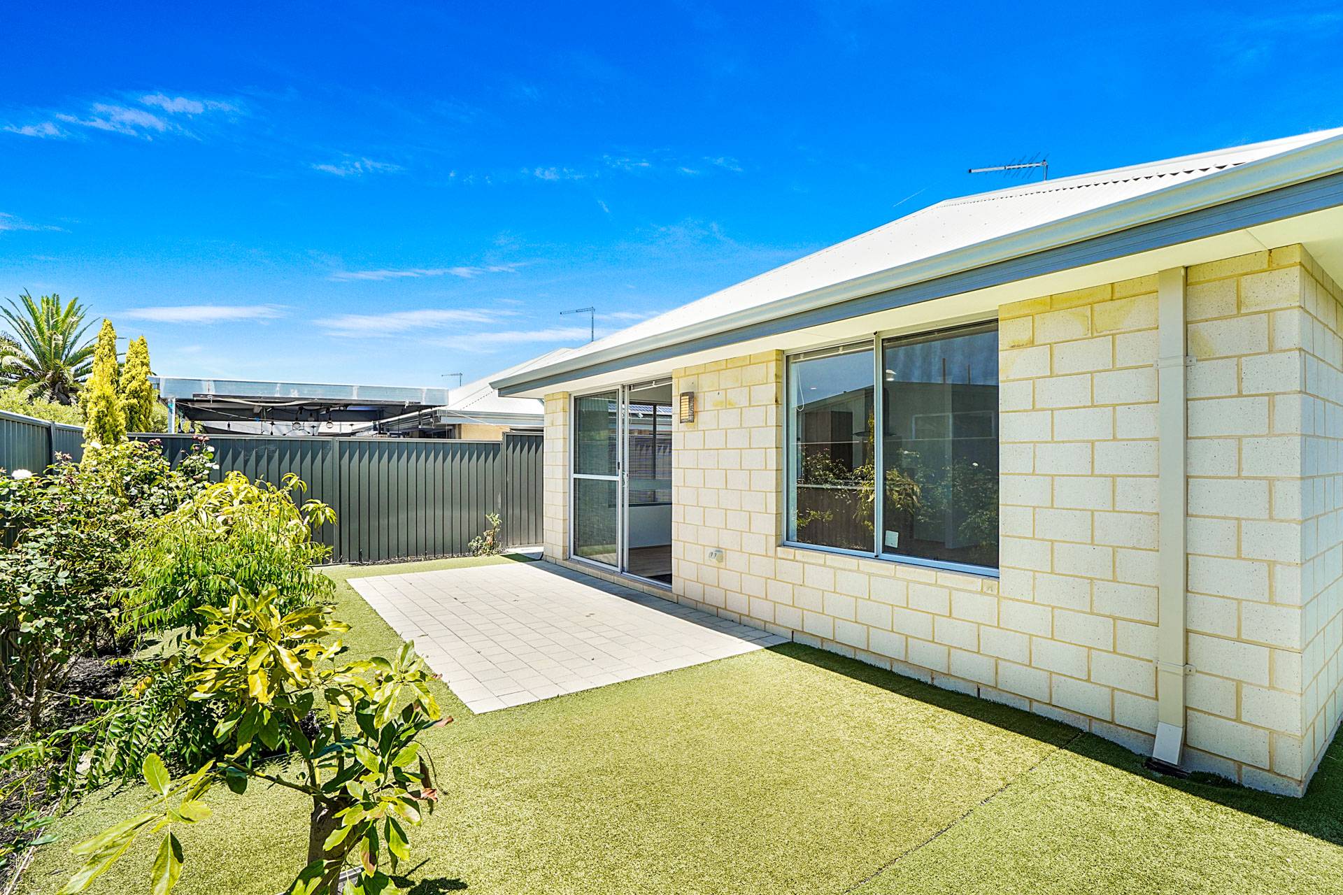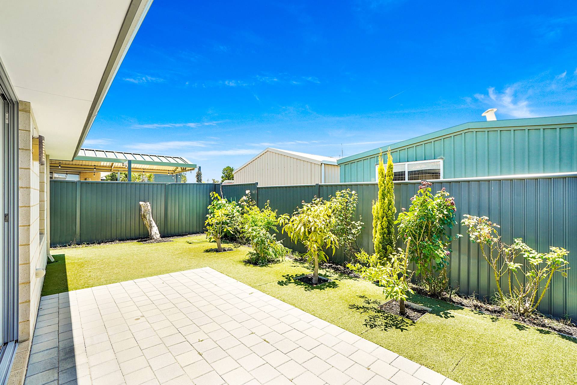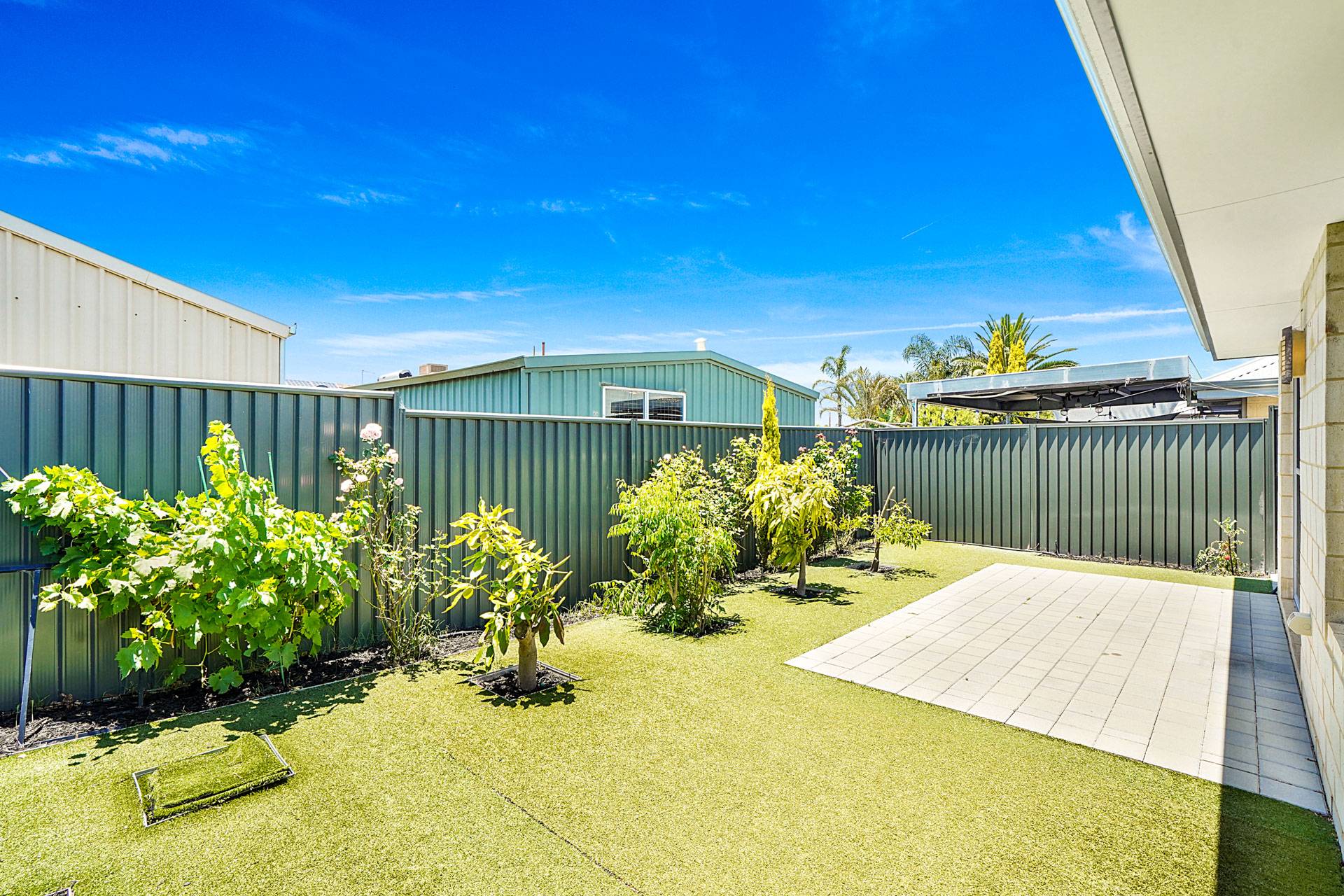 - Peaceful and private backyard with easy care gardens and artificial lawn