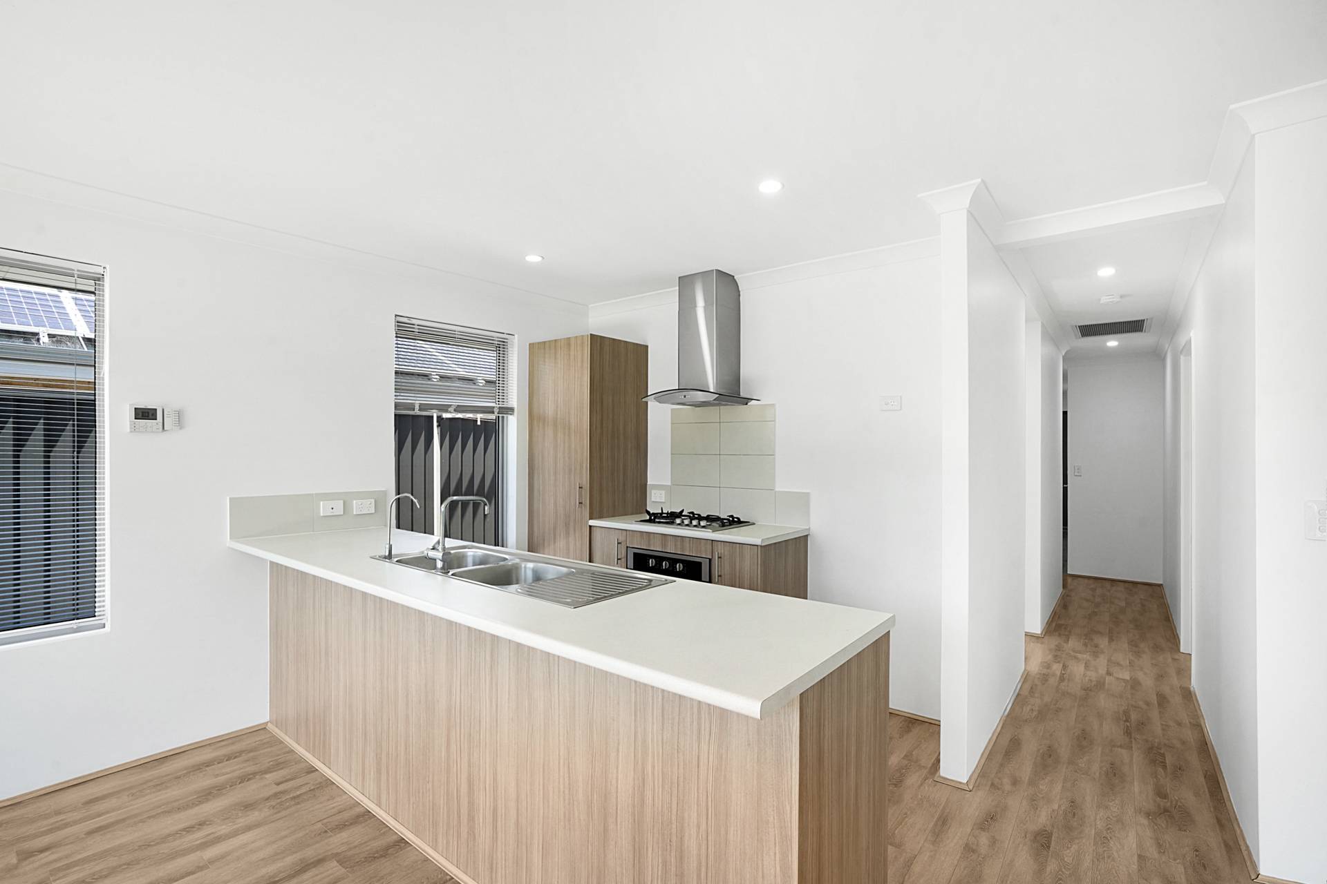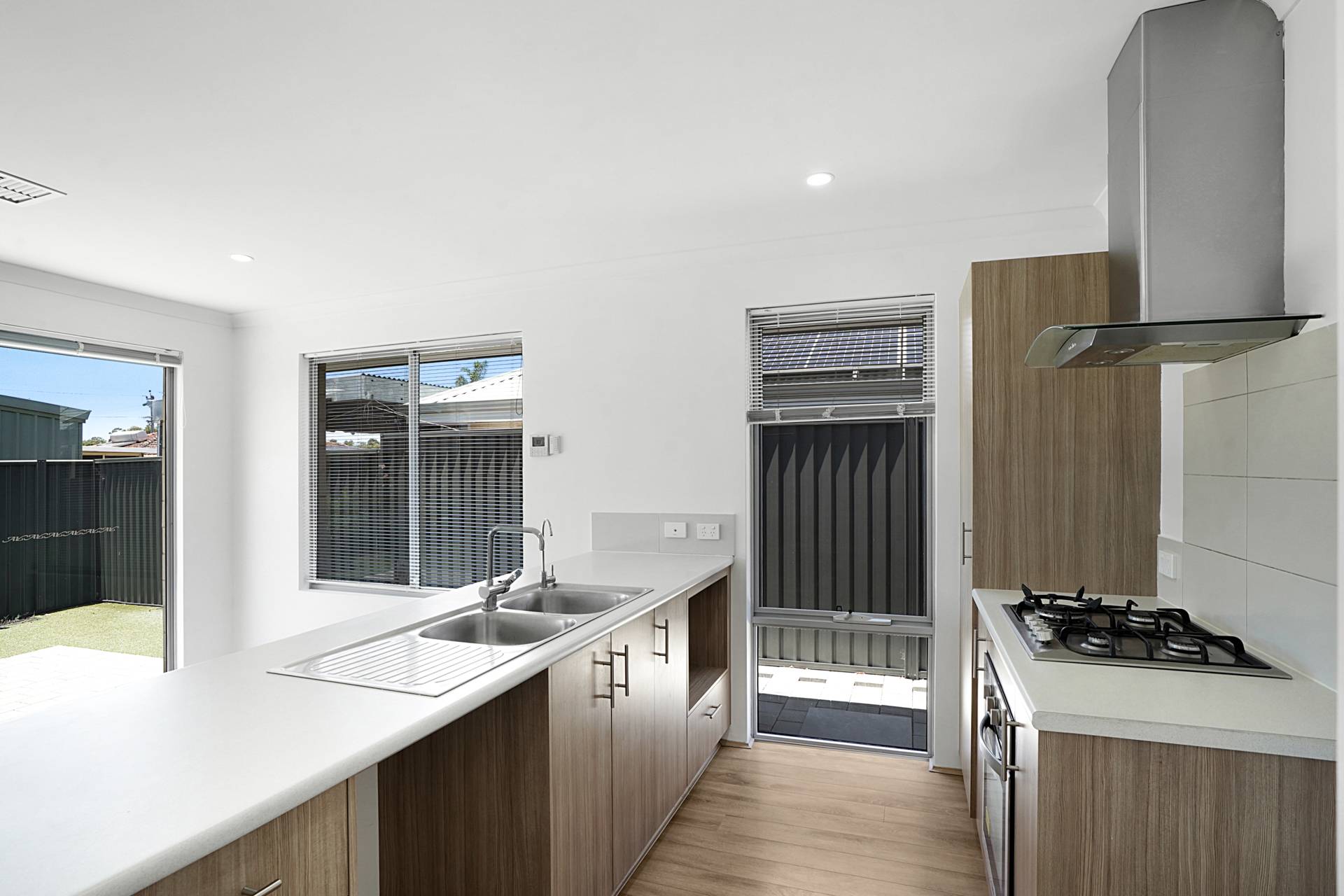 - Well-equipped kitchen includes breakfast bar, dishwasher recess, fridge recess, microwave recess, 4 burner gas cooktop, under bench oven, stainless steel rangehood, double sink and pantry.