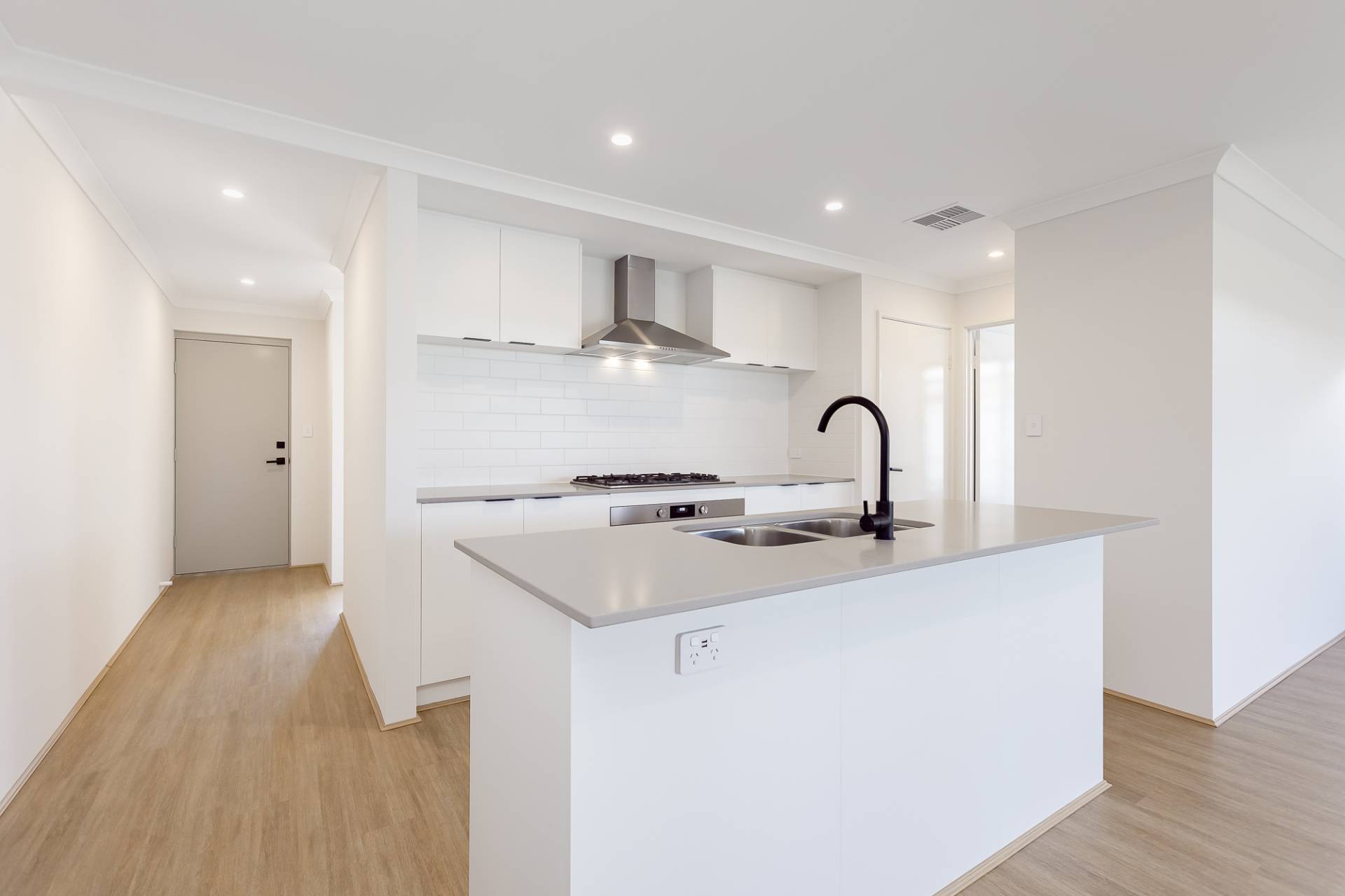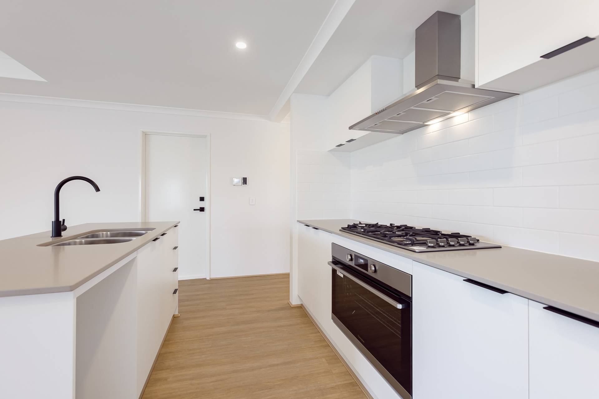 • Stylish kitchen with a large gas cooktop, oven, double sink and dishwasher to be installed