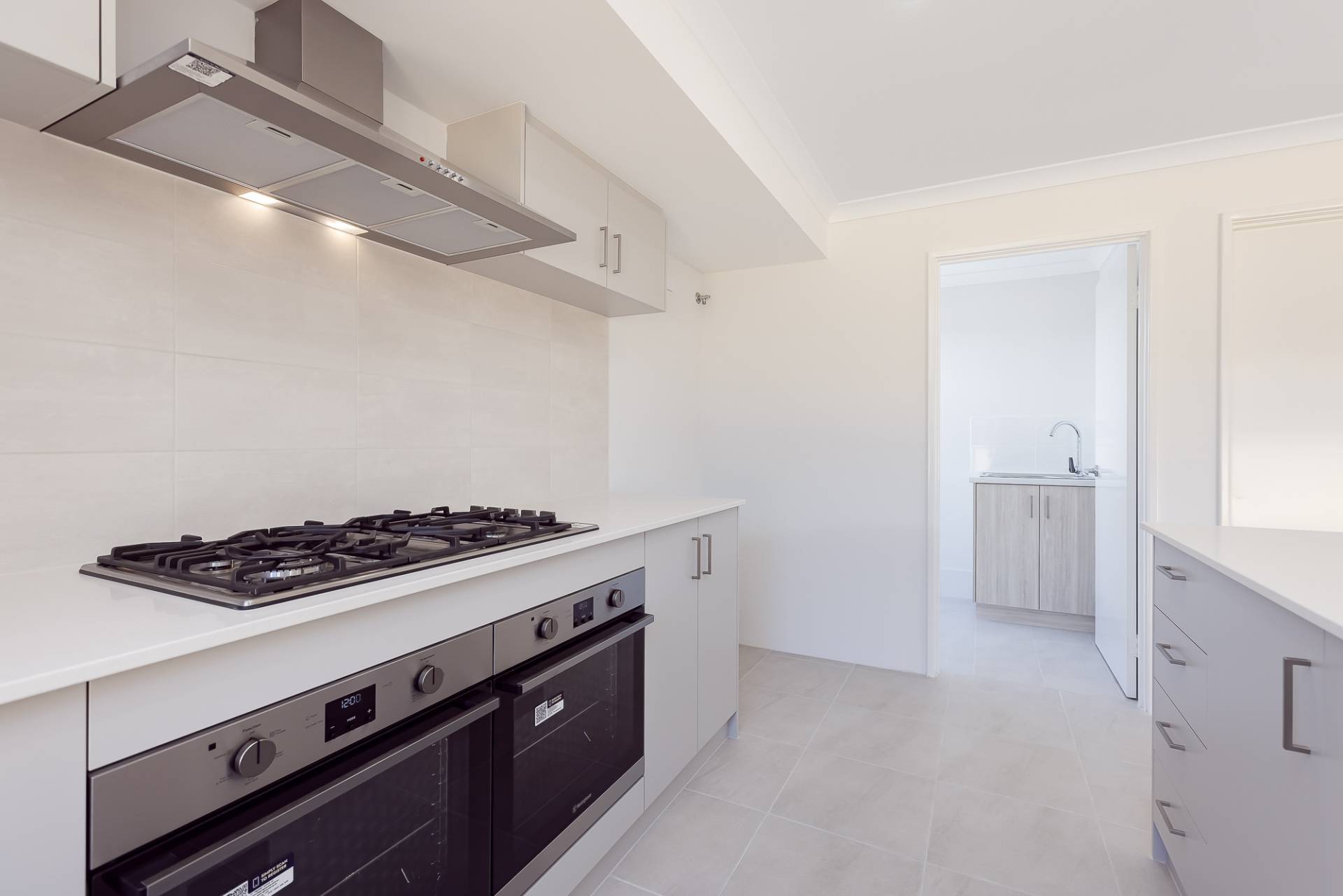 • Stylish kitchen with a large gas cooktop, double ovens, double sink and dishwasher