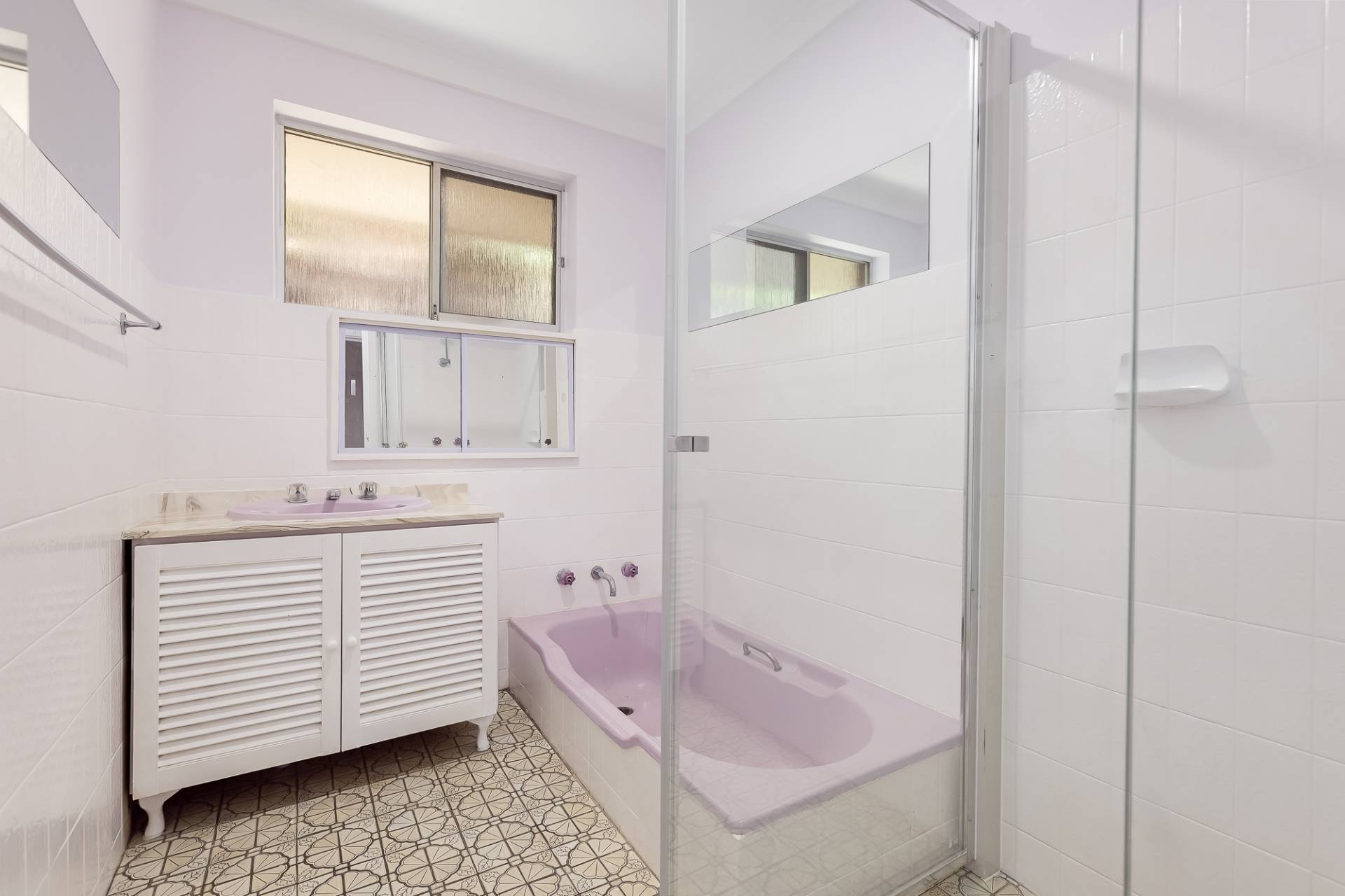 The bathroom is well-appointed with a walk-in shower, powered from a gas hot water system. Full-sized bath, and vanity unit, ensuring both functionality and style.