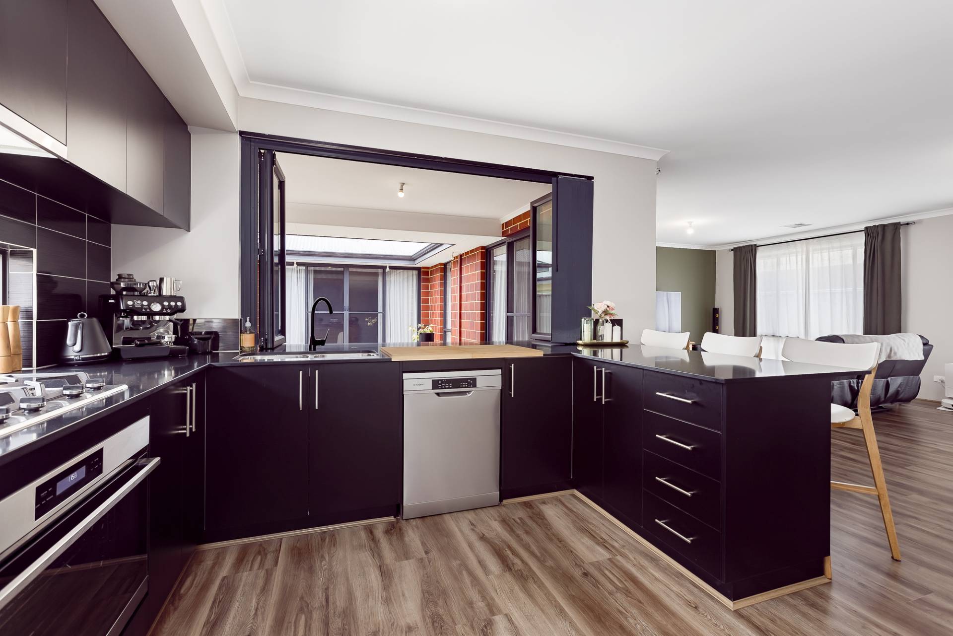 Open-plan kitchen/living area with timber look flooring, sliding doors opening to patio