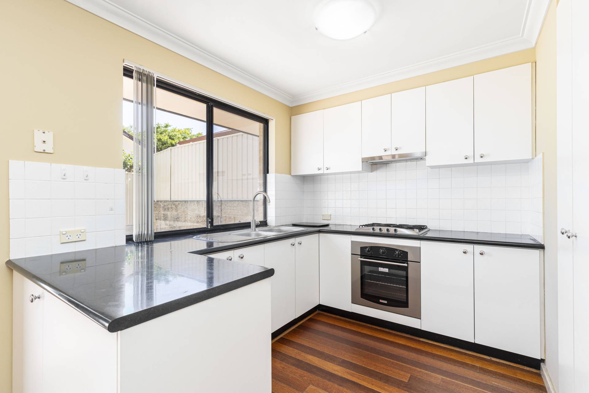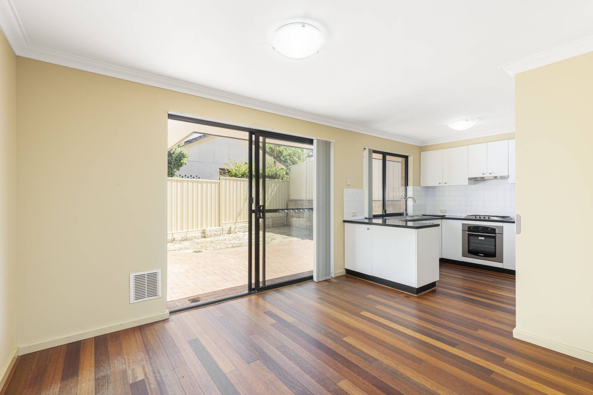 At the heart of the home is a spacious light filled kitchen, featuring gas cook-top, under counter oven, large fridge recess and ample storage, making it a delight for any home chef. Adjoining the kitchen is an open-plan living & meals are with sliding doors opening onto the north facing rear courtyard. Solid wood flooring provides a warm and inviting space to entertain or relax. For added comfort there is a separate freshly carpeted lounge/theatre room.