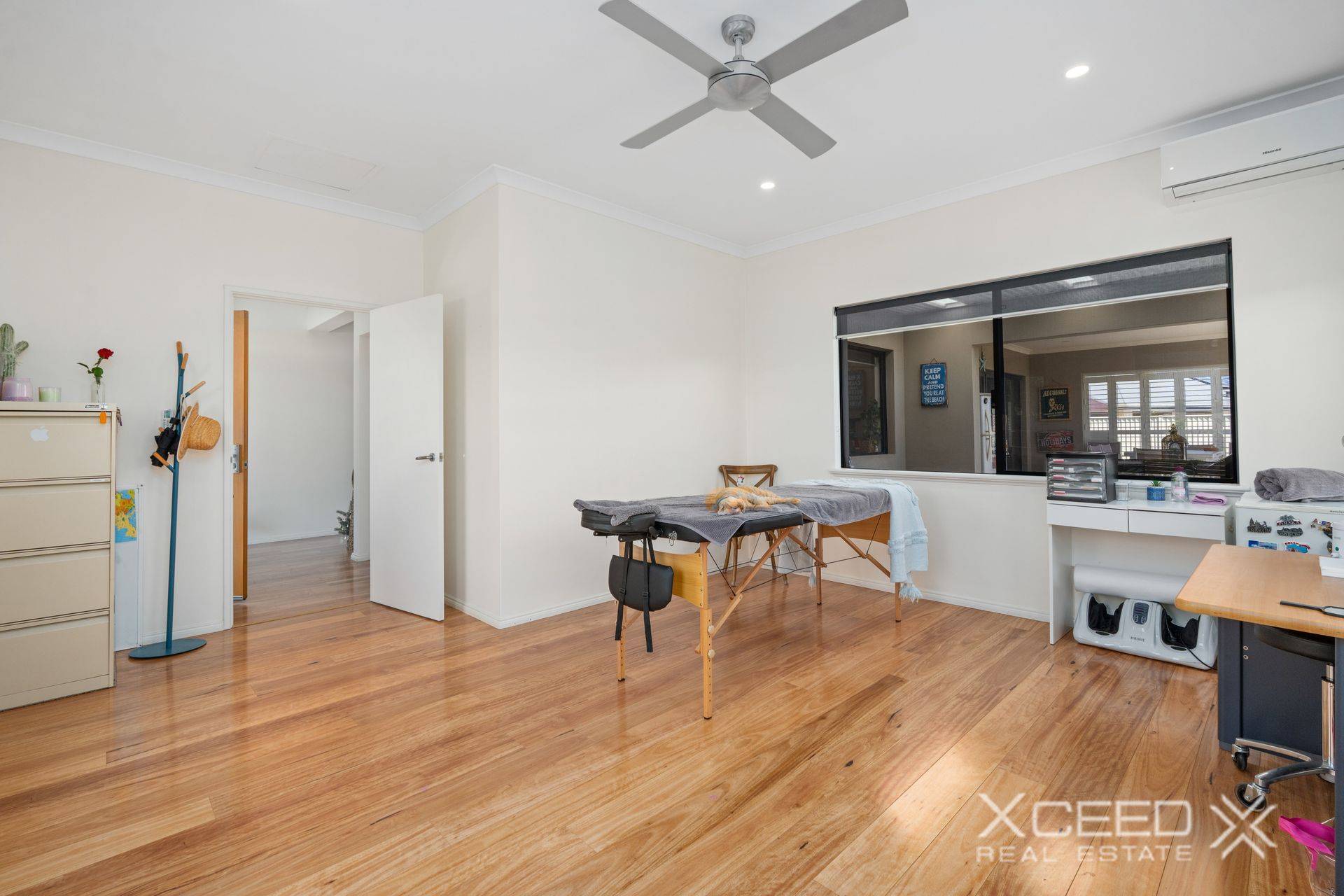 Downstairs, an open-plan family, dining and kitchen area is the perfect hub of the floor plan with its sleek stone bench tops, double sinks, glass splashbacks, dishwasher, stainless-steel range hood, five-burner gas cooktop, under-bench oven and separate walk-in pantry. A large home office – or potential extra lounge room – to the right of the entry has its own ceiling fan and split-system air-conditioning unit, whilst the main family bathroom is sleek, stylish and helps cater for everybody's personal needs in the form of a shower and separate bathtub.