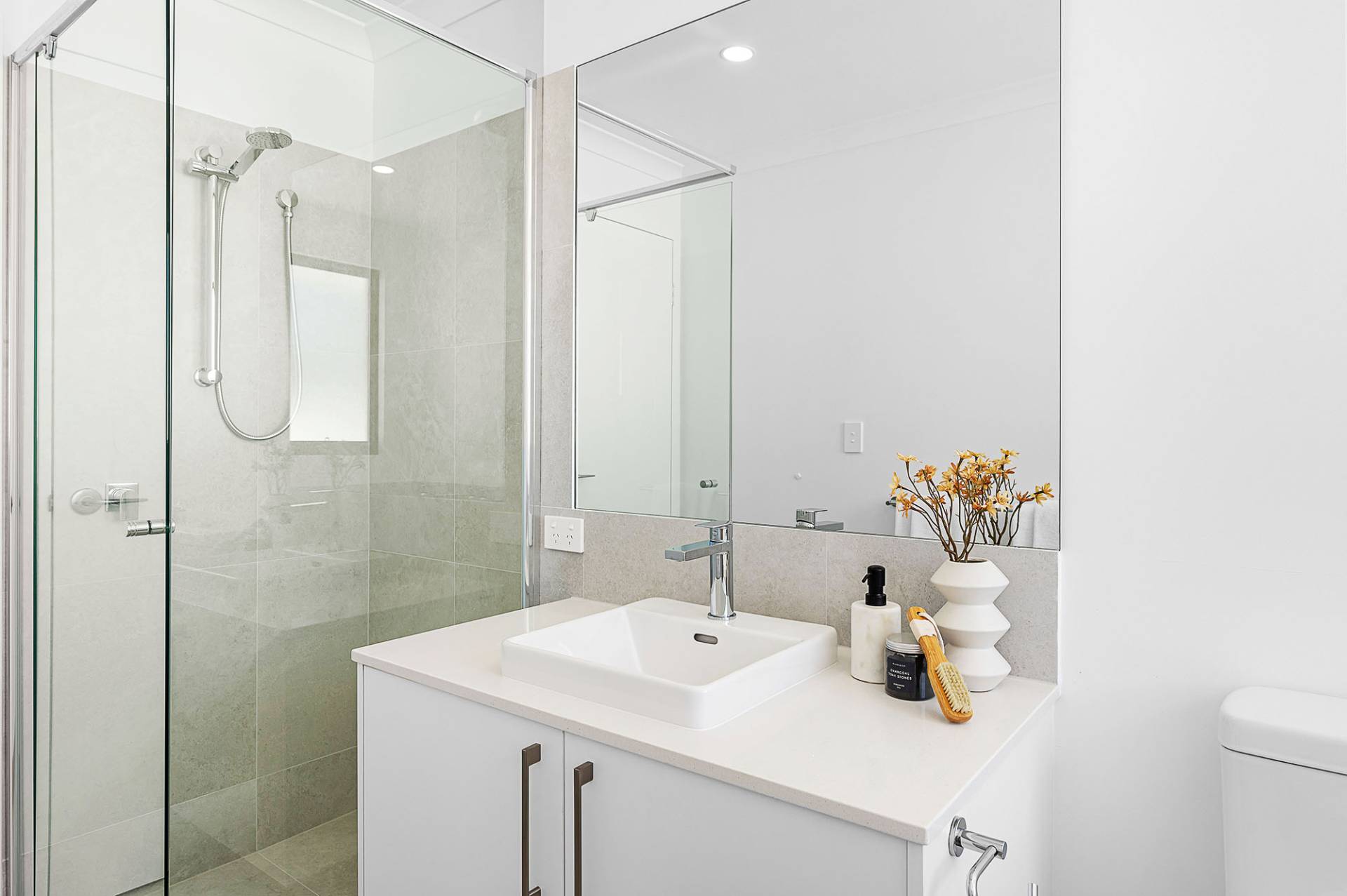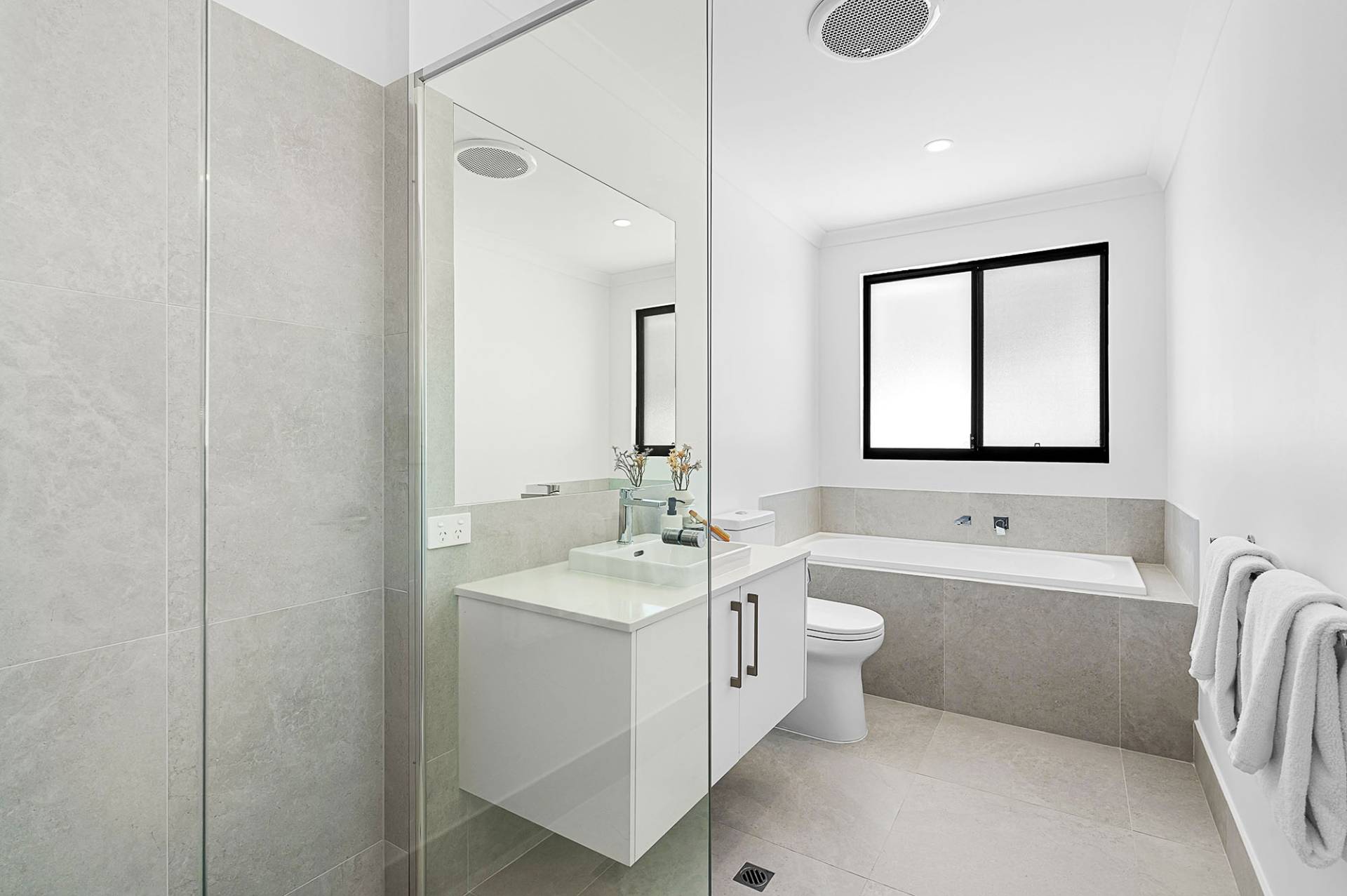 • Spacious and stylish second bathroom with a separate shower, bathtub, and stone benchtop vanity