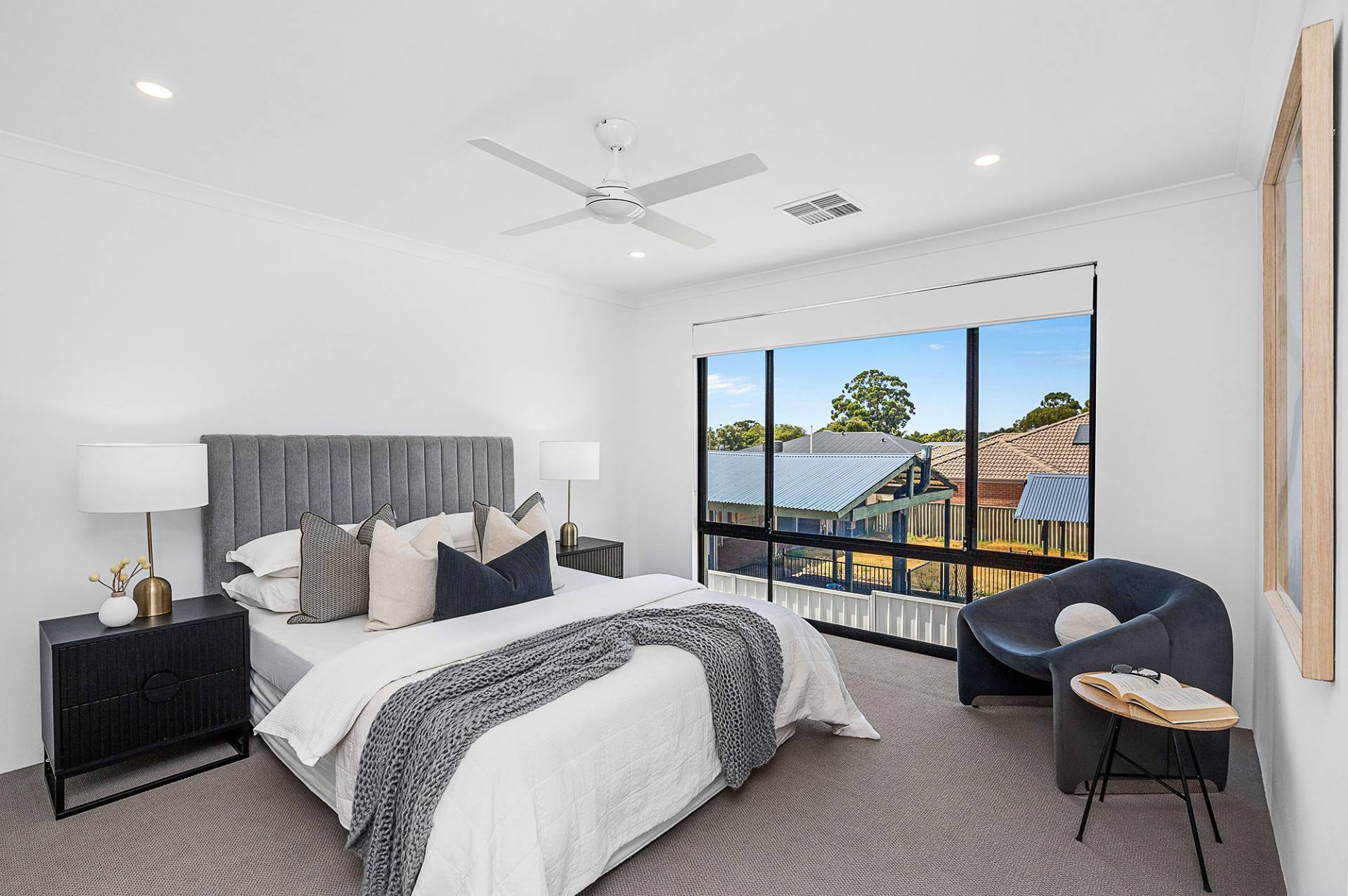 • Luxurious master suite featuring a large window, ceiling fan, walk-in robe, and a stylish ensuite with stone benchtop vanity