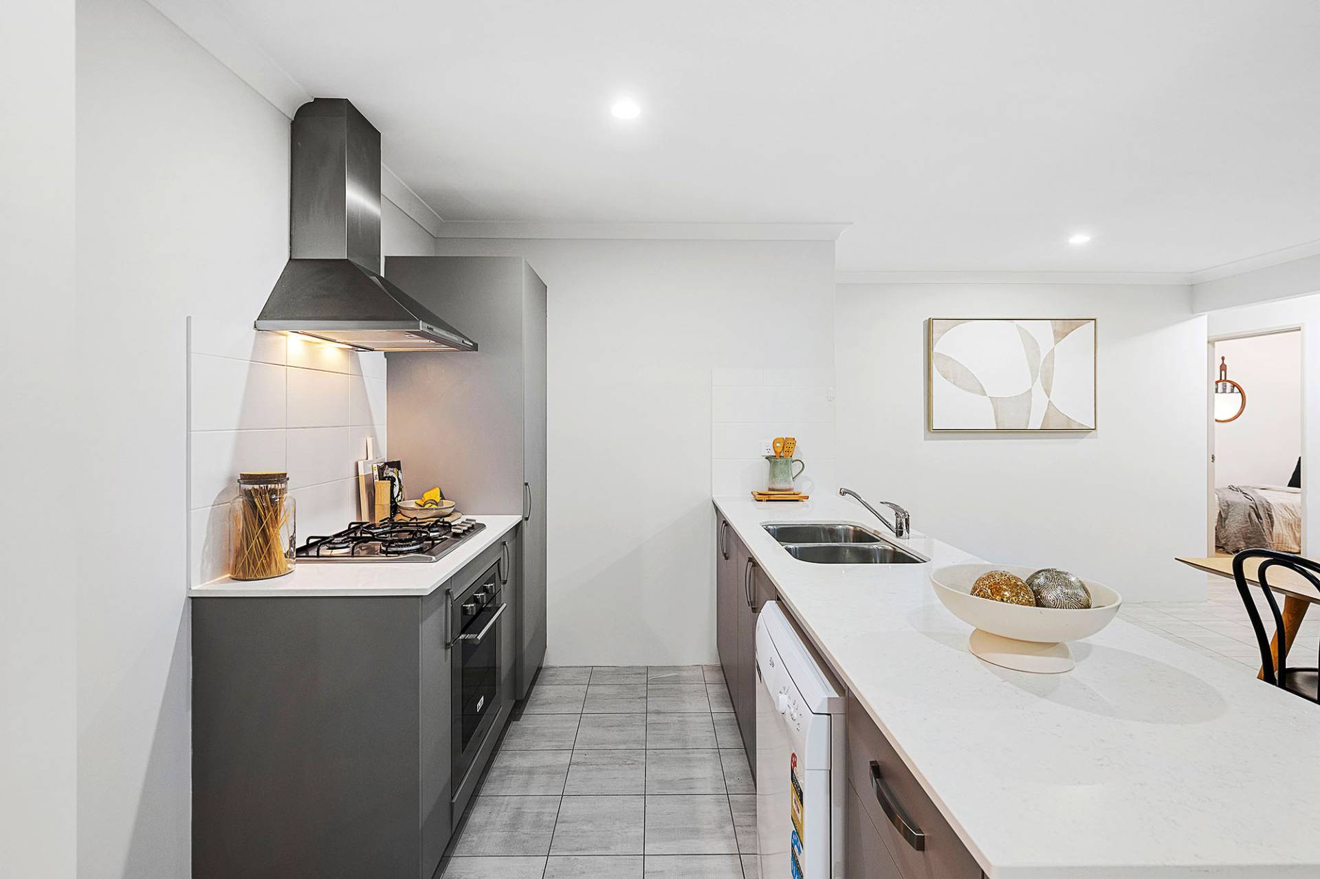 • Modern galley kitchen with stainless steel appliances and tiles splashback