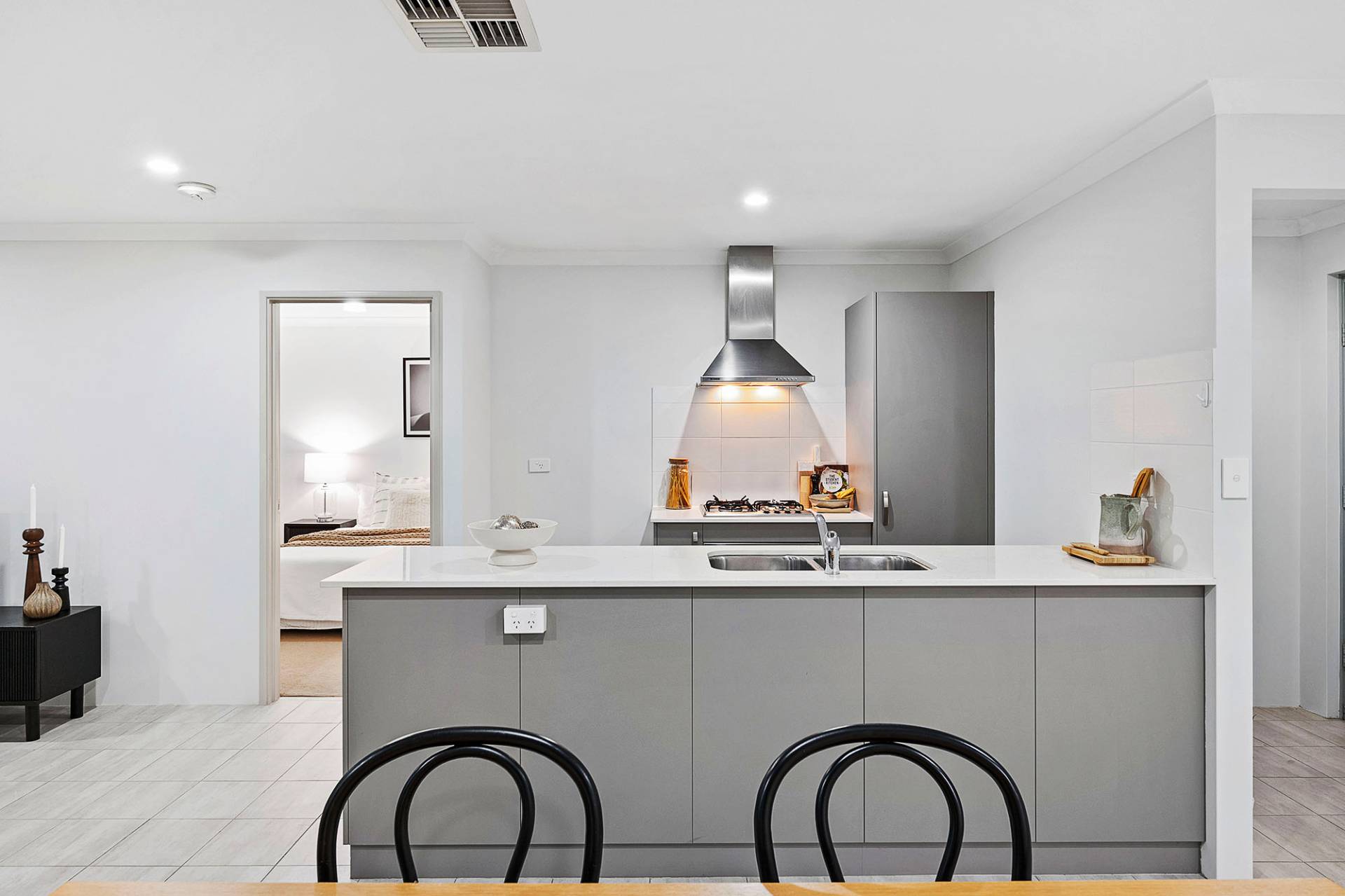 The contemporary kitchen boasts generous cabinetry, soft-close drawers, a gas cooktop, a double sink, stone benchtops, and stainless steel appliances, making it ideal for everything from family dinners to quick bites at the breakfast counter. The master bedroom features a walk-in robe (WIR) and an ensuite bathroom, while bedrooms two and three are equipped with full-height mirrored built-in robes, providing abundant storage. A European-style laundry is neatly concealed behind sliding doors, ensuring a clean and organized living space all year round.