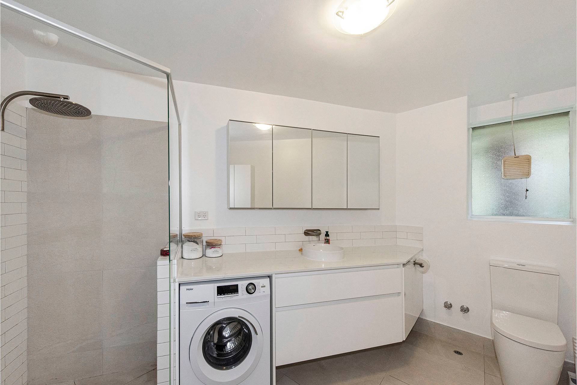 * Combined bathroom/laundry – Features a vanity, corner shower, toilet, and laundry recess.
