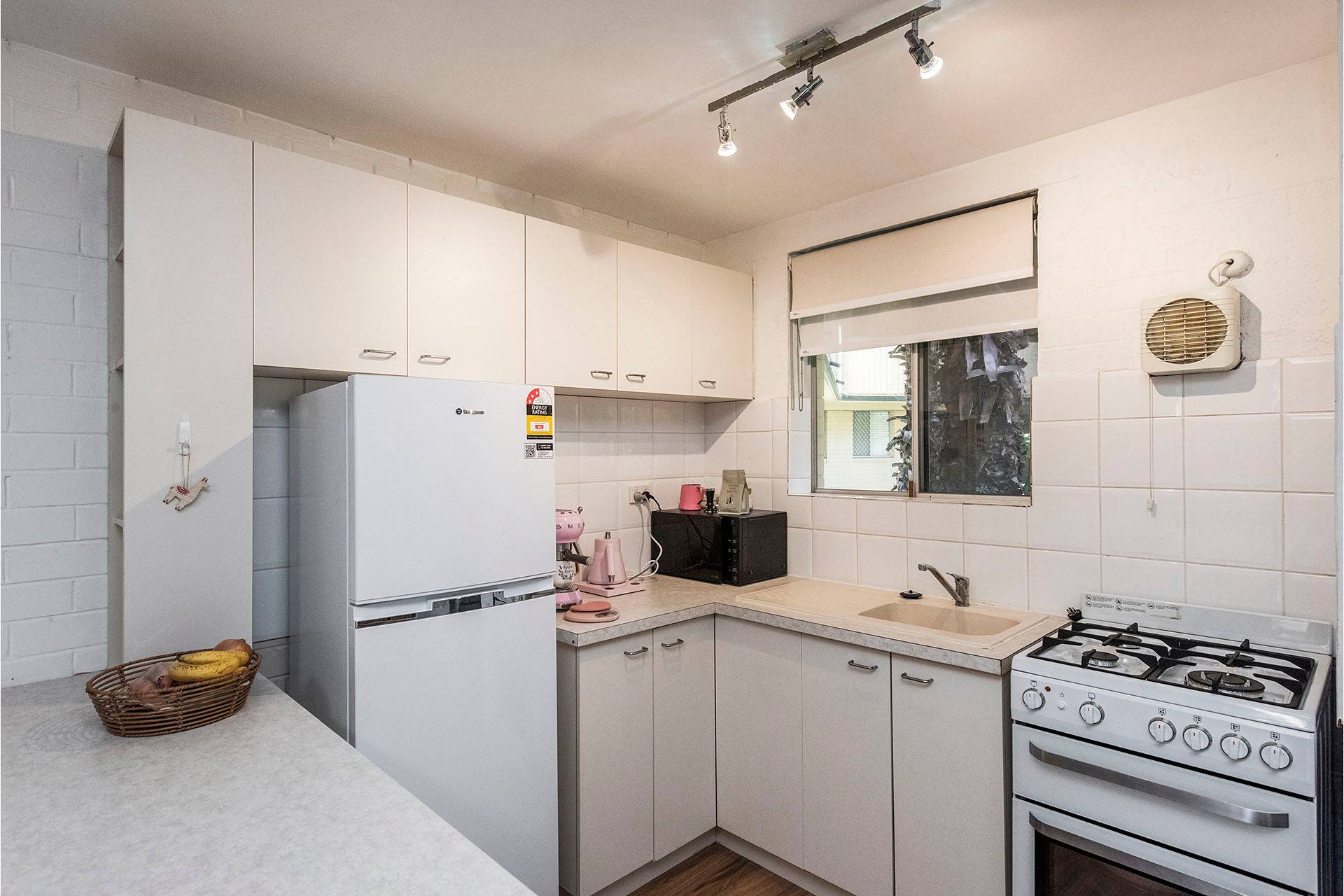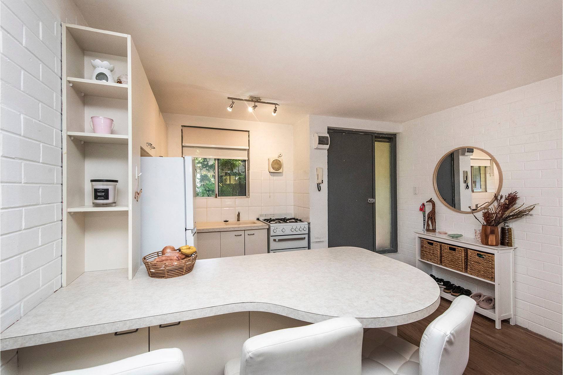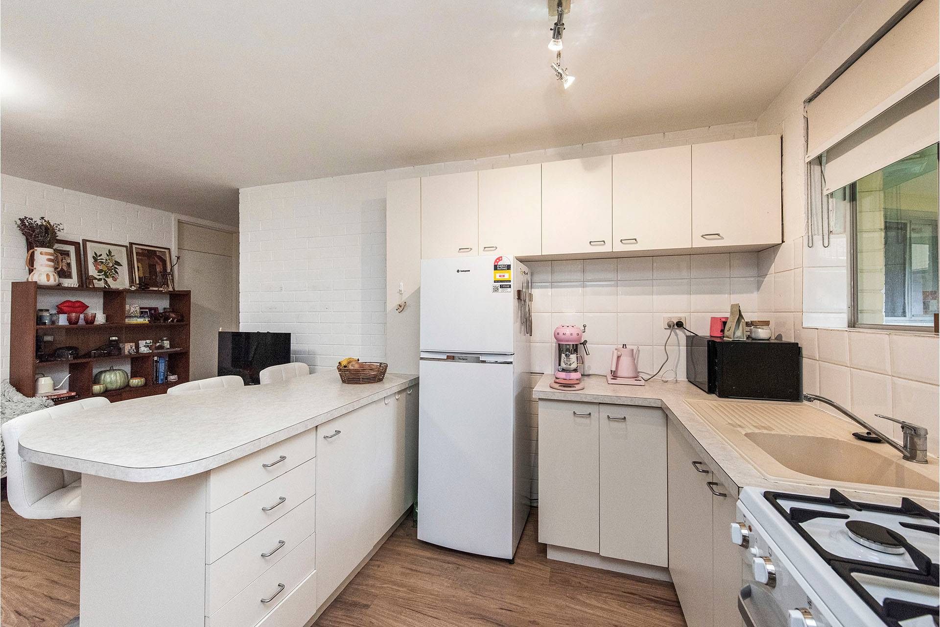* Kitchen – Neutral tones, breakfast bar, ample storage, and gas cooking.