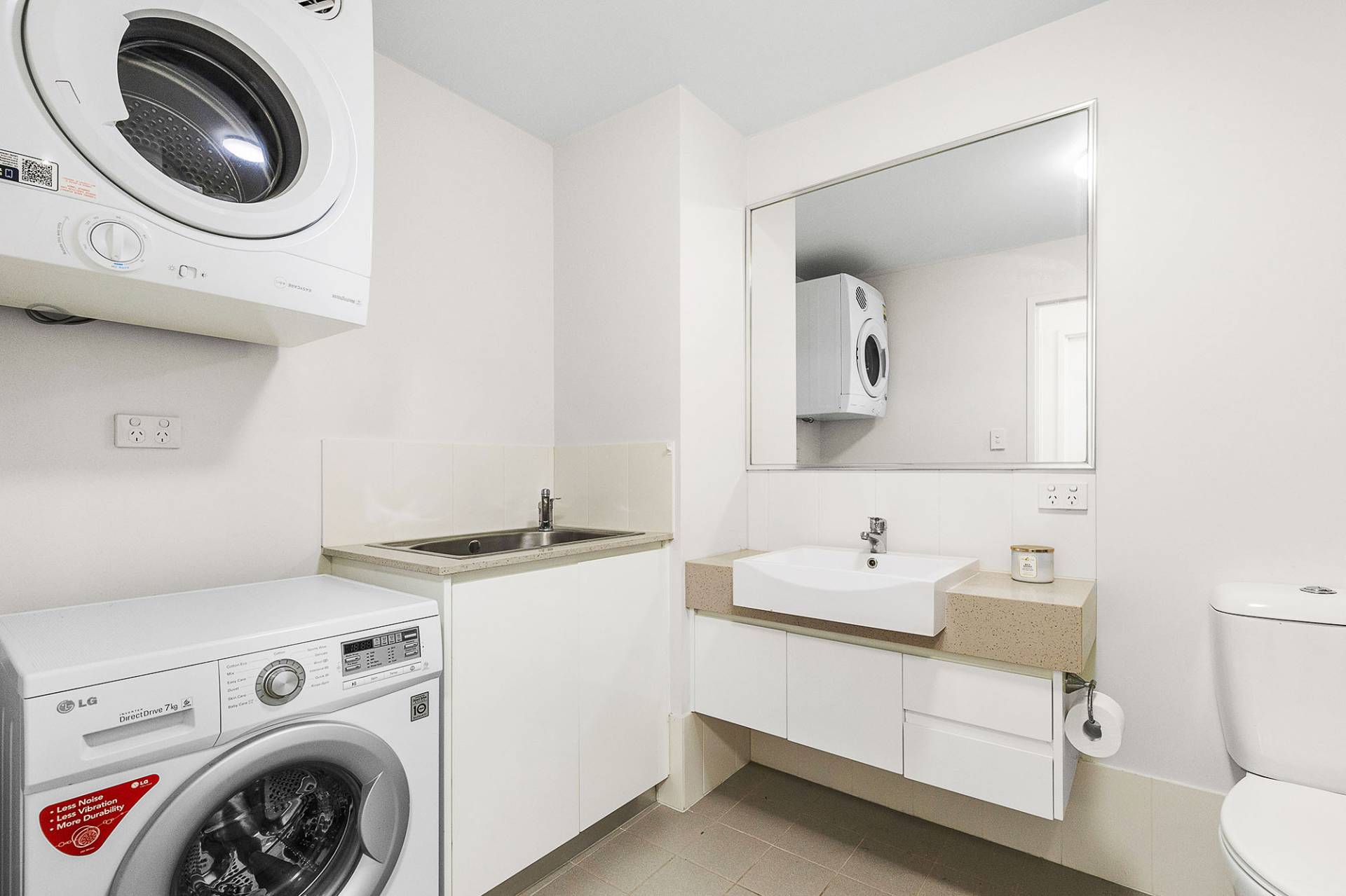 The main bathroom is designed for both comfort and functionality, incorporating a laundry area with space for a washing machine, a wall-mounted dryer, a large laundry trough, and ample storage. It also includes a shower-over-bath combination, a single vanity, and a toilet.