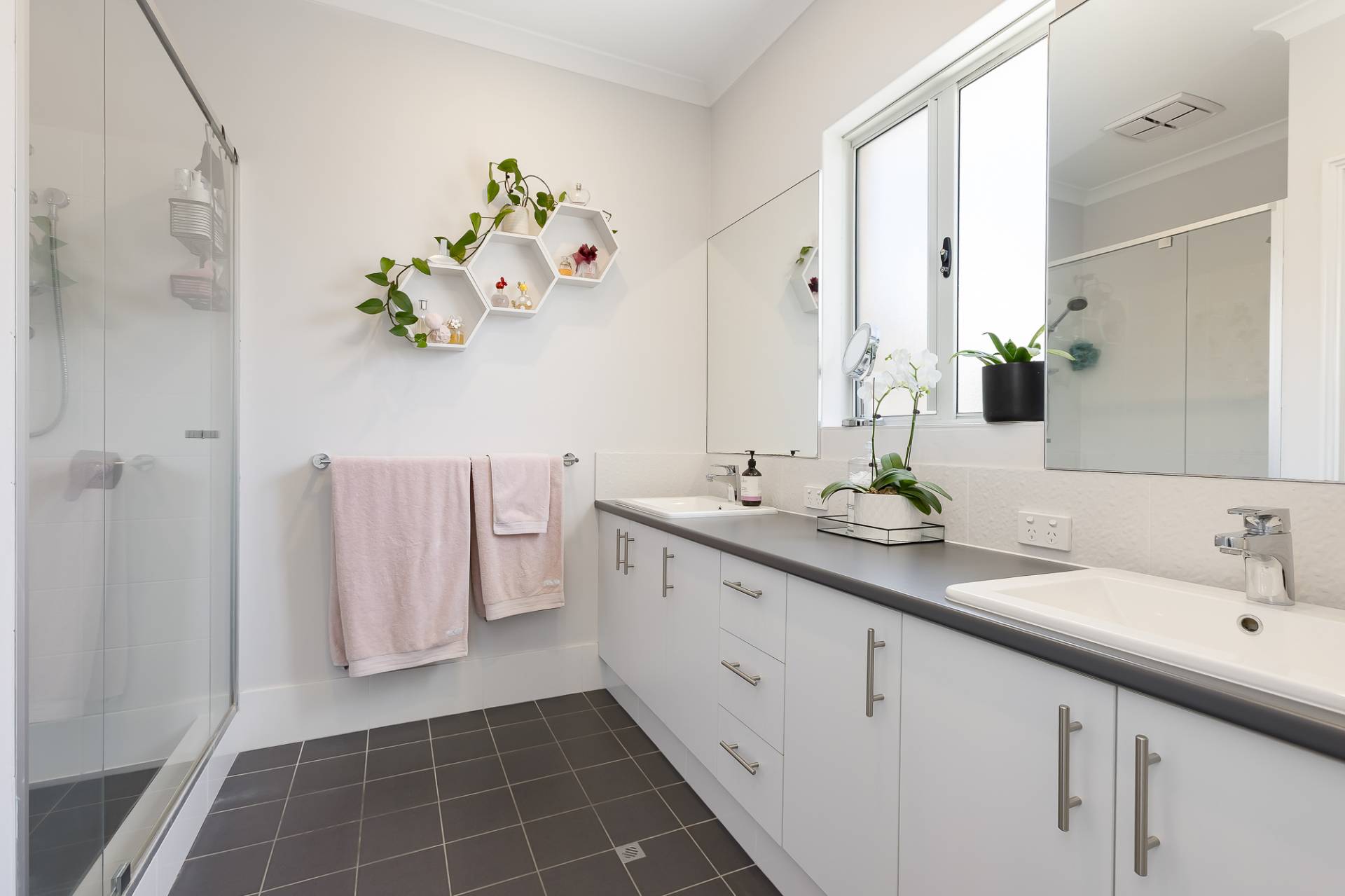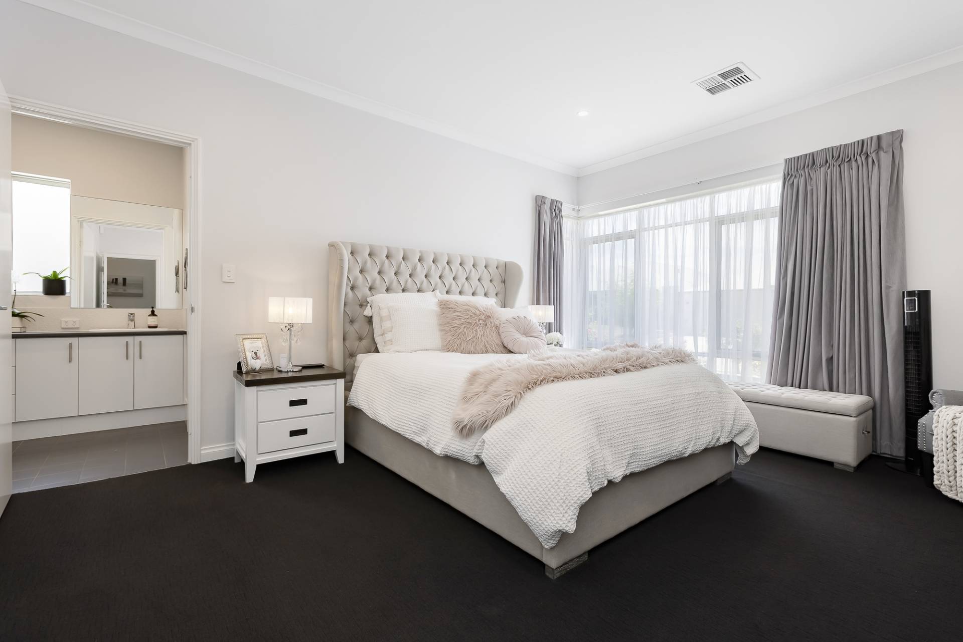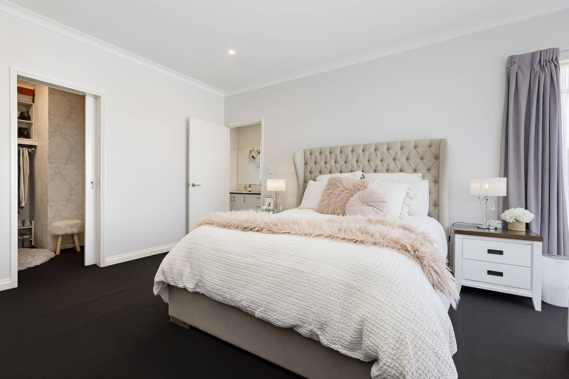 Main bedroom features spacious ensuite with double basins, walk in robes, floor-to-ceiling drapes