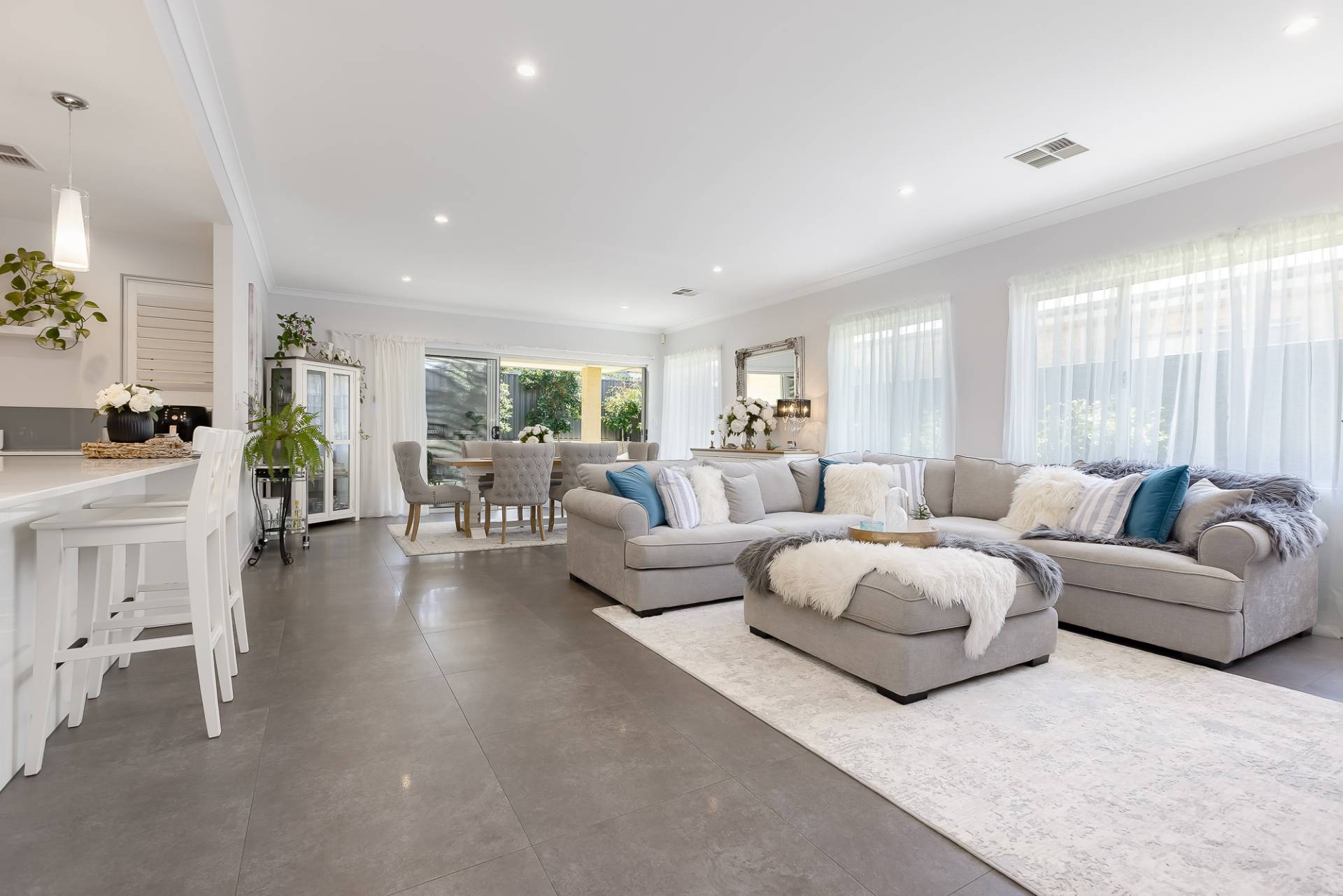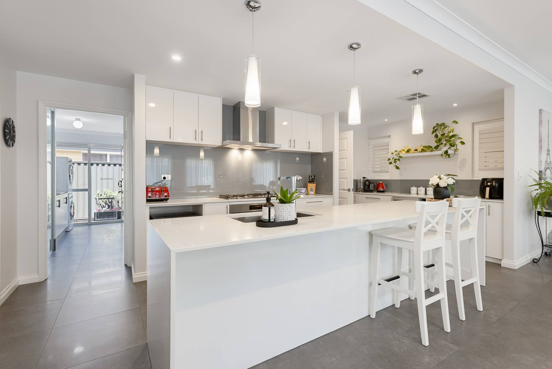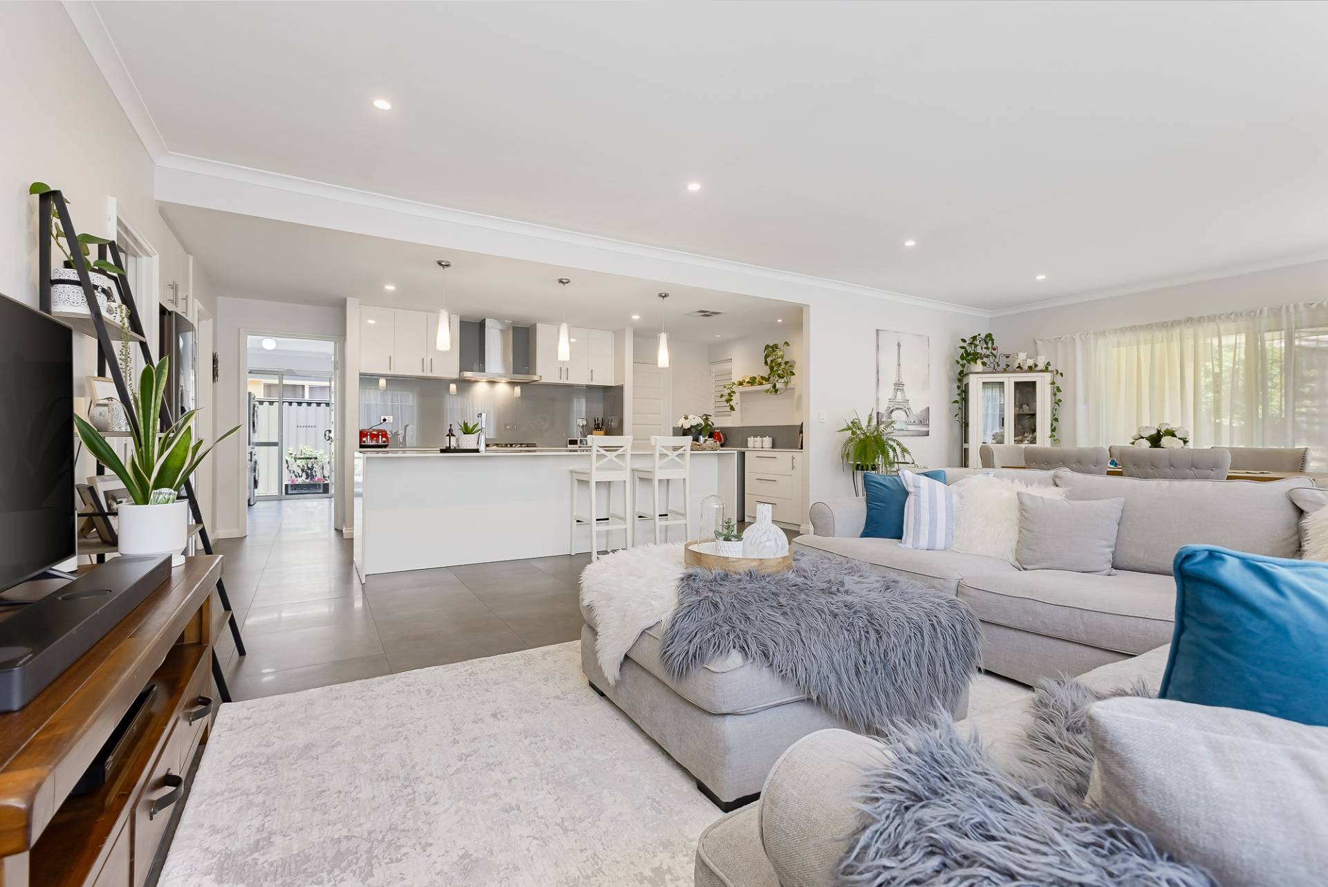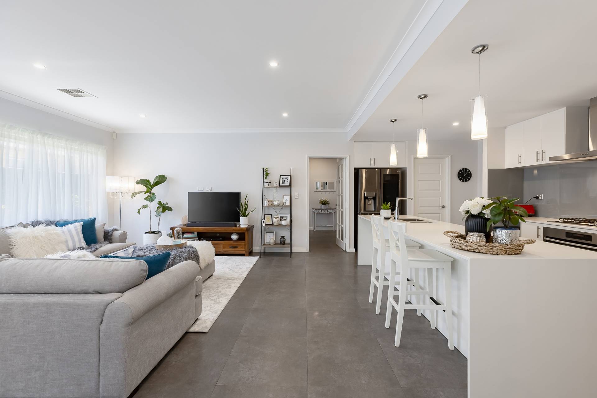 Step inside to a home of light-filled spaces, whitewashed walls, a neutral palette, functional layout and stylish fittings throughout. A generous, open plan living, kitchen and dining areas lies at the heart of the home, featuring quality tiled flooring and pendant lights, with sliding doors opening out to the patio, lending a breezy connection to the outdoors.