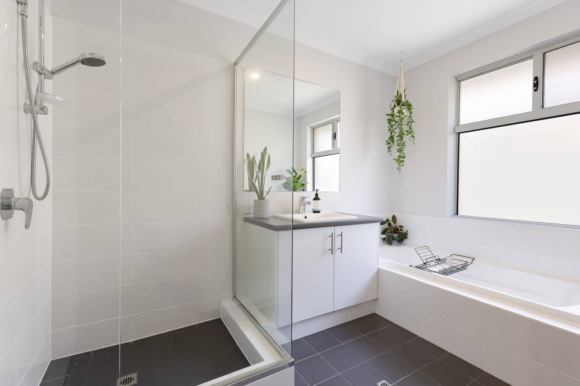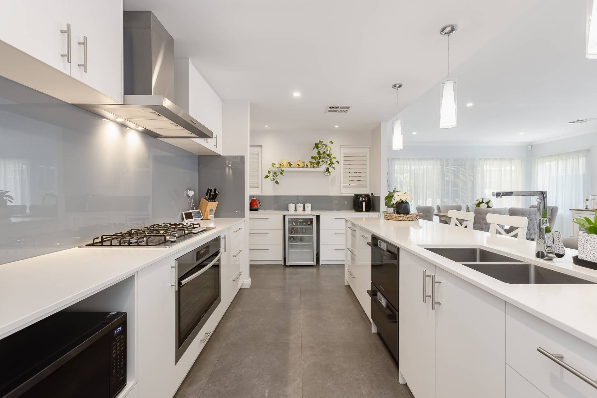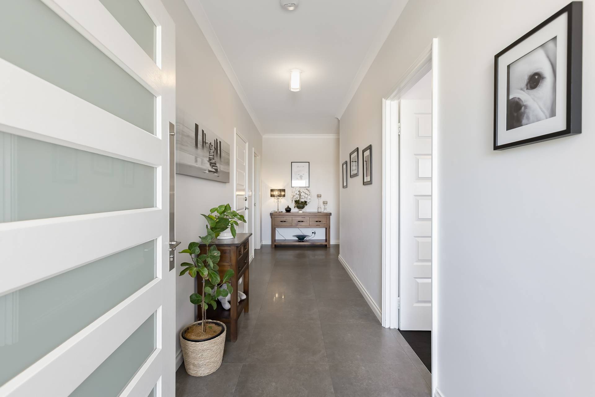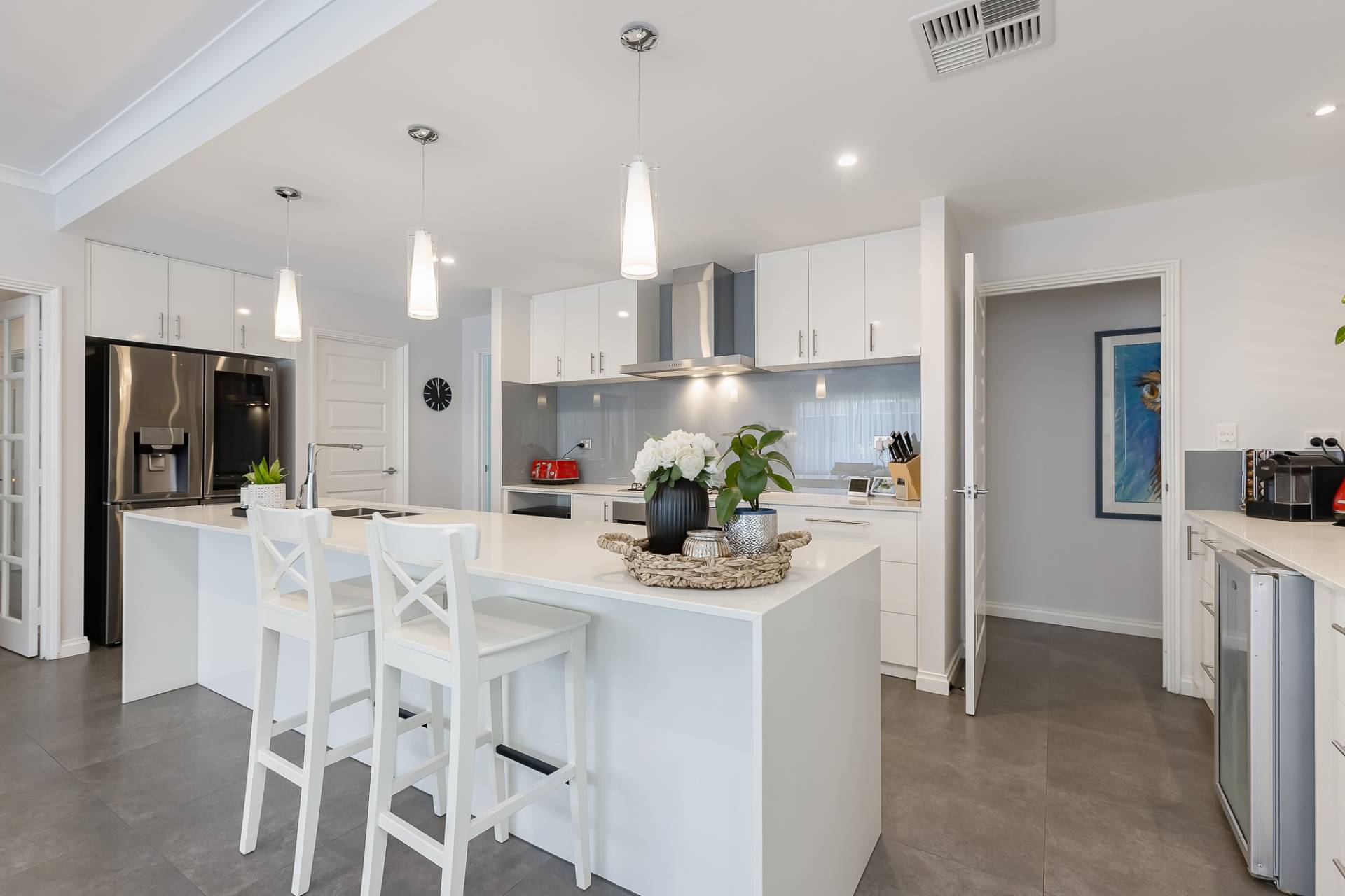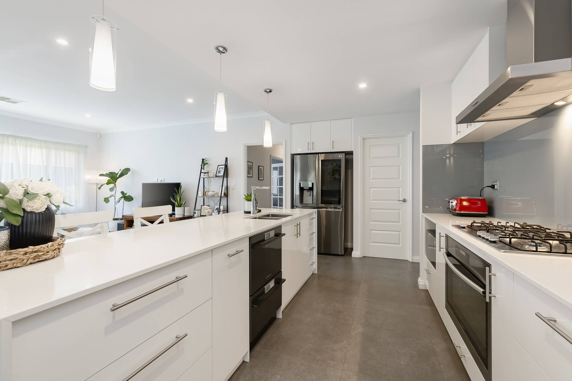 Step inside to a home of light-filled spaces, whitewashed walls, a neutral palette, functional layout and stylish fittings throughout. A generous, open plan living, kitchen and dining areas lies at the heart of the home, featuring quality tiled flooring and pendant lights, with sliding doors opening out to the patio, lending a breezy connection to the outdoors.