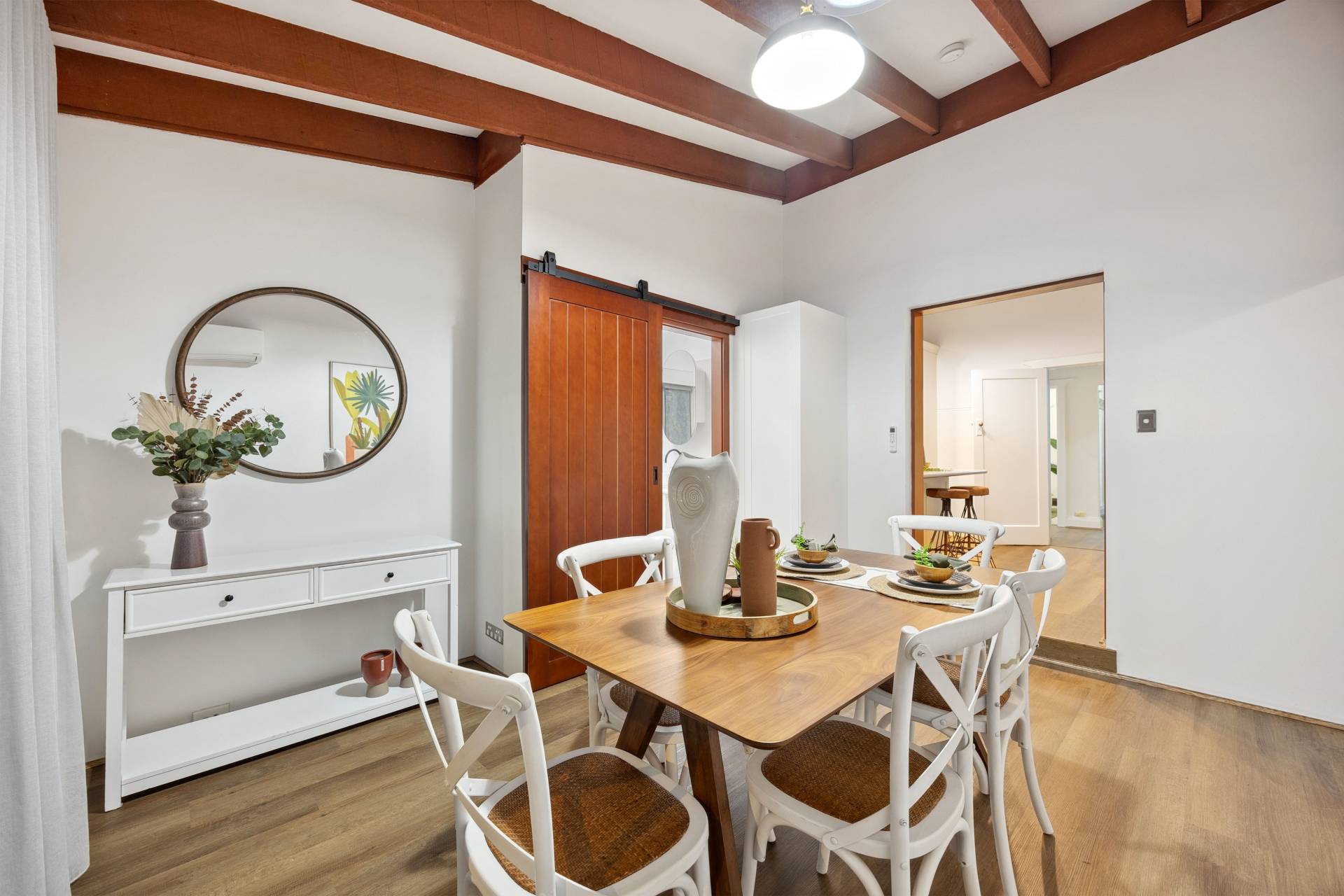 From the moment you step inside, you'll be greeted by a sense of warmth and elegance. The high ornate ceilings and original fireplace pay homage to the home's rich history, while fresh paint and new hybrid flooring bring a refreshed and inviting atmosphere. Adding to the home's rustic appeal, polished barn doors have been incorporated, blending seamlessly with its modern yet classic aesthetic.
