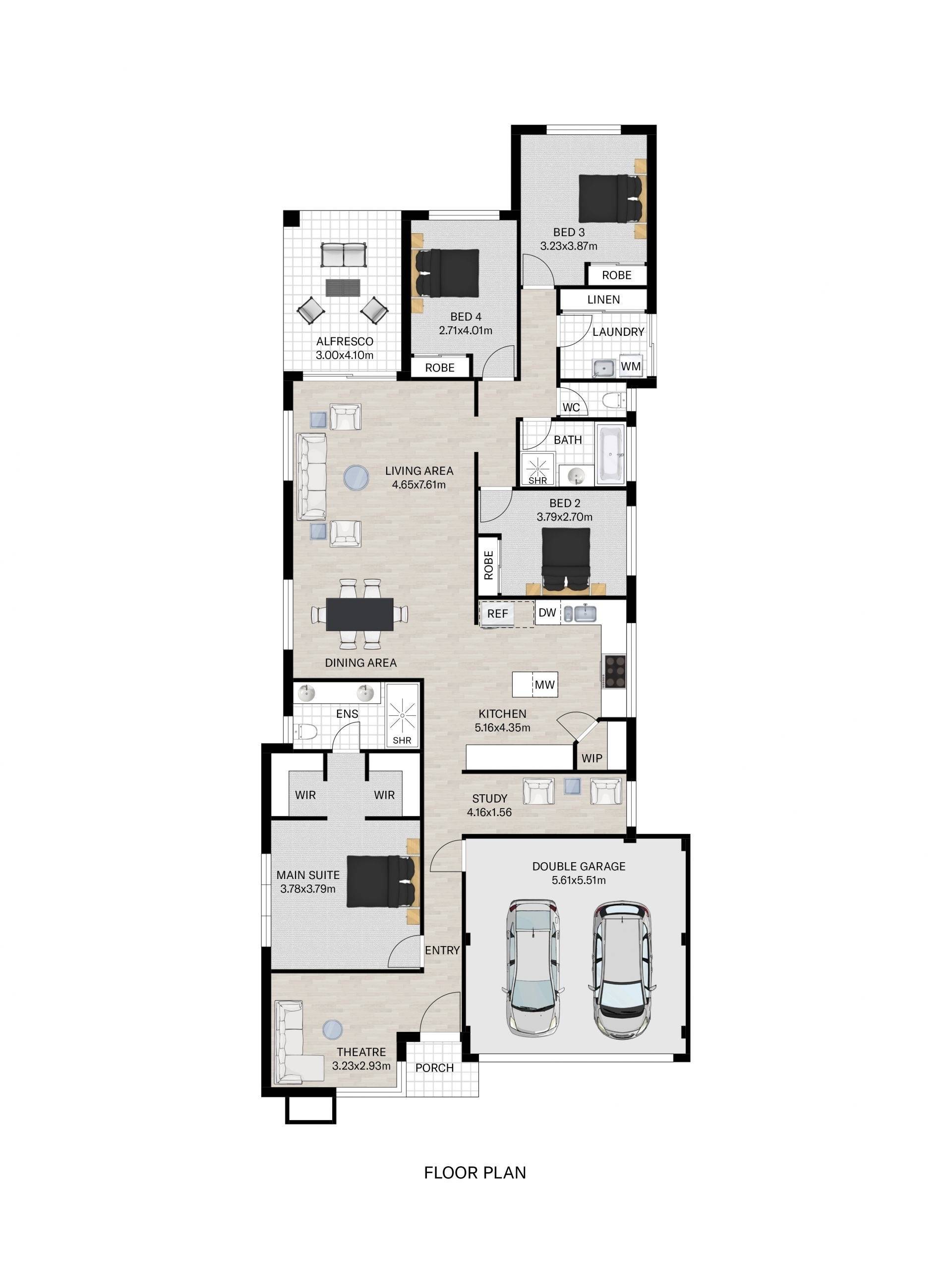Further along the hallway lies the main bedroom, a sumptuous space with his and hers walk-in robes and a sleek ensuite with double basins. A study across the hall accommodates the home worker with a private space or a quiet study room for the kids while the open-plan living, kitchen and dining zone lies at the heart of the home, where a functional design allows the whole family to come together into a welcoming space with plenty of room for all.