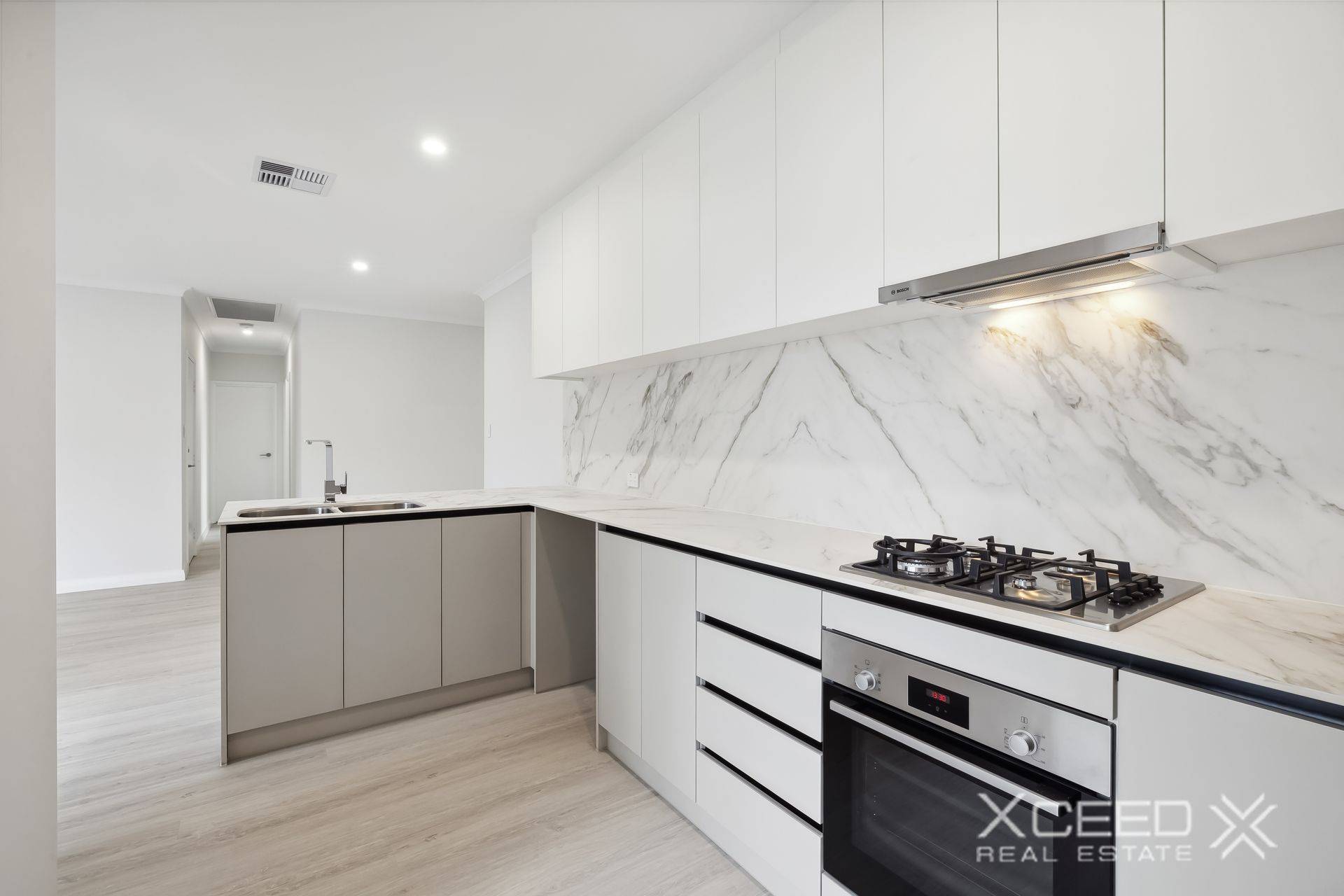 - Modern stainless-steel range-hood, gas-cooktop and under-bench-oven appliances in the kitchen