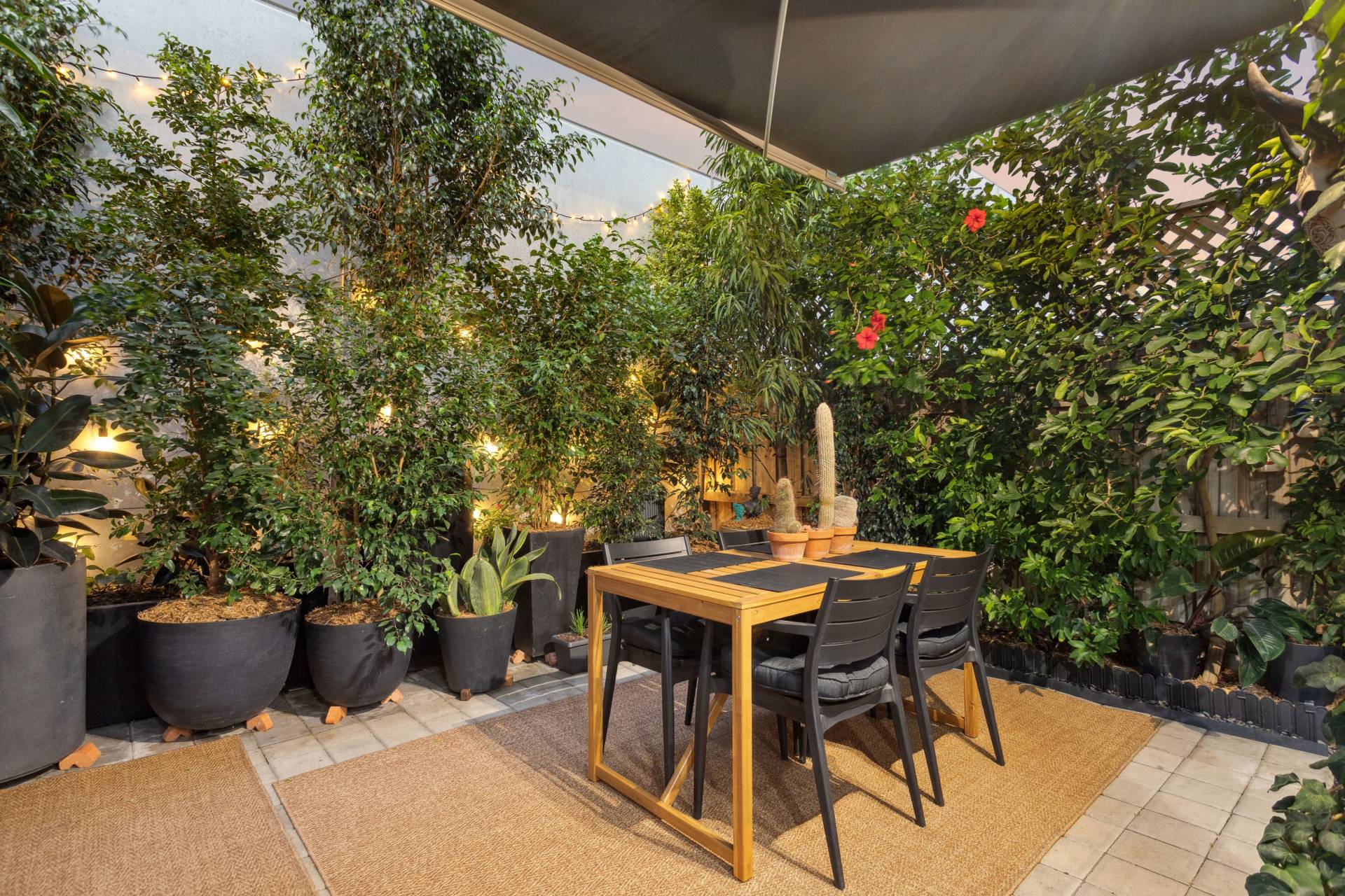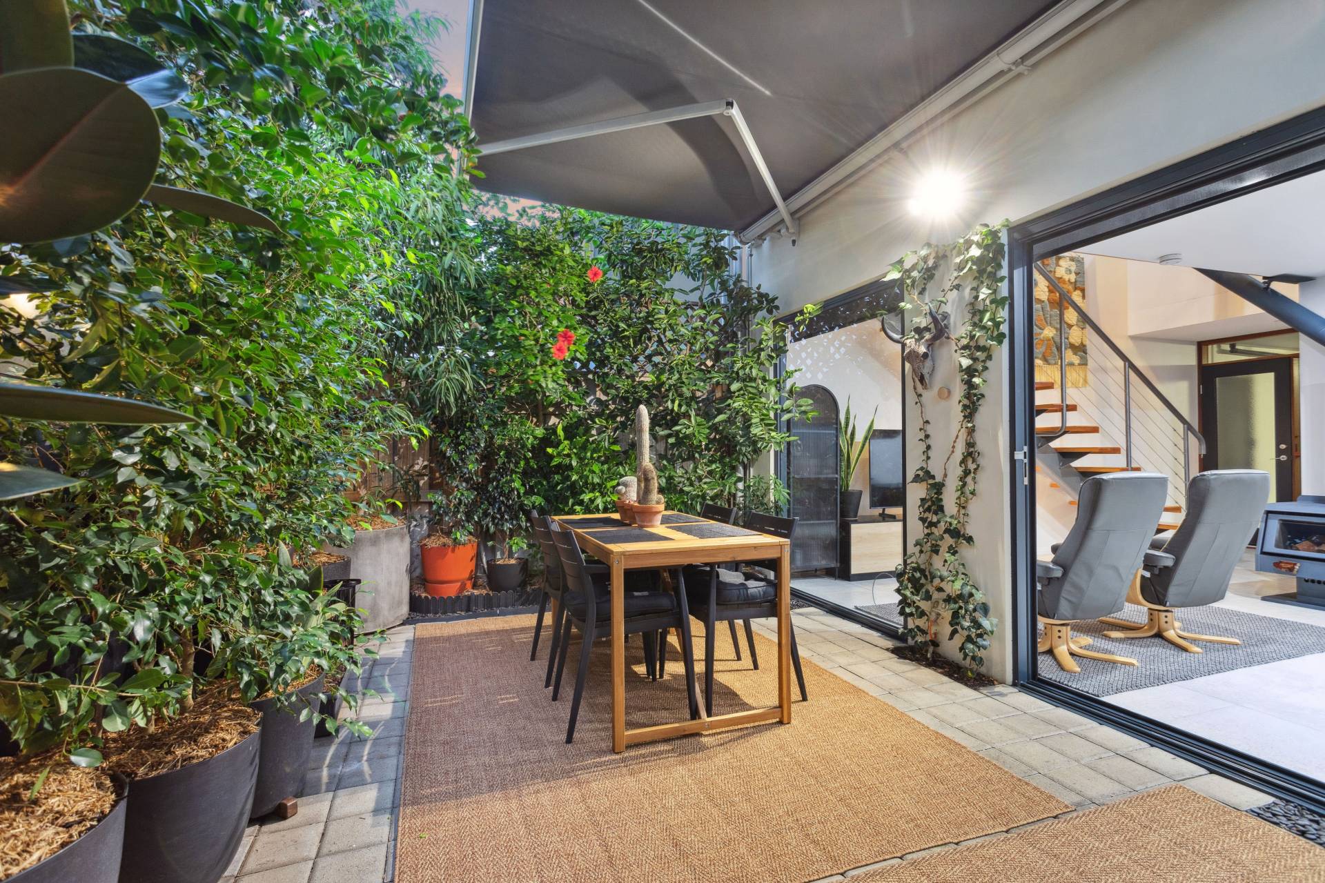 • Outdoor area with lush plants and Kenlow electric awning