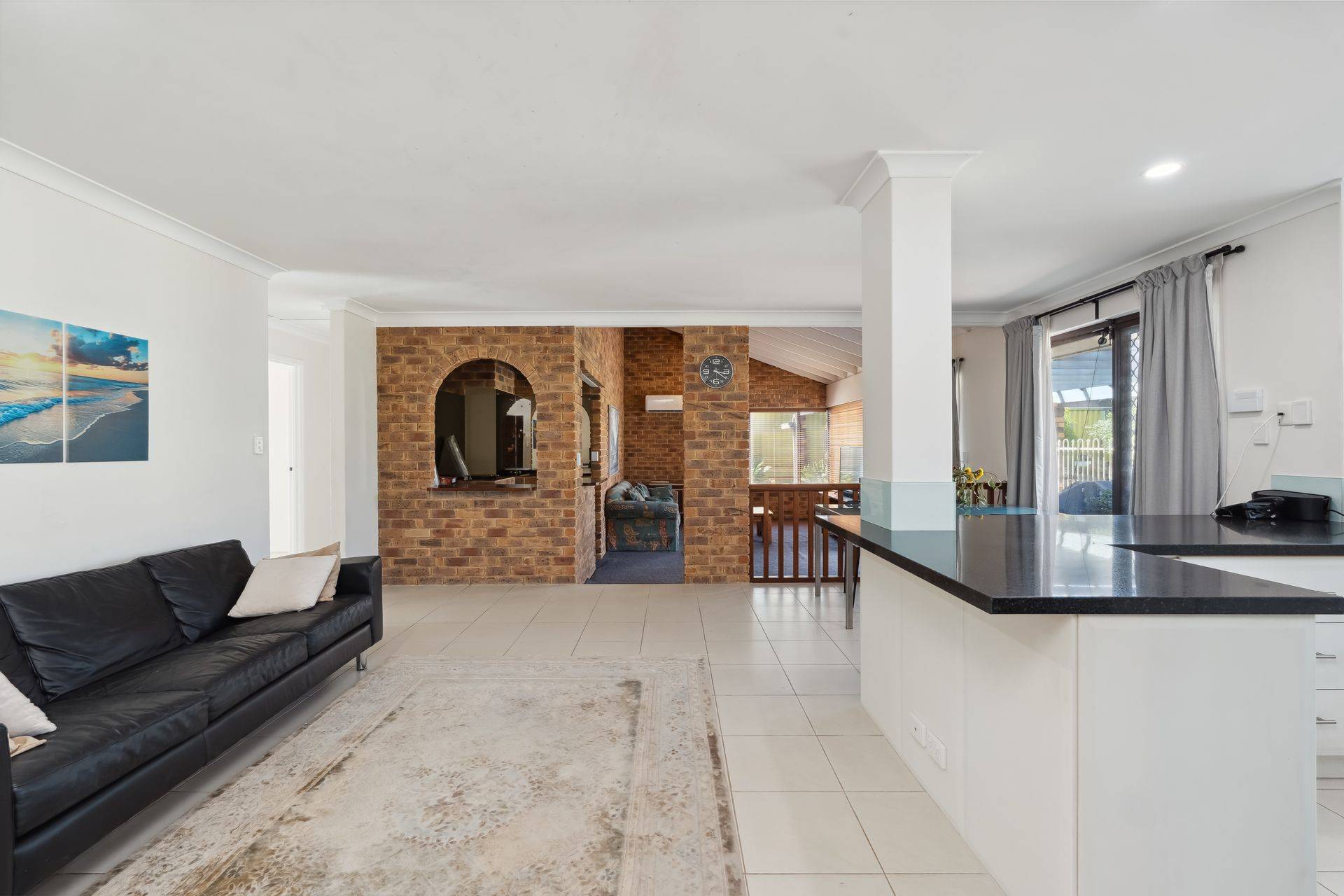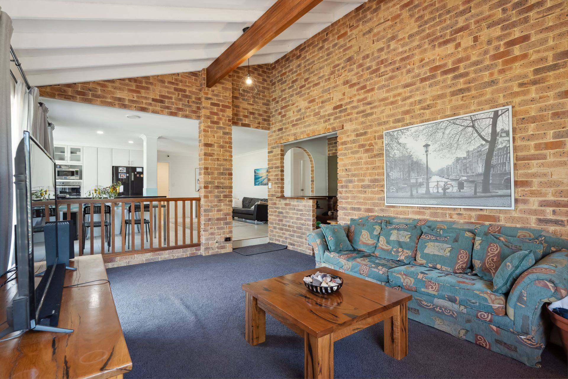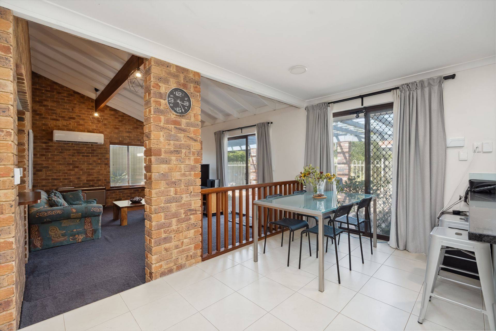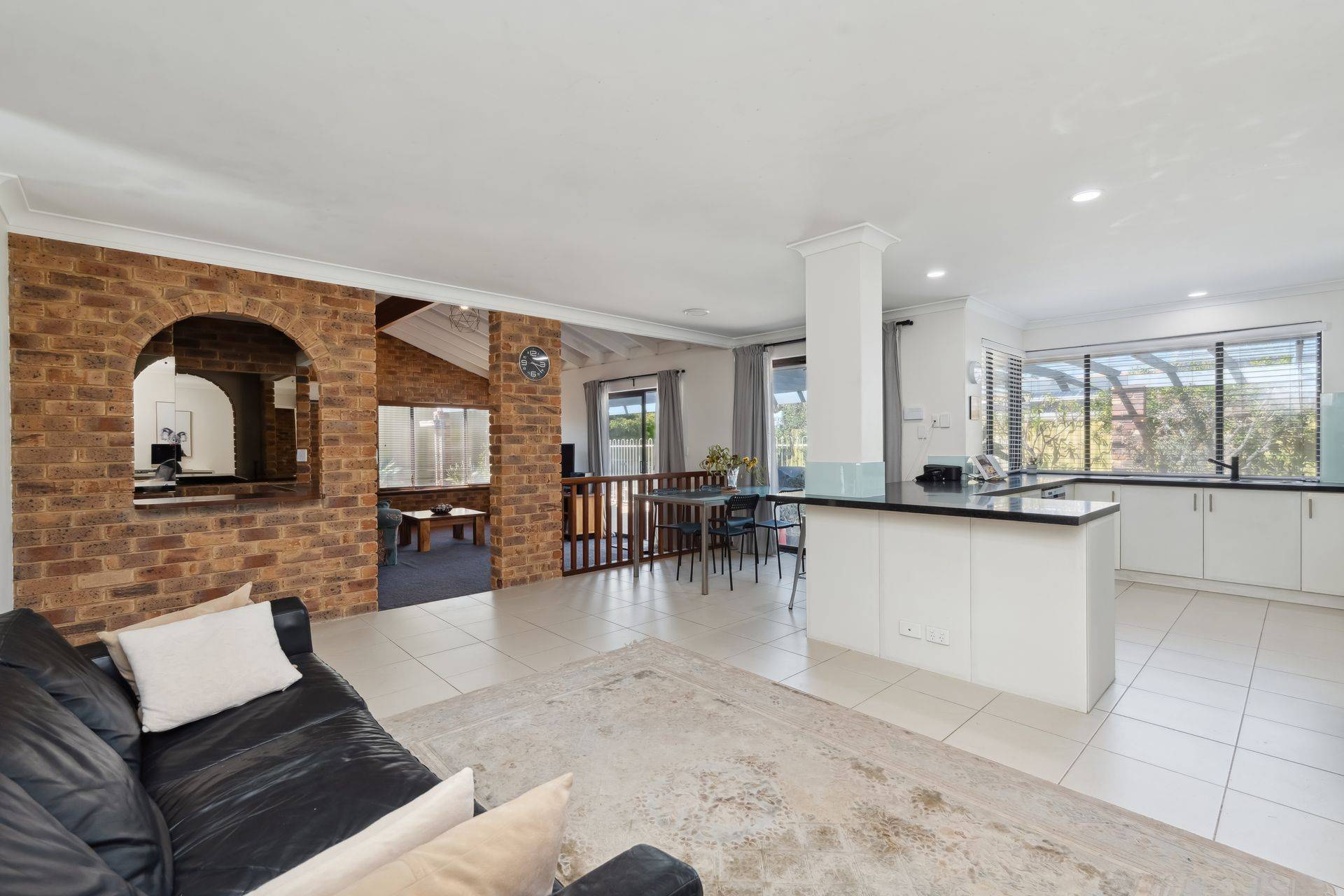 At the heart of the home, the updated kitchen features granite benchtops, quality appliances, and beautiful outlook to the rear garden and swimming pool. An abundance of natural light flows through to the open plan dining area and a sophisticated living room with feature bar, complete with high vaulted timber ceiling and exposed brick, designed for both relaxation and entertaining.