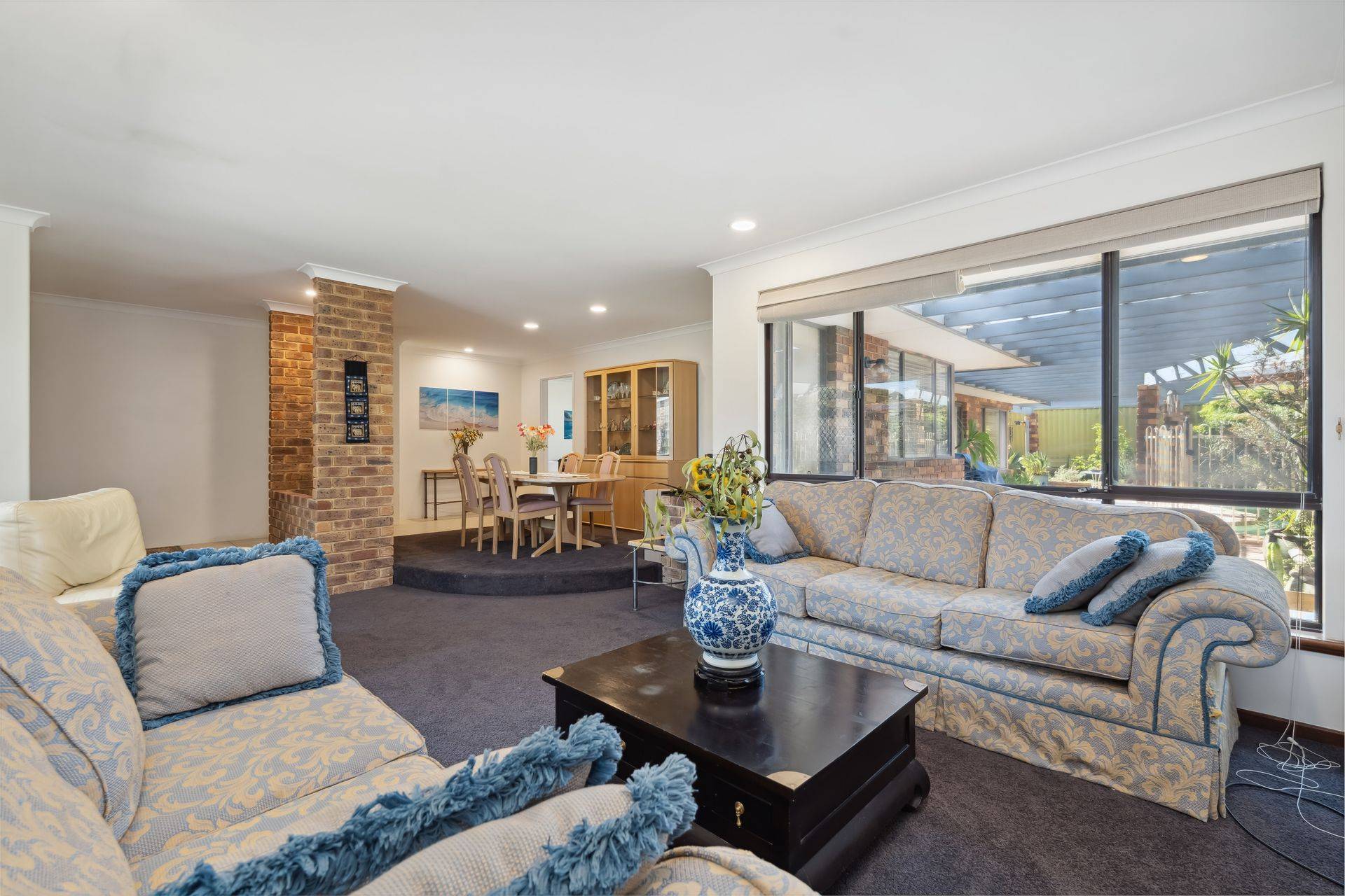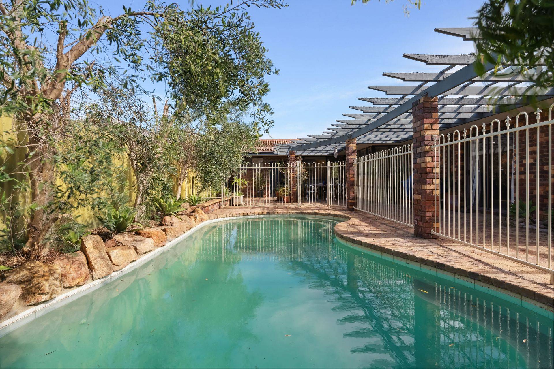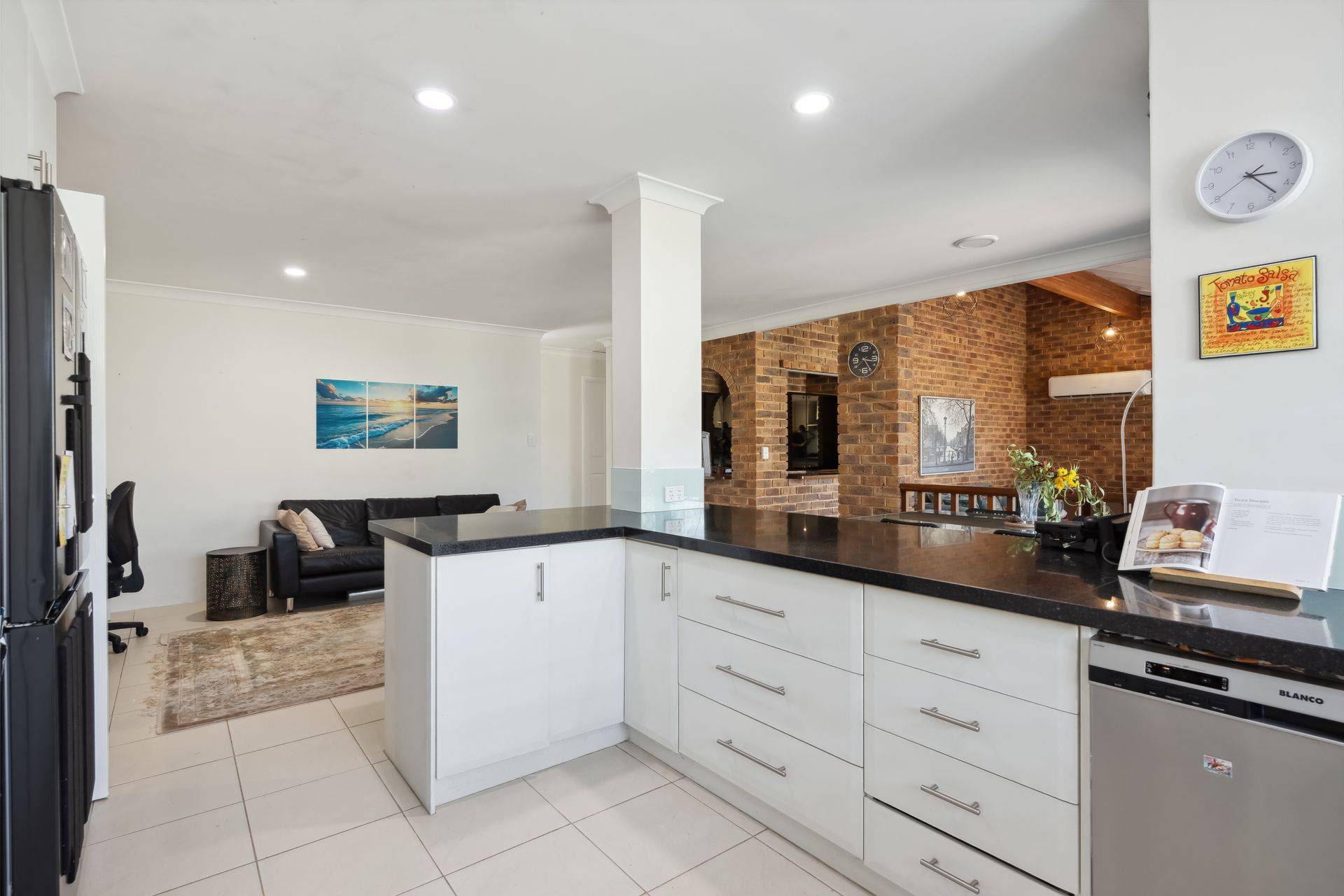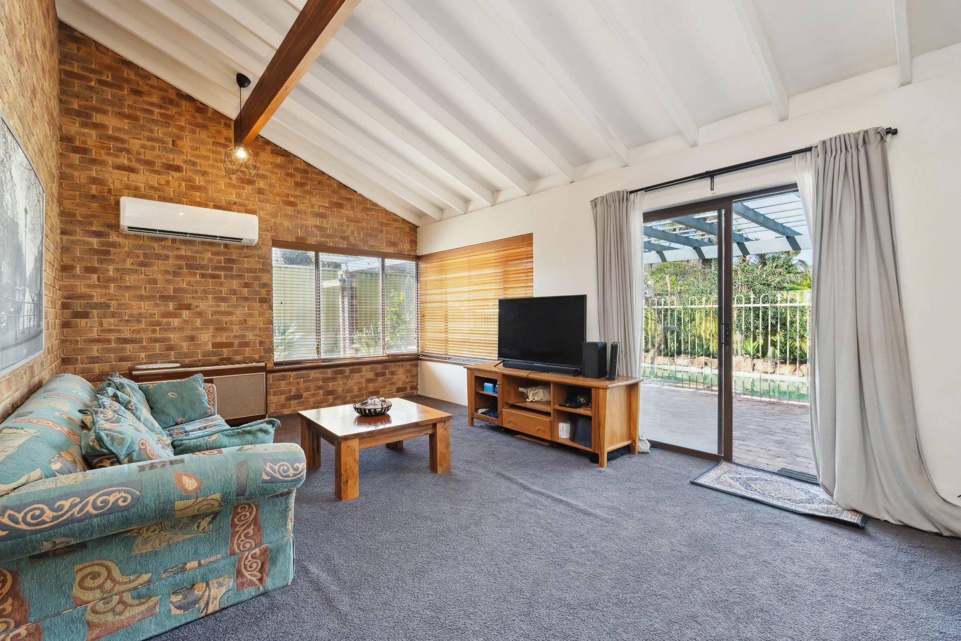 At the heart of the home, the updated kitchen features granite benchtops, quality appliances, and beautiful outlook to the rear garden and swimming pool. An abundance of natural light flows through to the open plan dining area and a sophisticated living room with feature bar, complete with high vaulted timber ceiling and exposed brick, designed for both relaxation and entertaining.