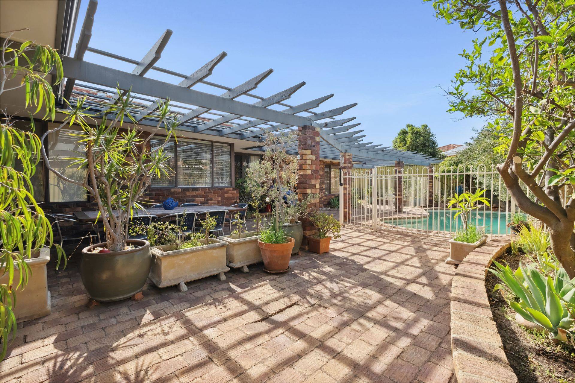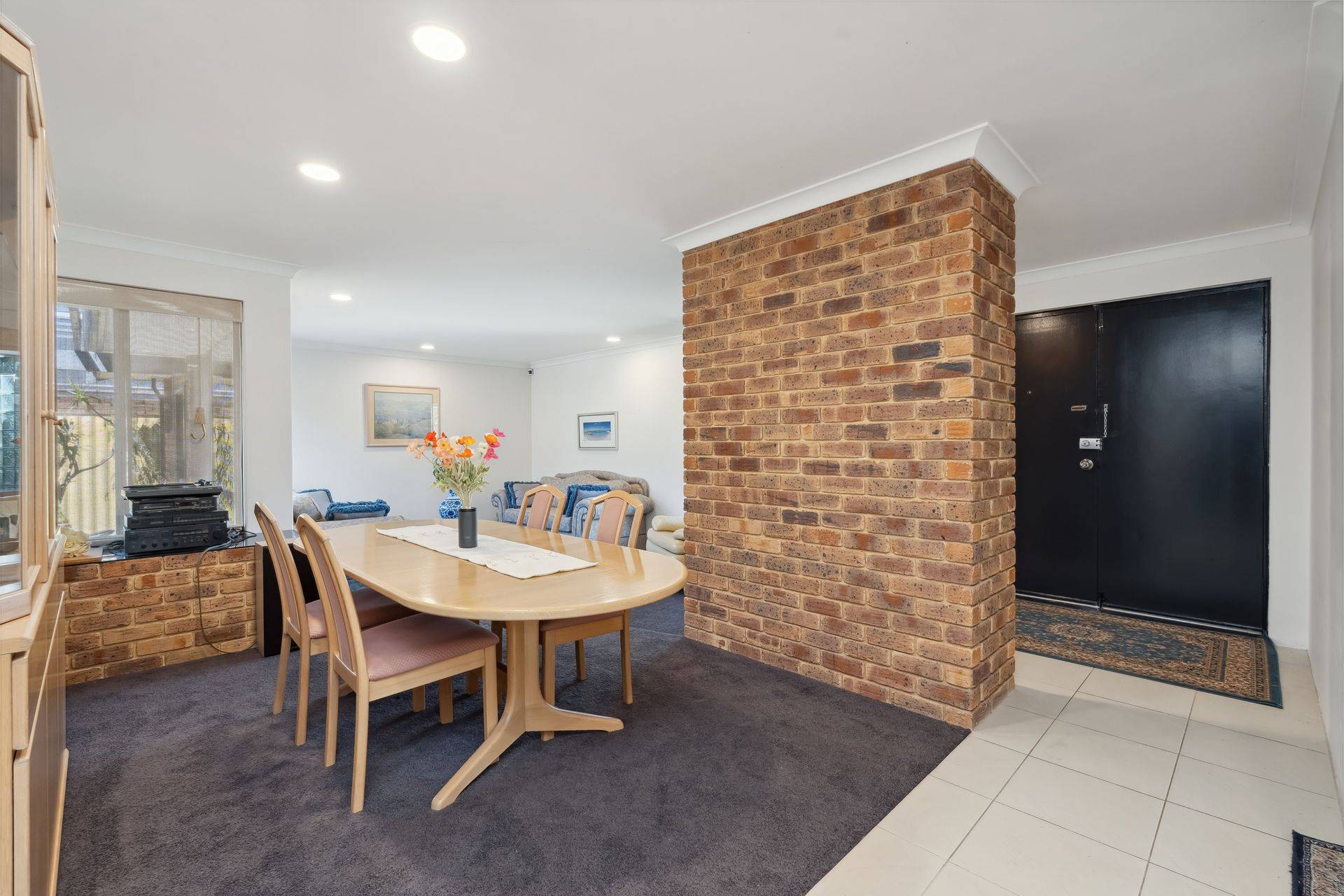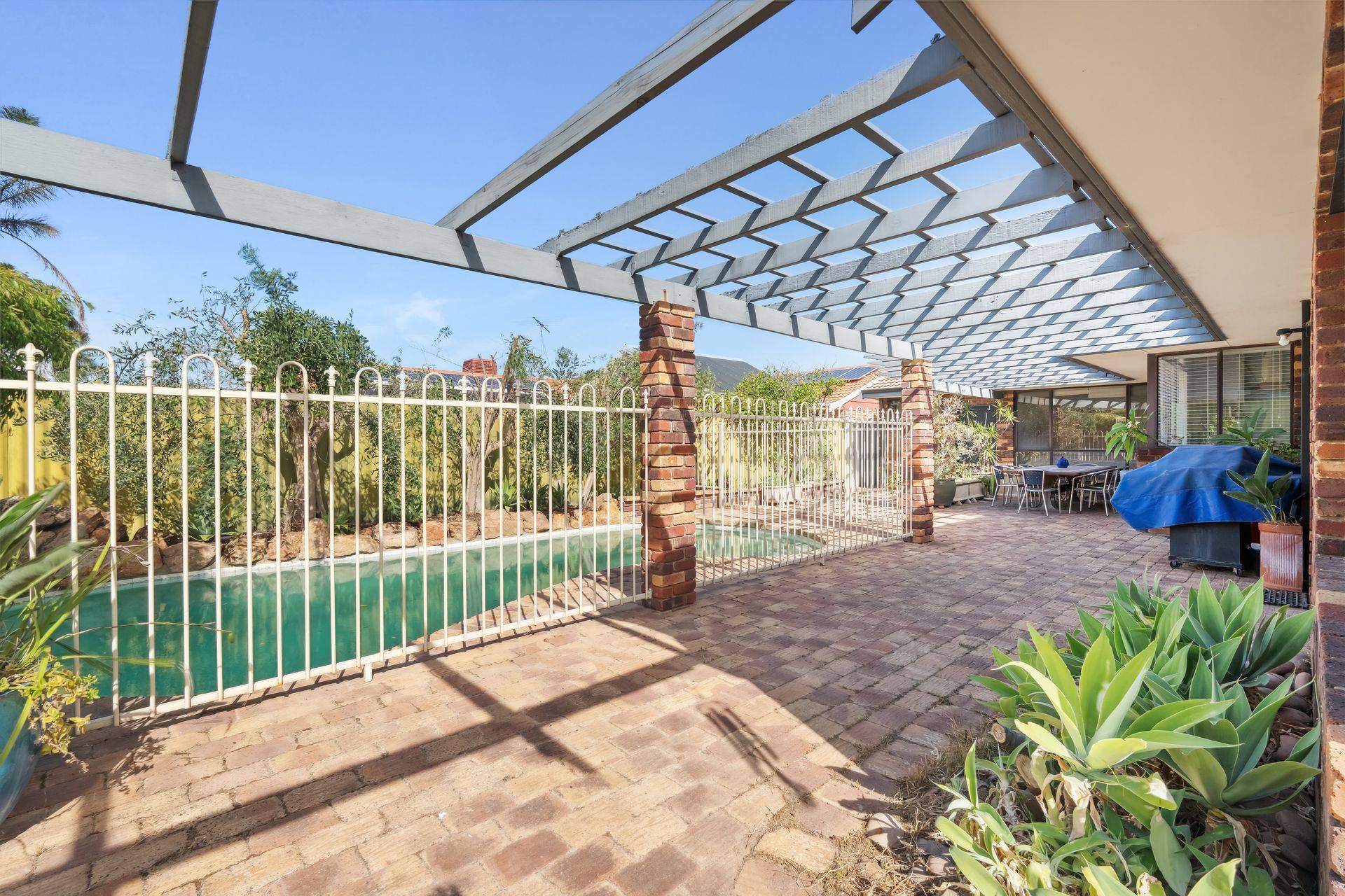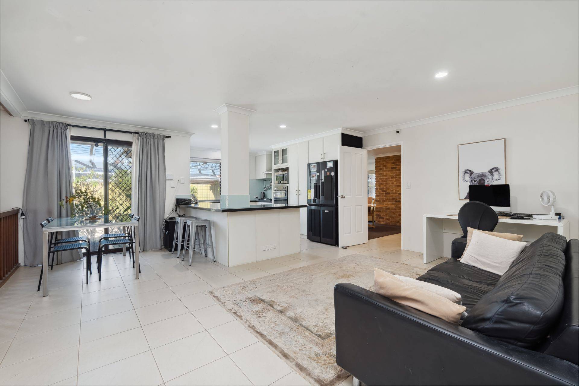 At the heart of the home, the updated kitchen features granite benchtops, quality appliances, and beautiful outlook to the rear garden and swimming pool. An abundance of natural light flows through to the open plan dining area and a sophisticated living room with feature bar, complete with high vaulted timber ceiling and exposed brick, designed for both relaxation and entertaining.