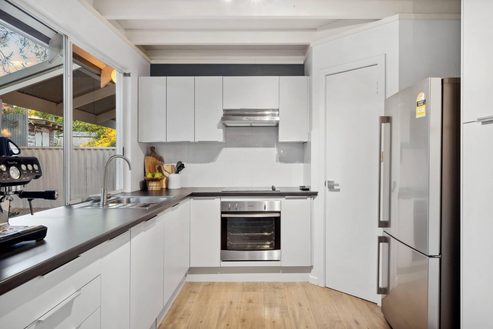 Inside, the open-plan kitchen, living, and dining area boasts exposed timber beams, high ceilings and quality hybrid flooring, enhancing the home's spacious and airy feel. A standout feature is the kitchen's large window, which frames a picturesque outlook of the surrounding greenery, making meal preparation a delight. Double glass doors lead you outside to your very own tranquil oasis, shaded by beautiful trees, the perfect place to entertain or wind down and listen to the sounds of nature!