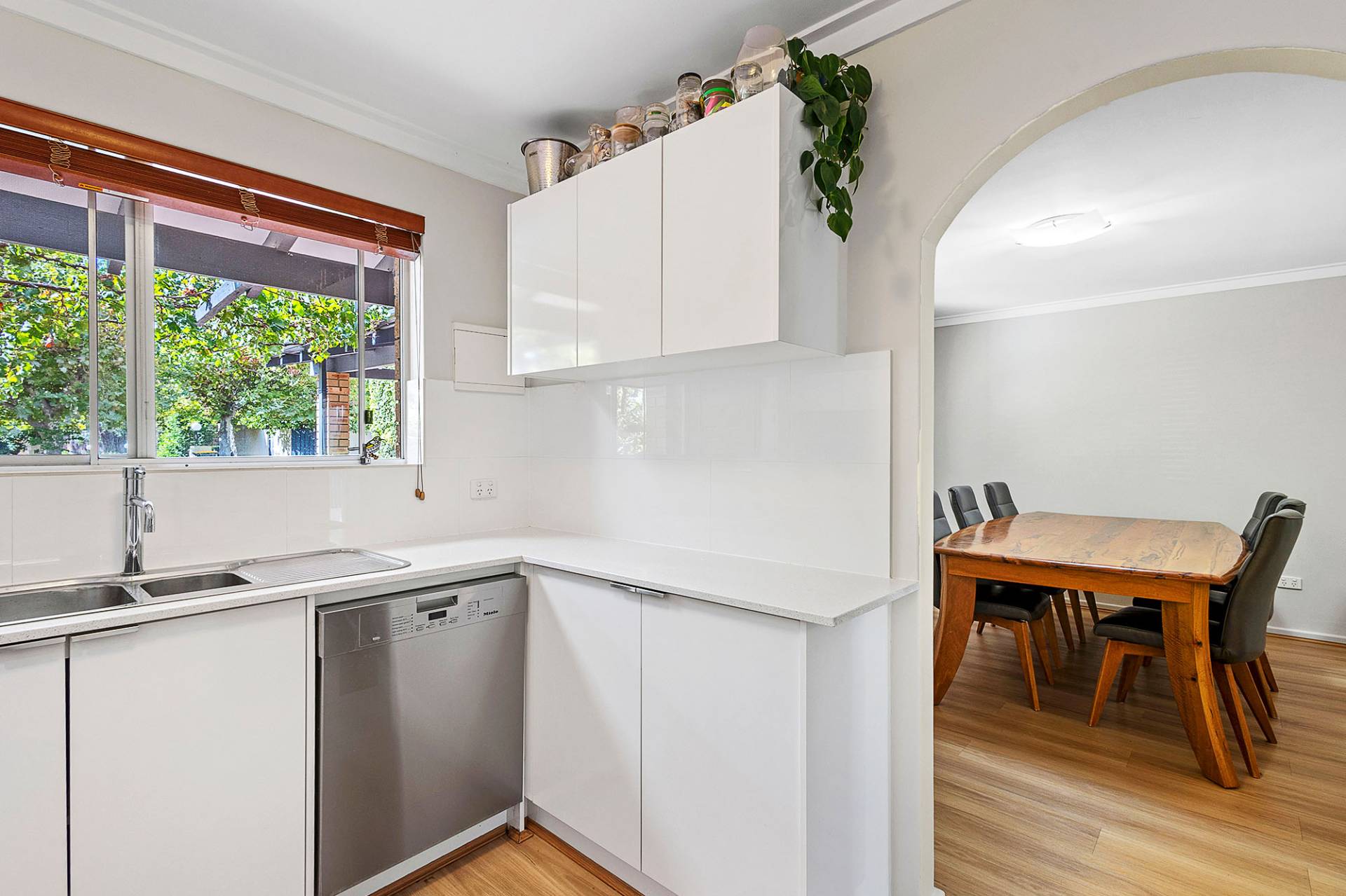 The beautifully renovated kitchen is complete with stone benchtops, Smeg and Miele appliances and ample storage.
