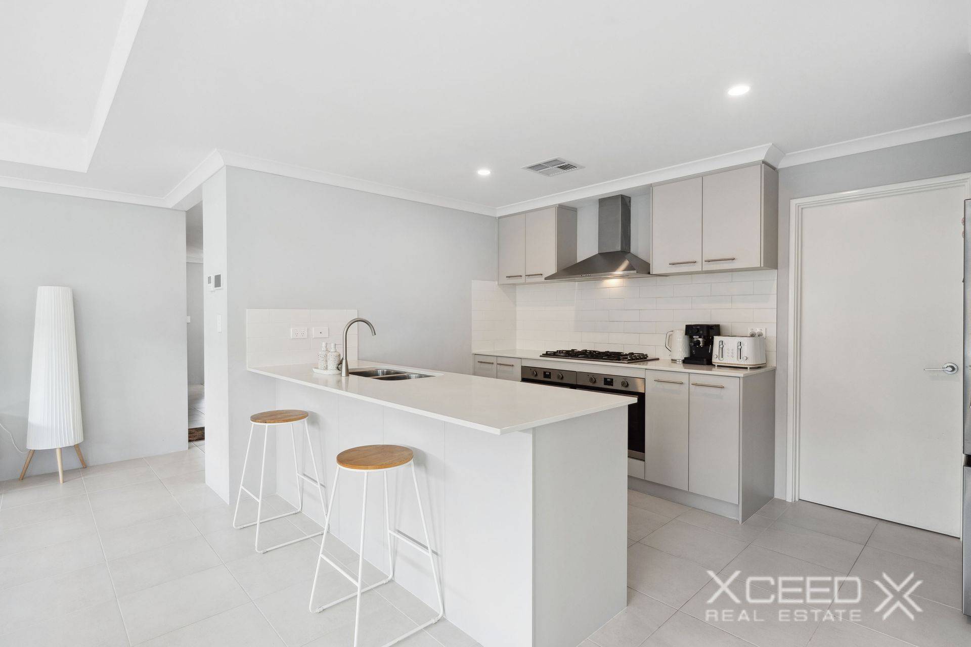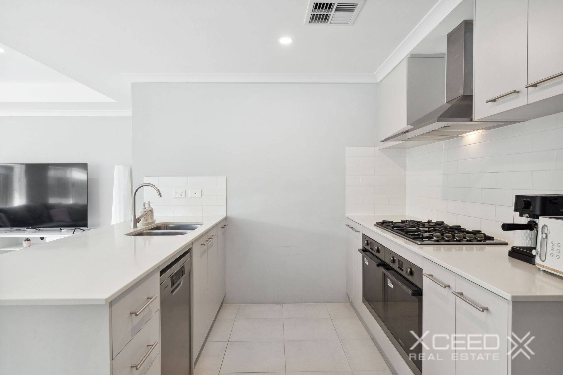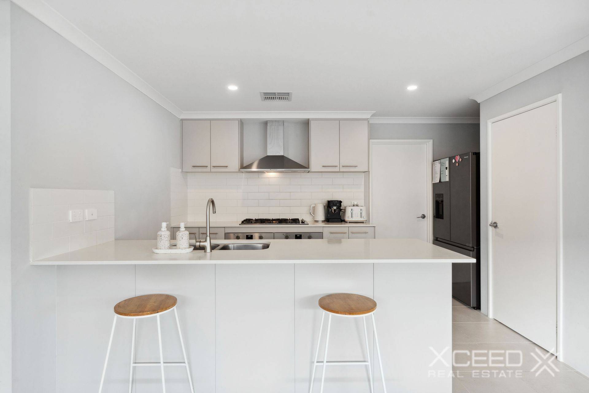 The airy and functional open-plan family, dining and kitchen area is also impeccably tiled and boasts a feature recessed ceiling of its own, alongside sparkling stone bench tops, a breakfast bar, double sinks, subway-tile splashbacks, double ovens and exceptional stainless-steel range-hood, gas-cooktop and dishwasher appliances.