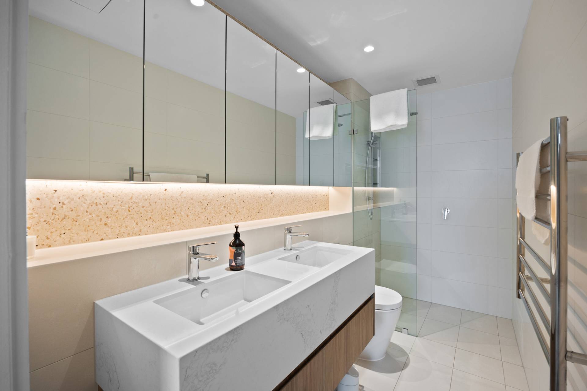 • Luxury main bathroom with full height tiling and mirrors with built in storage
