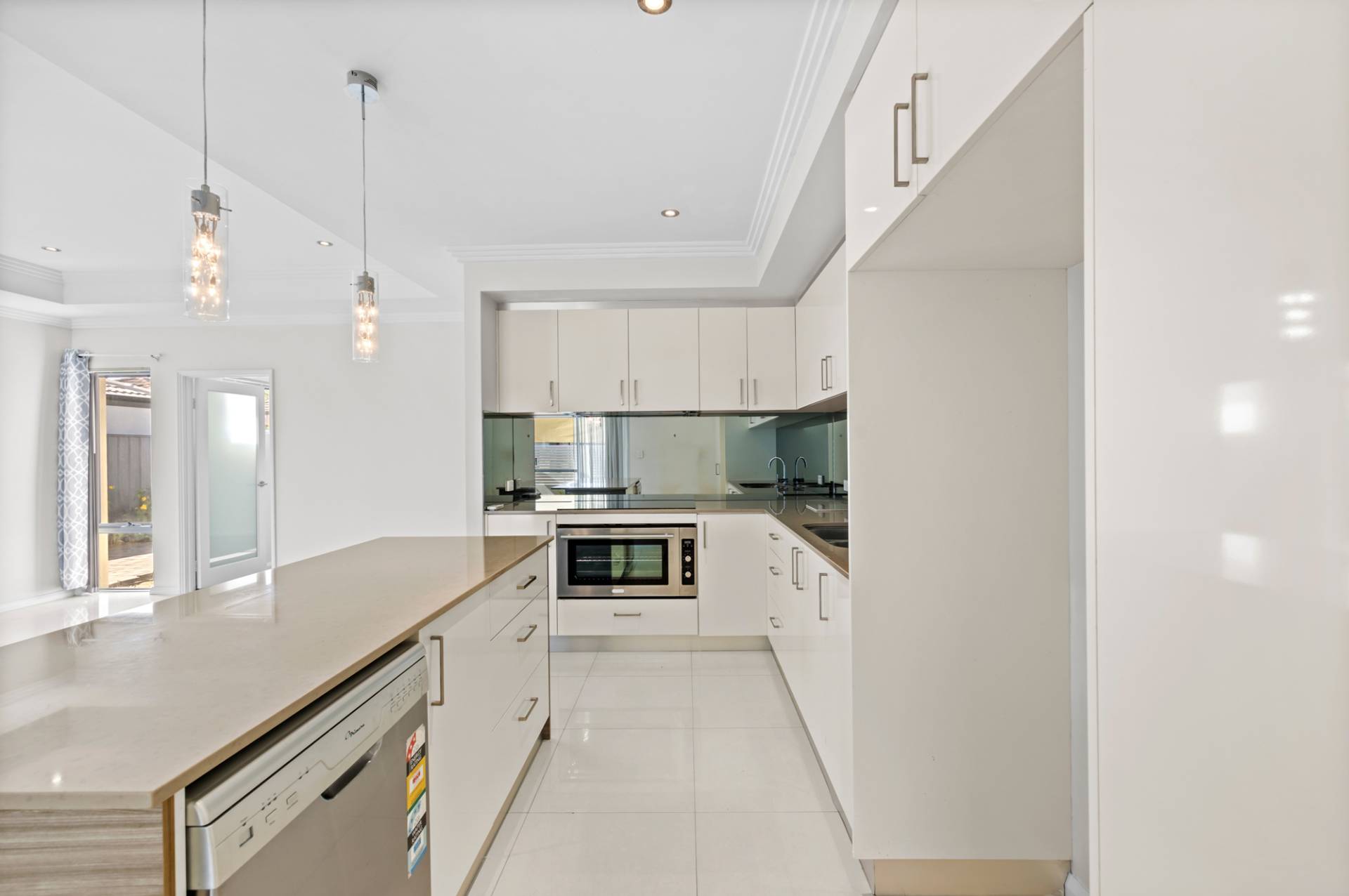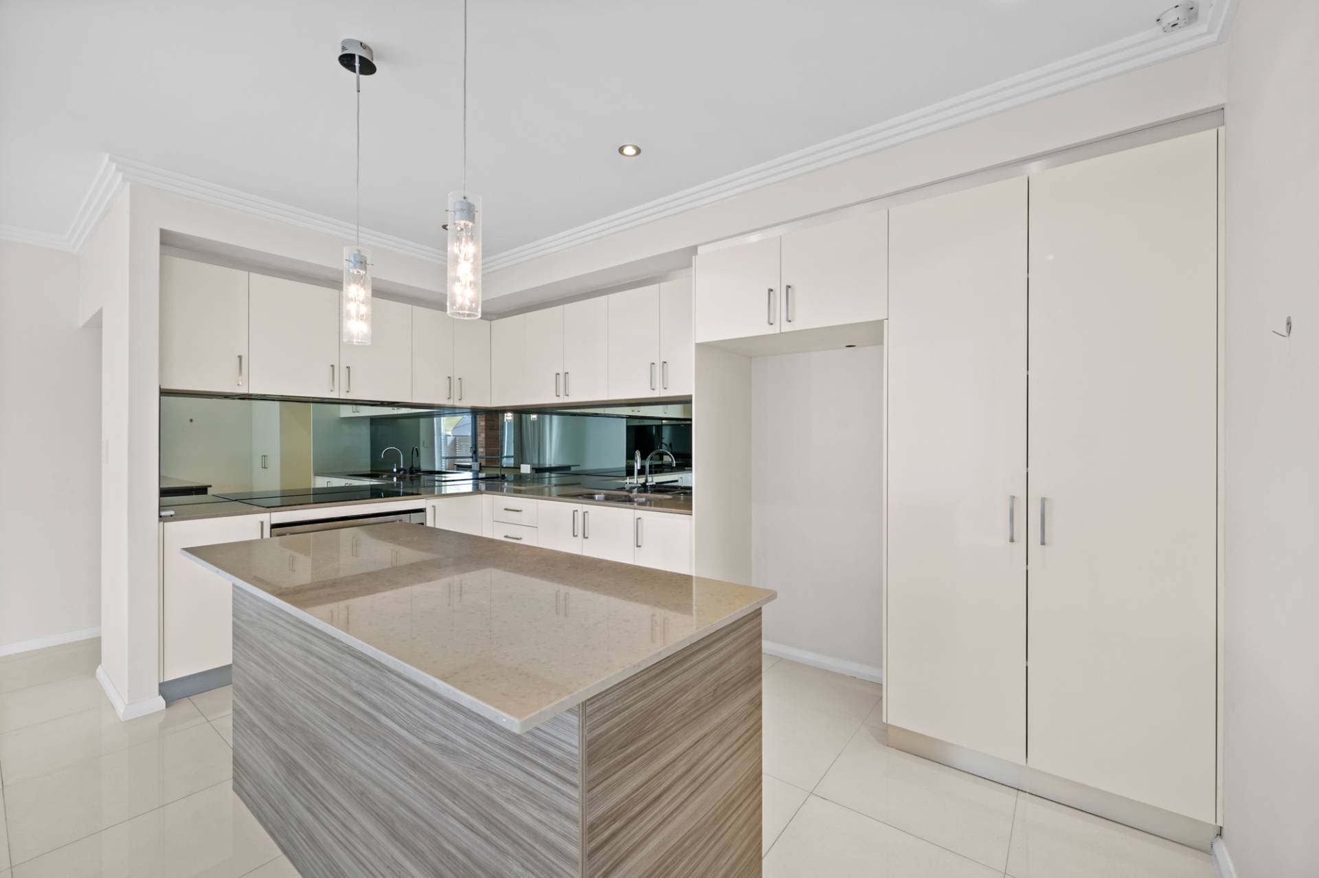 • Modern kitchen with Island benchtop, mirrored splashback and quality appliances