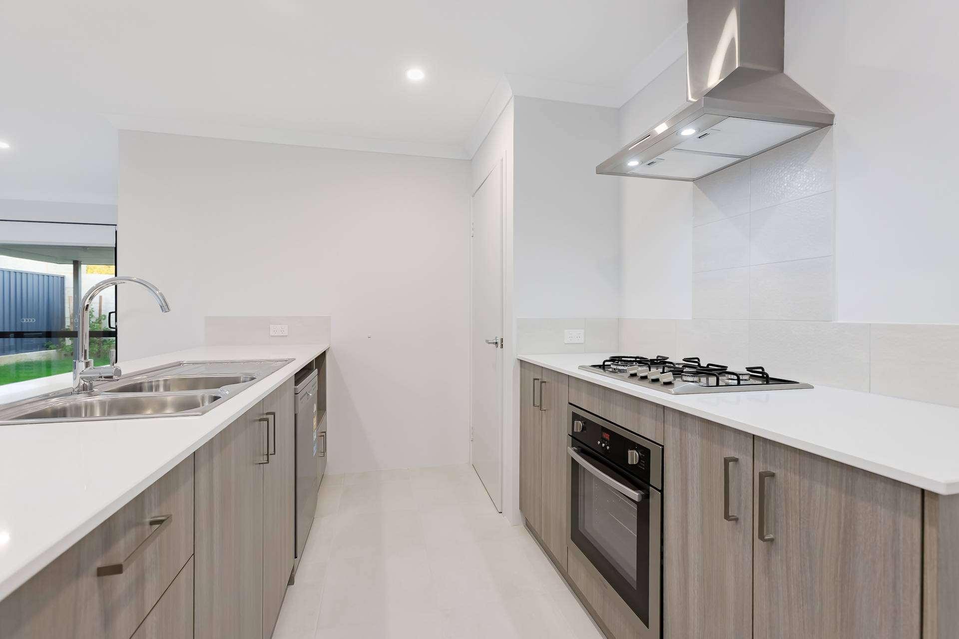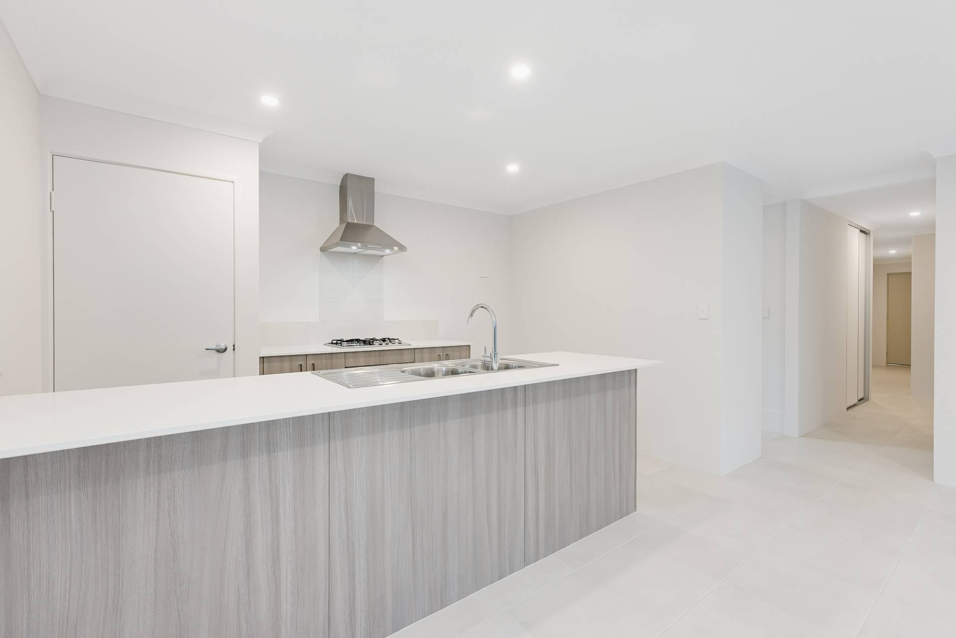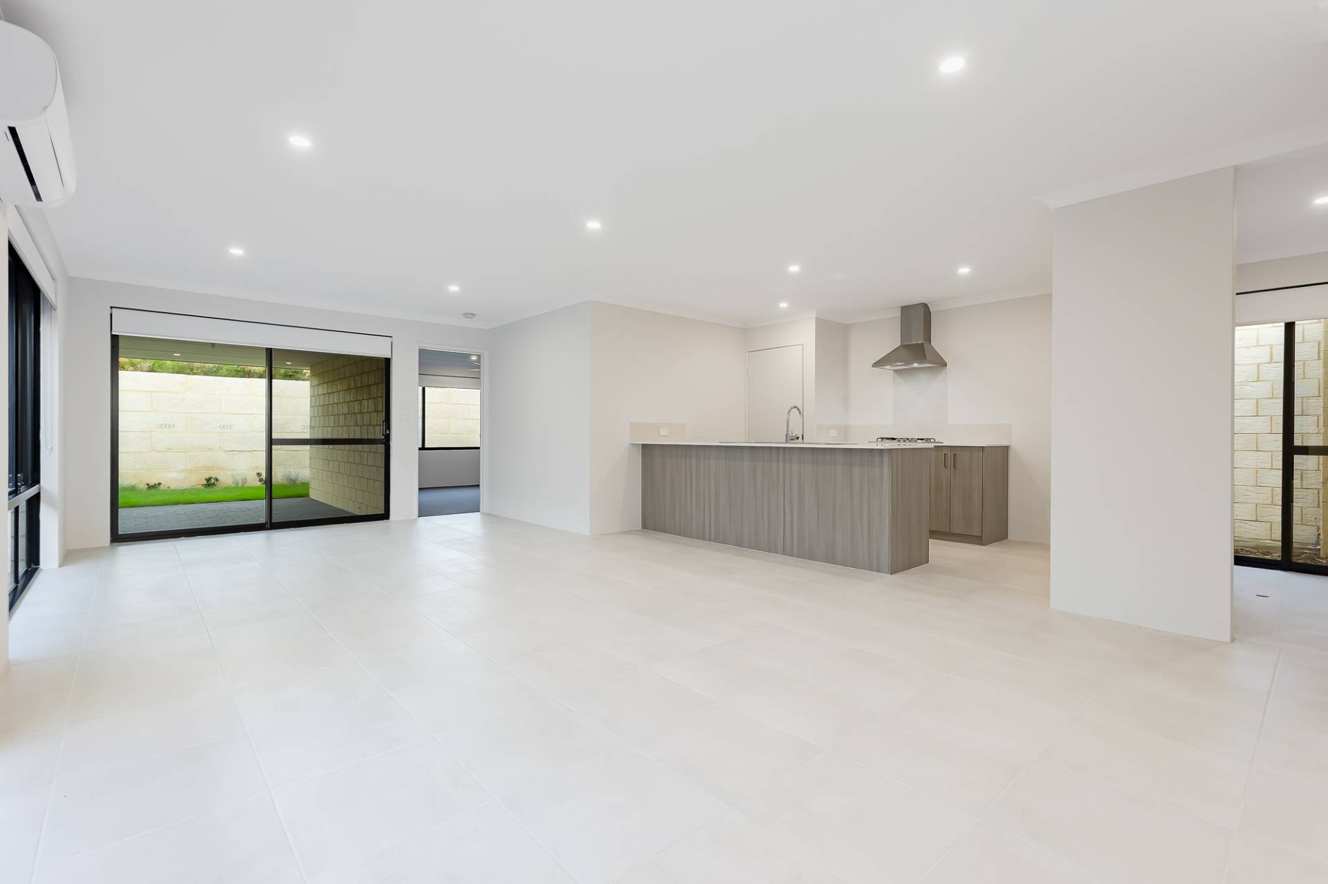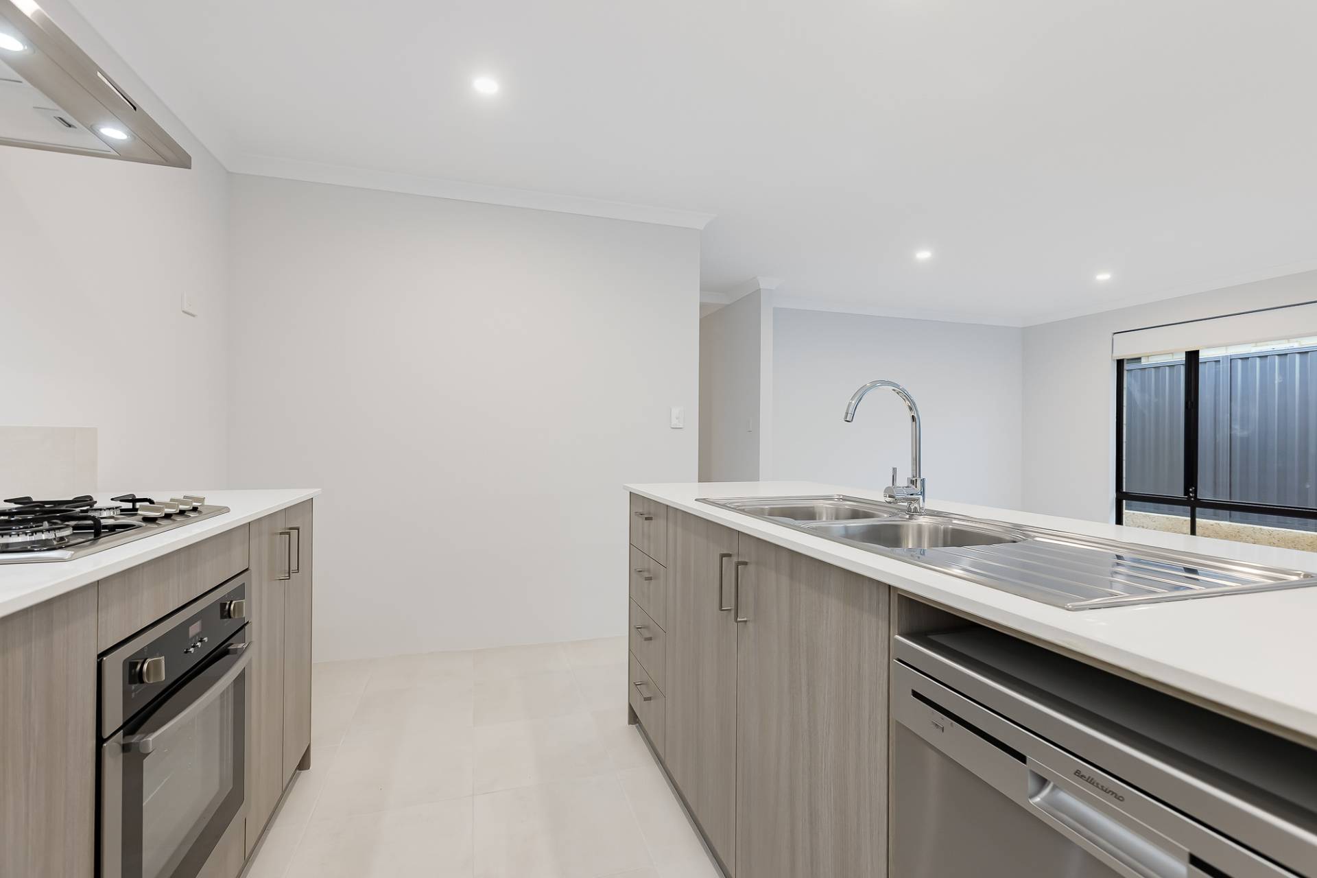 The modern kitchen is equipped with a gas cooktop and oven, stone benchtops, and a sit-up breakfast bar, flowing effortlessly into the open-plan living area and extending to the alfresco space, ideal for entertaining.