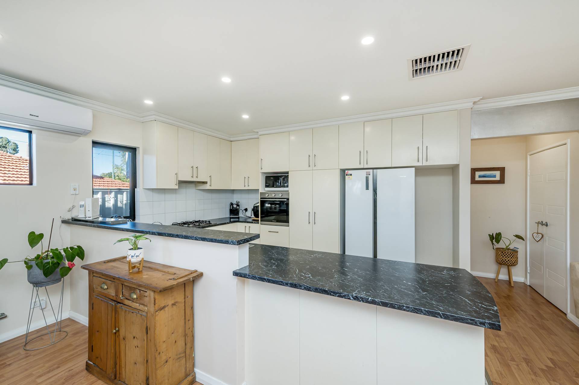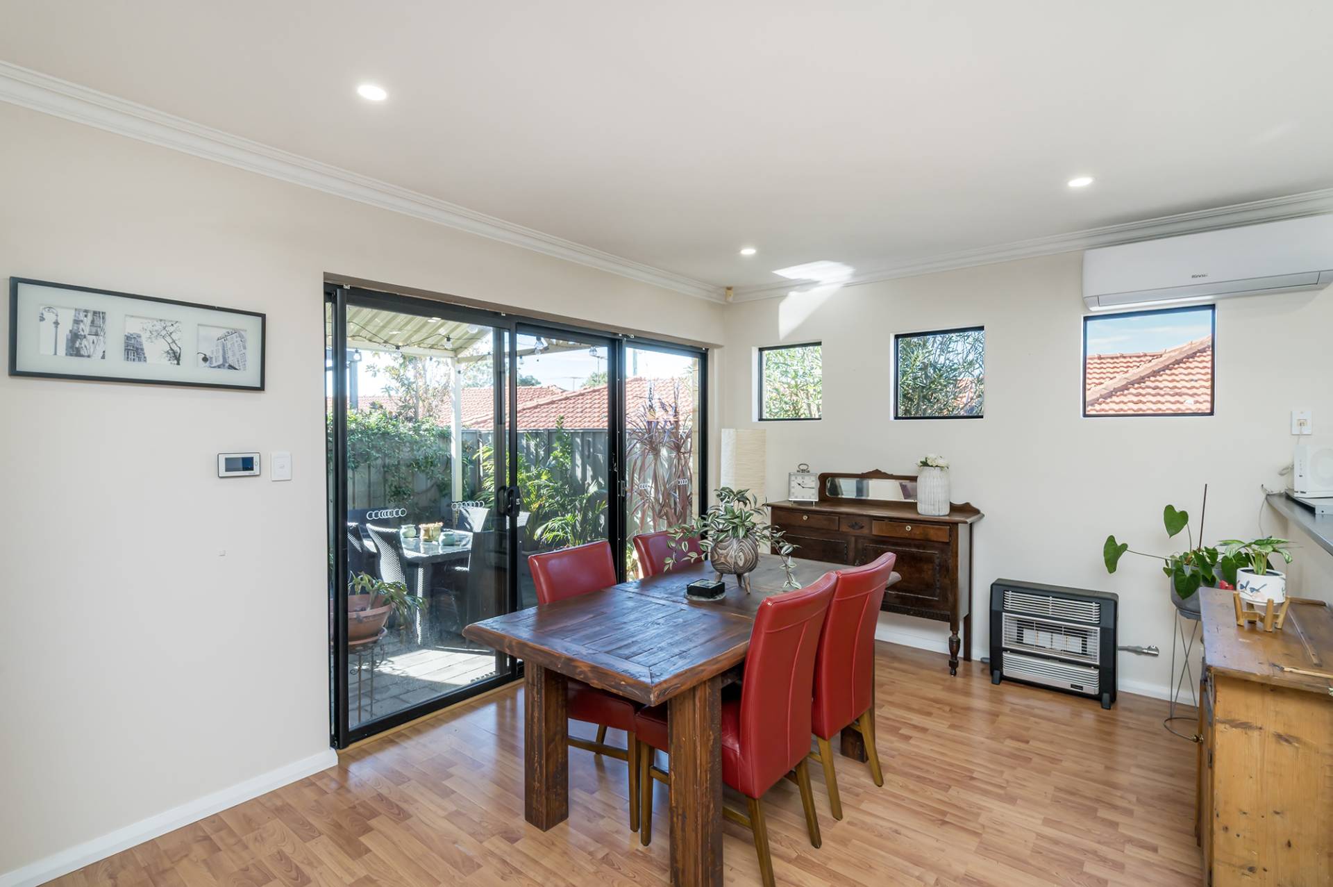 Split system & ducted air conditioning in the main living areas provides year-round comfort, and with sliding doors opening out onto a sunny paved courtyard, you have a gorgeous flow between interior and exterior spaces, plus the ideal alfresco zone for both shared family meals and hosting guests.