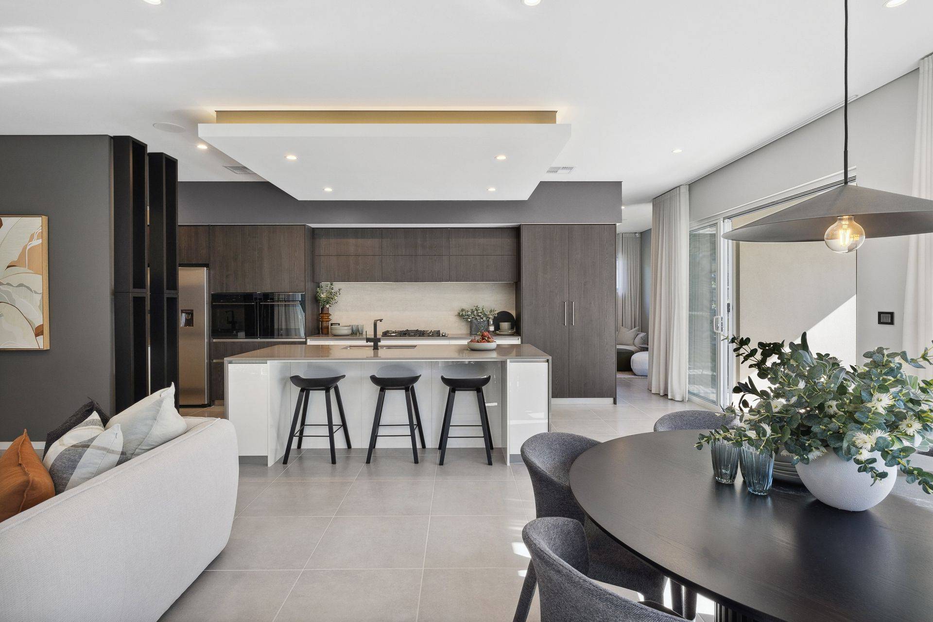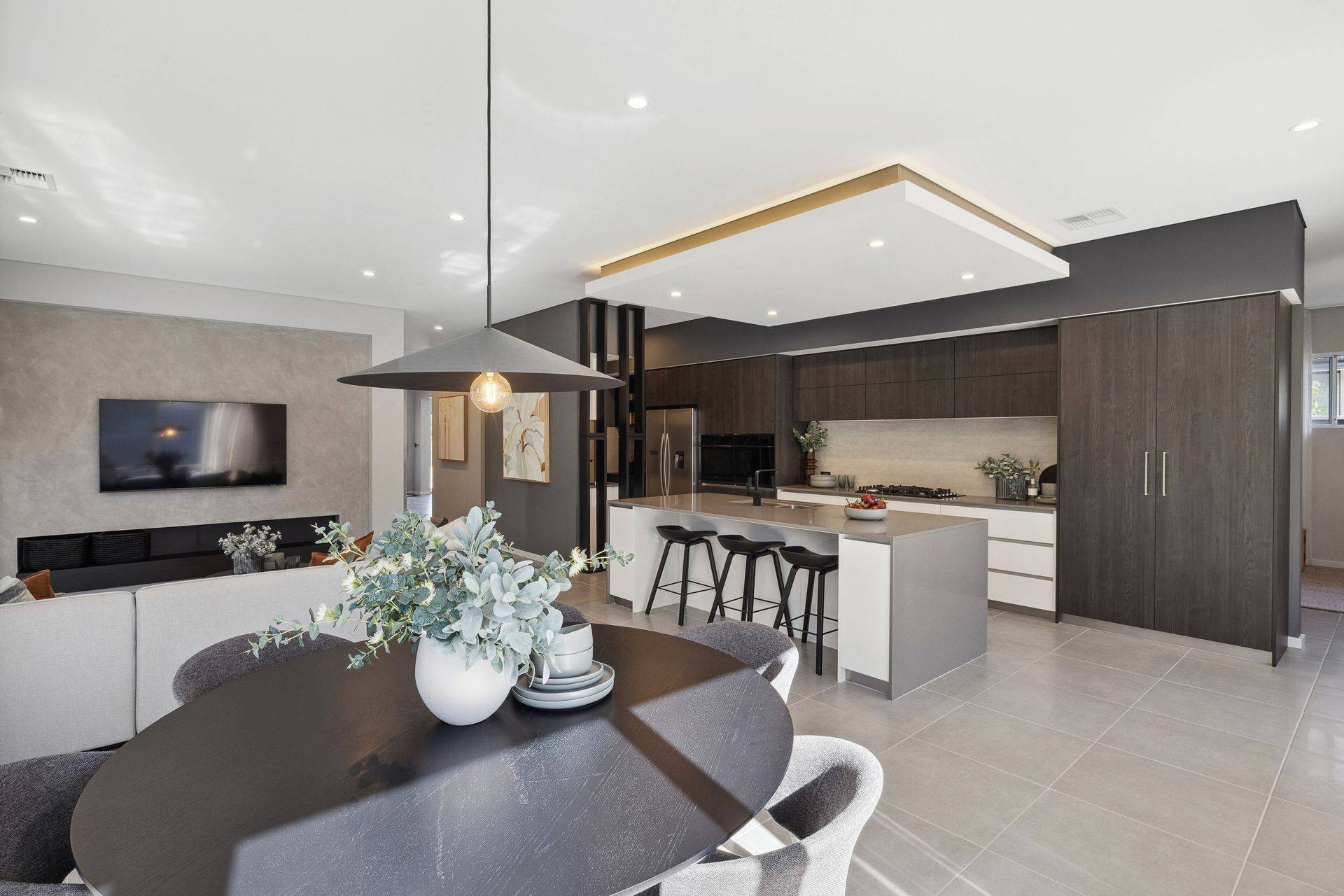 The home's expansive open-plan layout combines everyday functionality with statement design. Soaring 34-course ceilings flow through the main living area, sunken theatre, entry, master suite, alfresco, and even the children's activity room—creating a powerful sense of volume, light, and space in every key zone of the home. The garage is also thoughtfully built with a 31c ceiling, adding functionality for larger vehicles or extra storage.