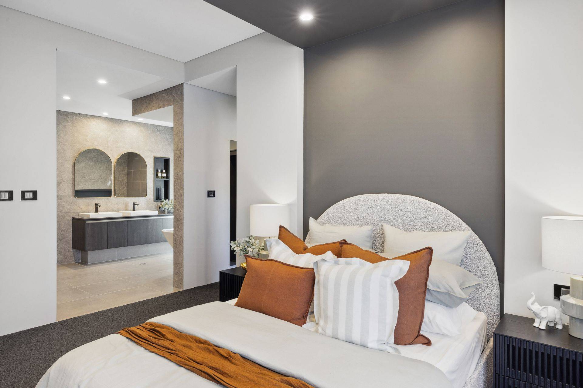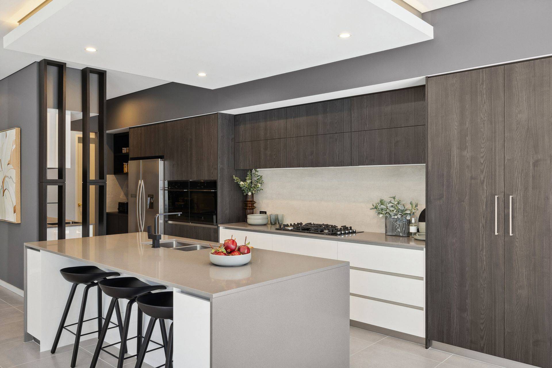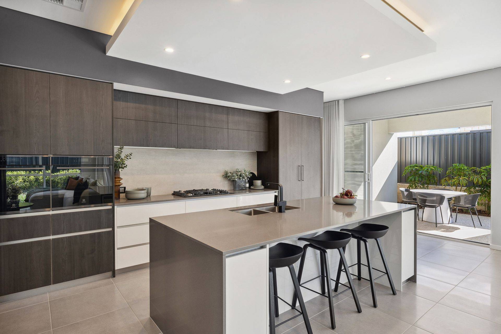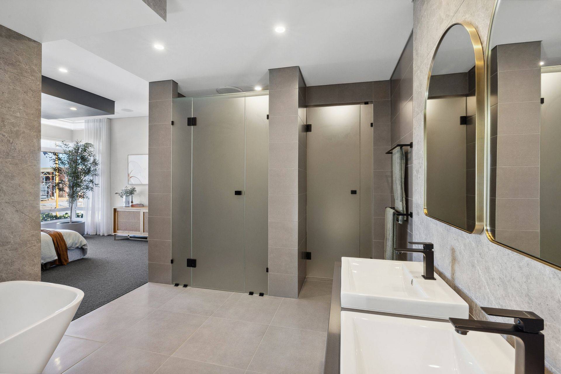 At the heart of the home, the designer kitchen is a showstopper. Featuring a 1200mm-deep stone island bench with waterfall ends, double wall ovens, a 900mm five-burner gas cooktop, integrated rangehood, and a suite of premium cabinetry solutions, it's as beautiful as it is functional. There's lift-up overhead storage, a double laminate pantry, bi-fold appliance cupboard, microwave recess with pot drawers, integrated cutlery compartments, and a pull-out bin—all seamlessly tied together with European-style tapware, soft-close drawers, and custom cabinetry finishes of your choice.