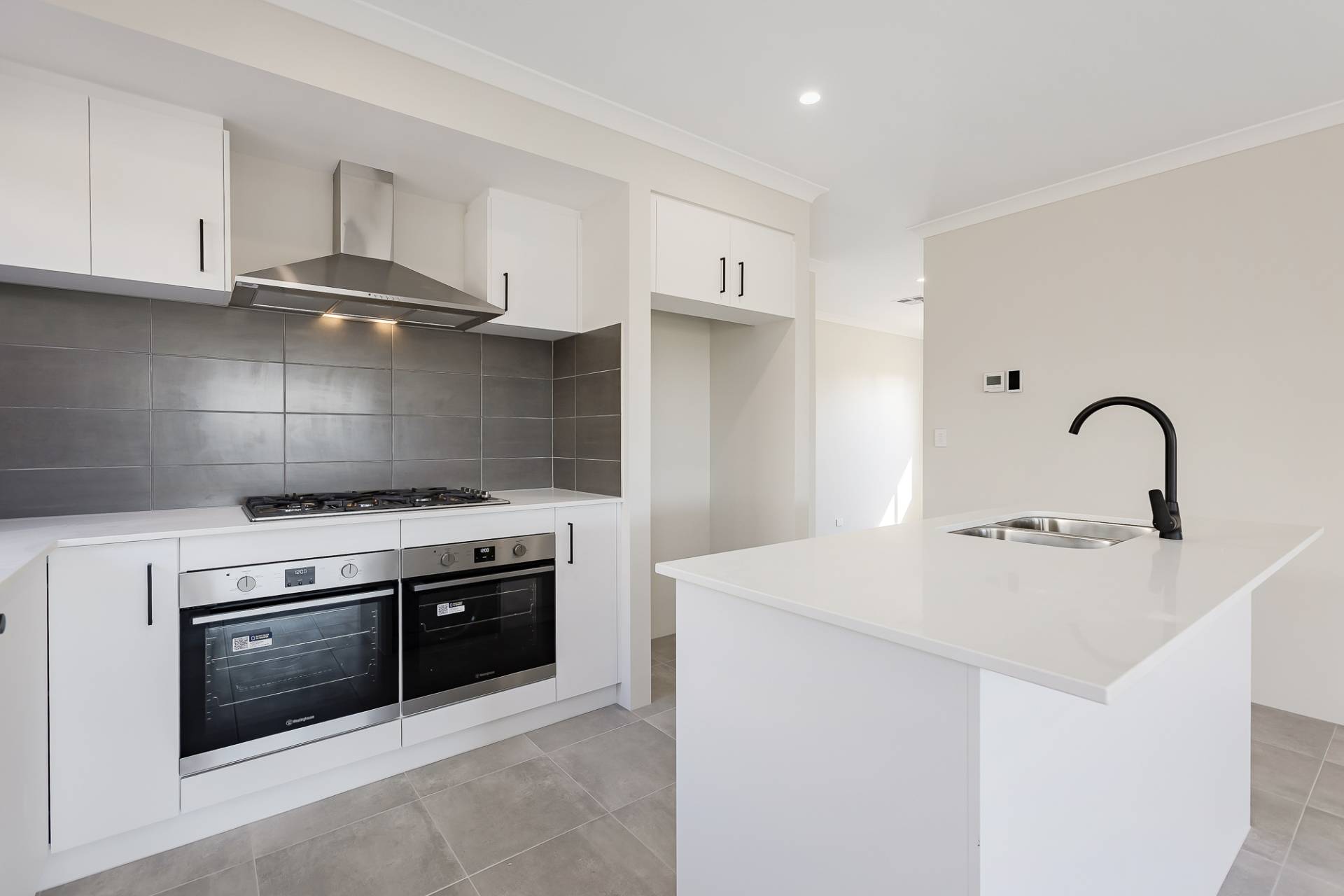 - Contemporary kitchen featuring stone benchtops, sleek white cabinetry, 900mm gas cooktop, double ovens, fridge recess, pantry, breakfast bar, and dishwasher