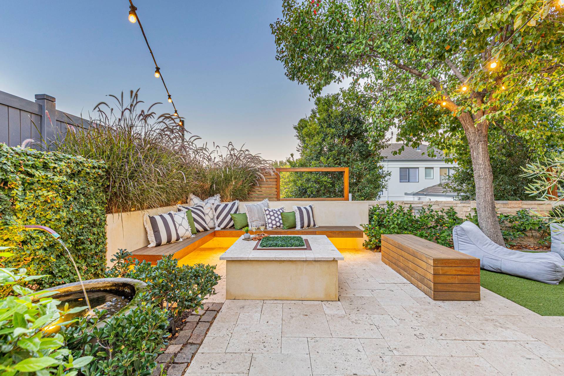 • Front private courtyard with travertine paving, water feature, fire pit and built in bench