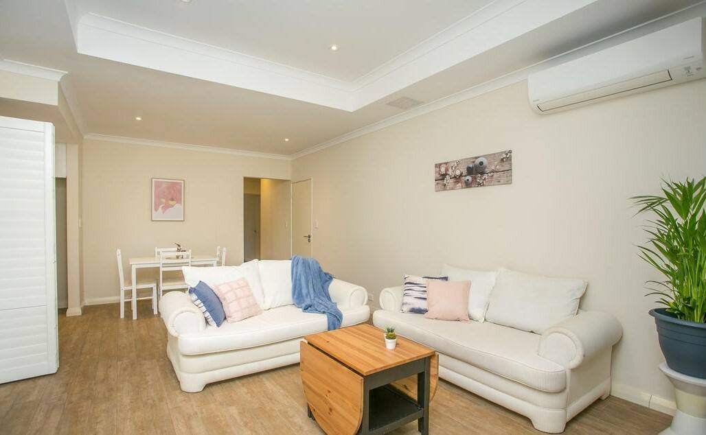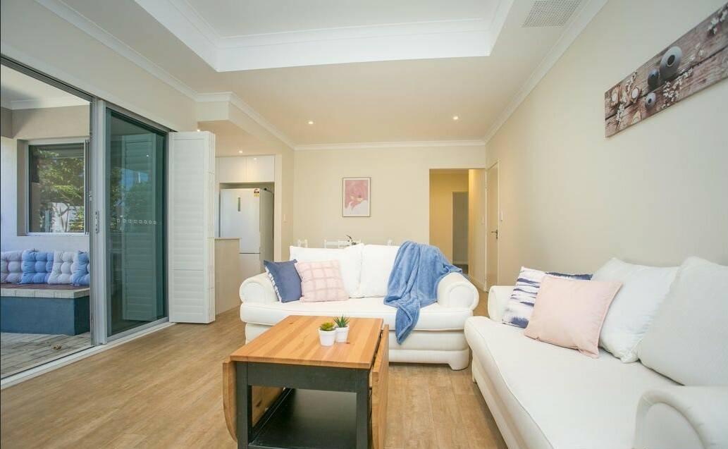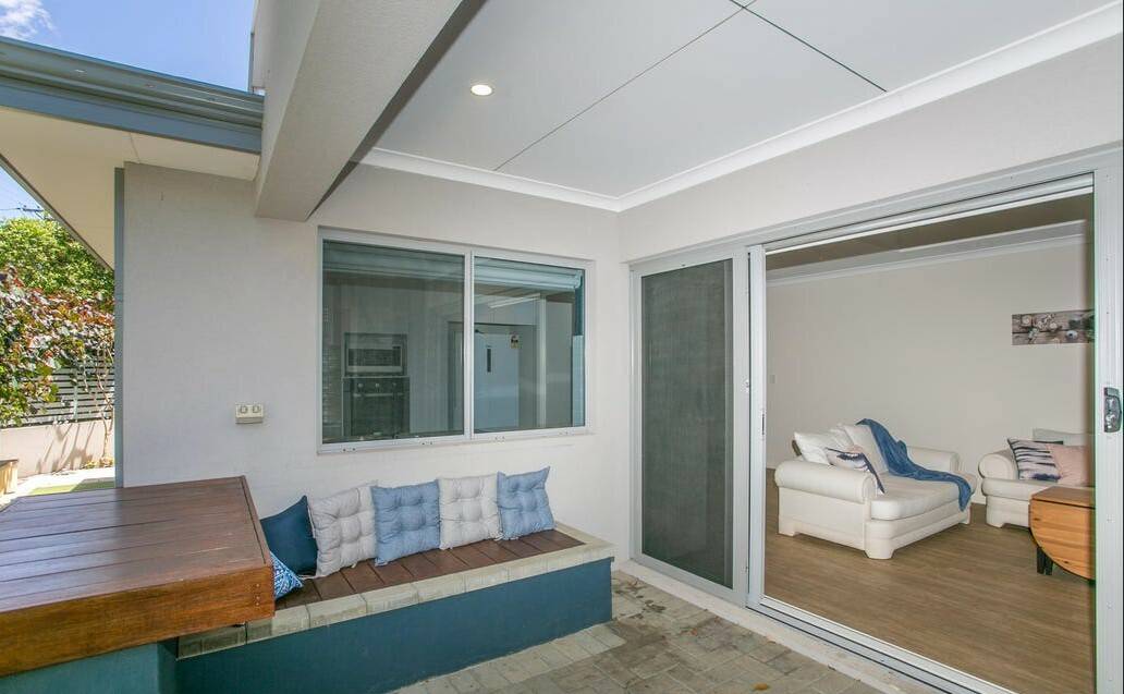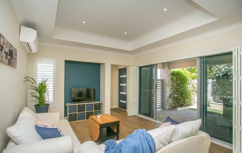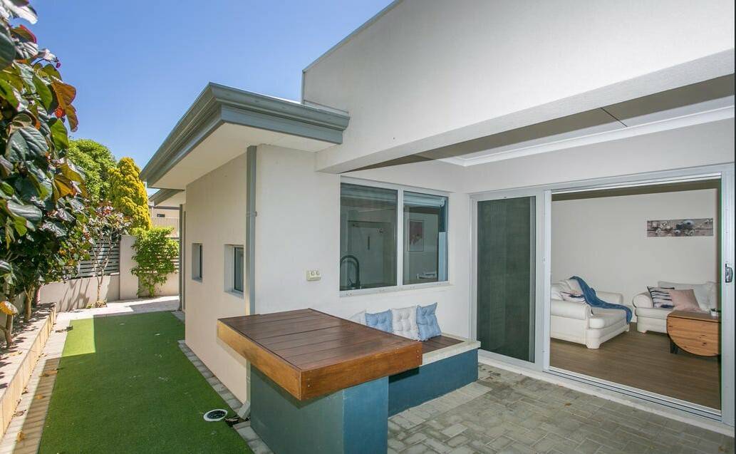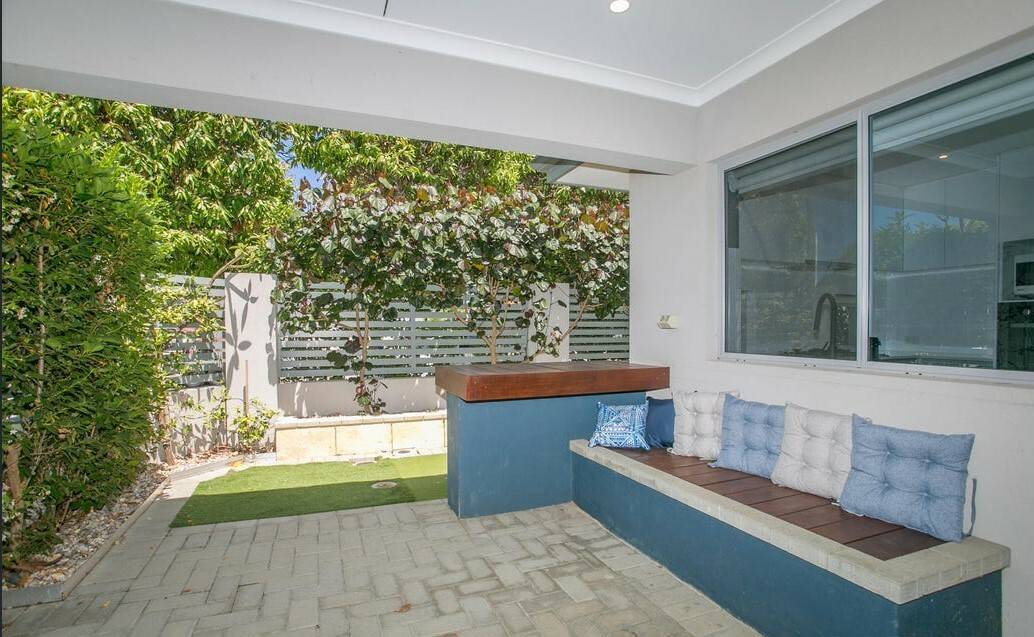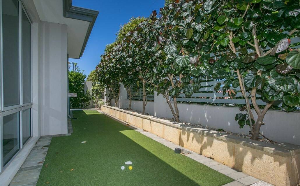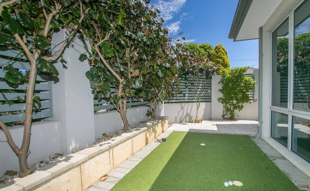 • Northerly-facing living area with large sliding doors opening to a fully enclosed front courtyard – enjoy built-in garden bench seating, serving table, established garden beds, synthetic turf and even your own mini putting green!