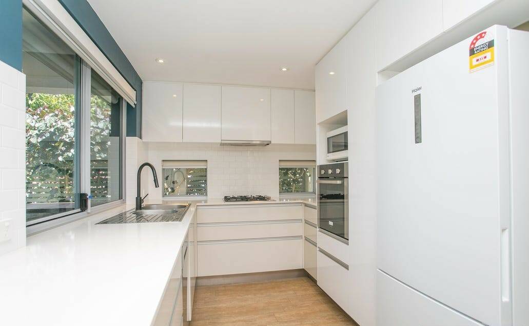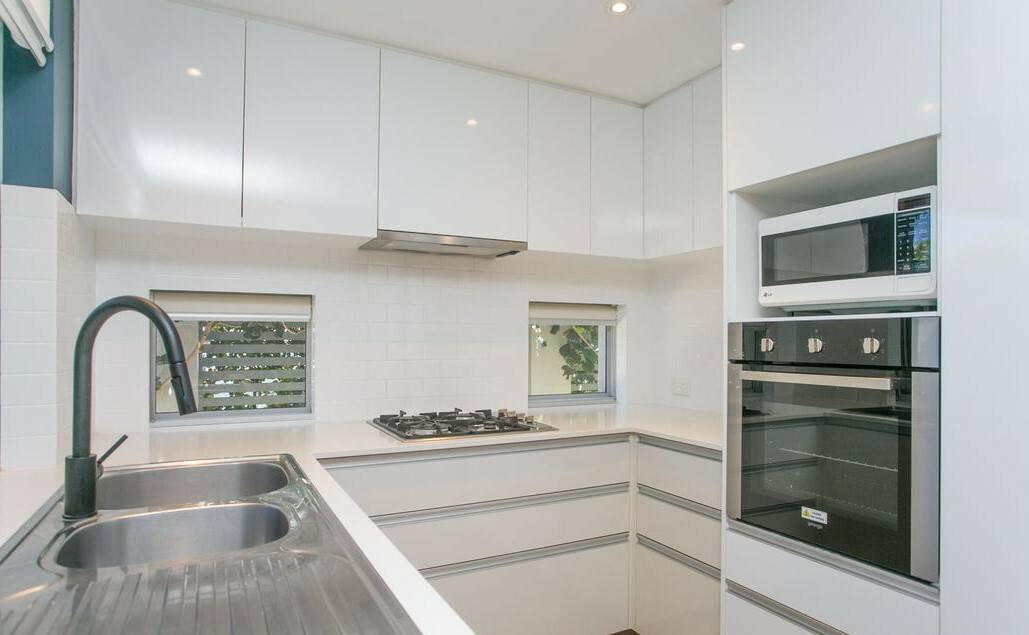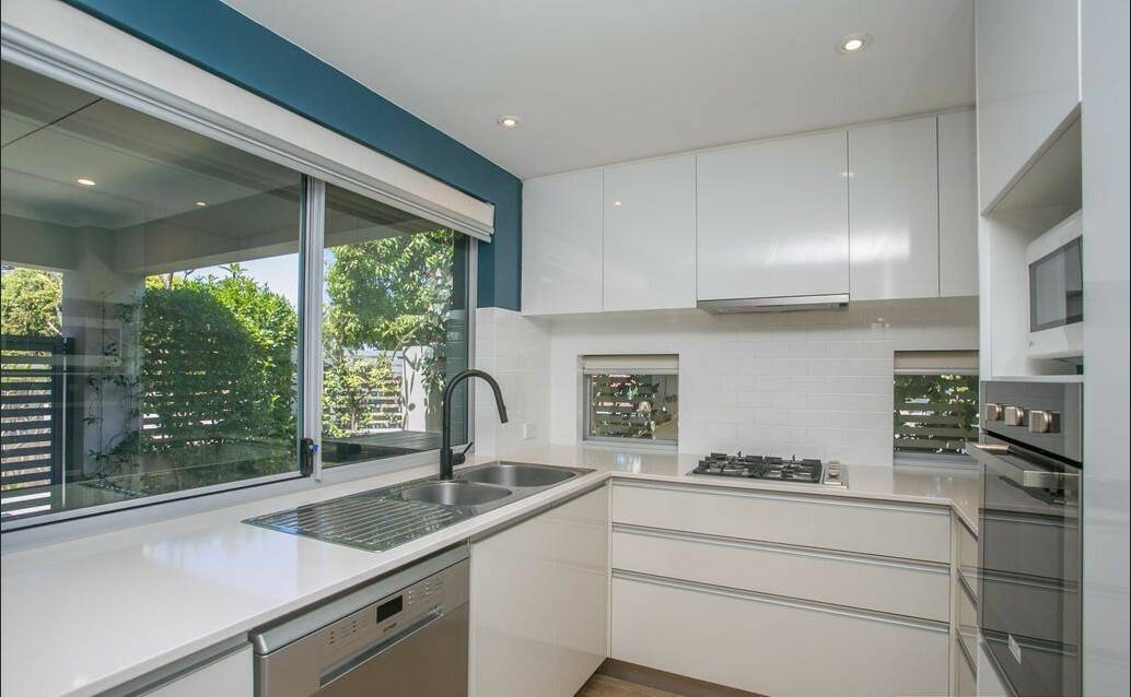 • Modern kitchen with stone benchtops, gas cooktop, dishwasher, microwave recess, drop ceiling feature and neutral tones